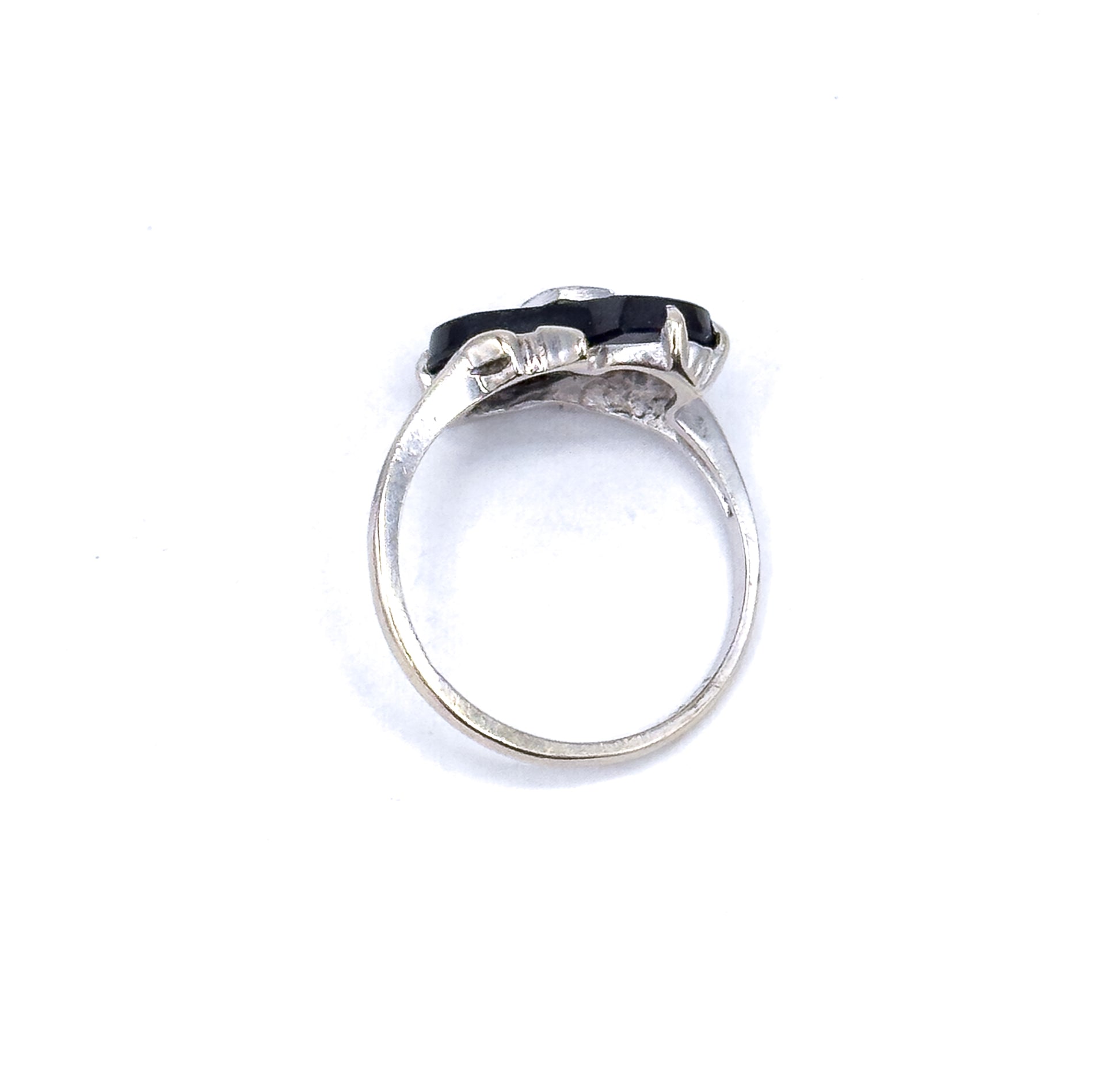 A sleek vintage ring featuring a striking bowtie-shaped black onyx accented with a sparkling diamond. Set in crisp 10K white gold, this ring has an elegant Art Deco-inspired feel with its geometric lines and high-contrast design. The elongated onyx sits close to the finger for comfortable everyday wear, while the diamond adds just the right touch of sparkle. A sophisticated choice for someone who loves bold, graphic jewelry.