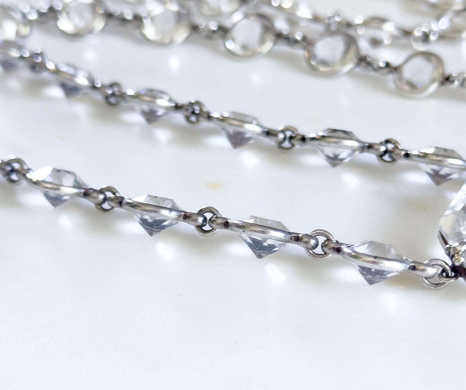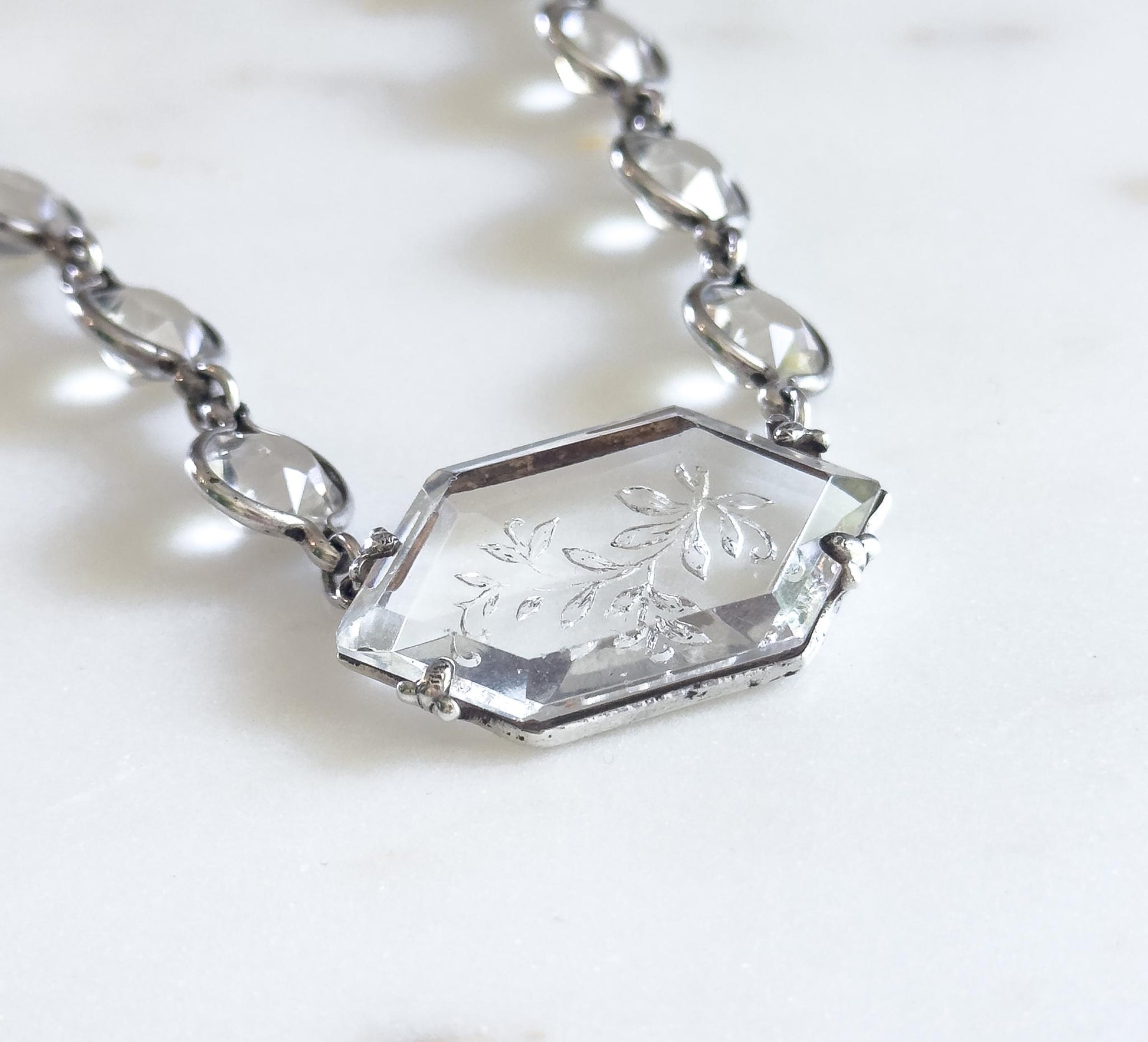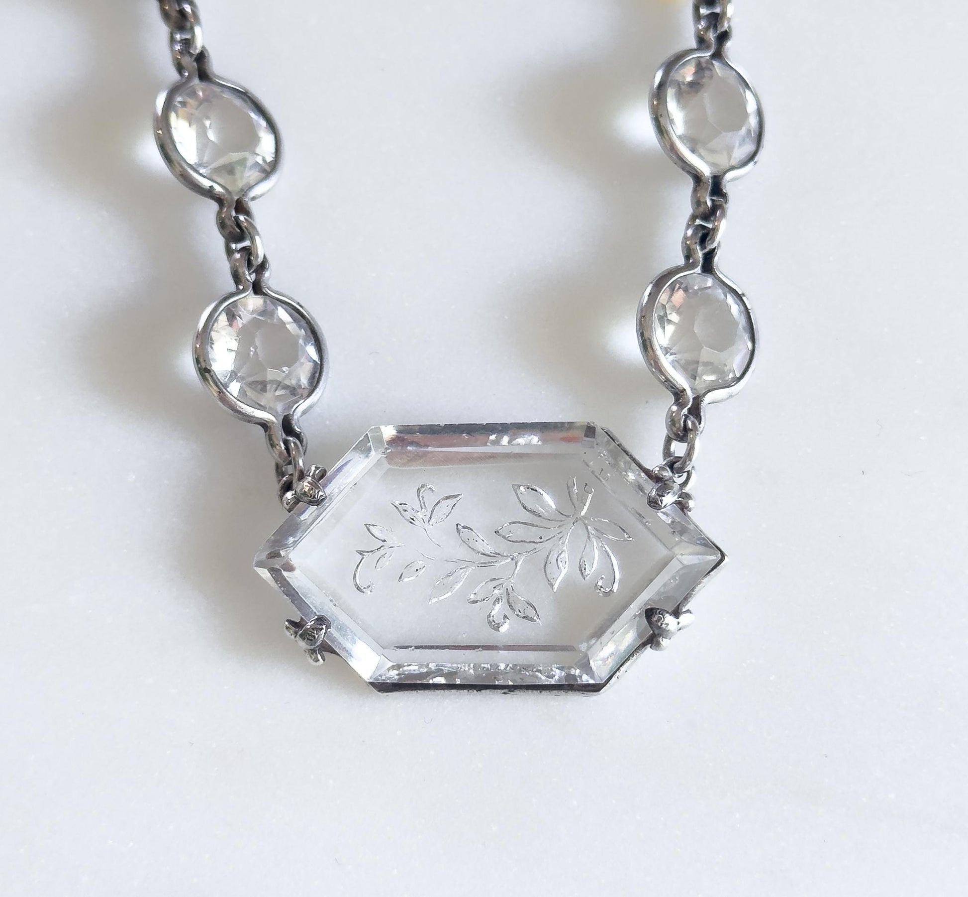 Glamorous and rare, this authentic 1920-30s Art Deco necklace features open-back, hand-cut crystal glass stones linked in a continuous, glittering strand. At center is a striking hexagonal plaque etched with a delicate floral motif, secured in a prong setting. This long flapper-length piece embodies classic Art Deco elegance with its clean geometry and sparkling clarity. The glass stones are set in silver bezels settings, however the clasp has been replaced at some point. This gorgeous Art Deco Era necklace will be at home in any vintage jewelry collection.