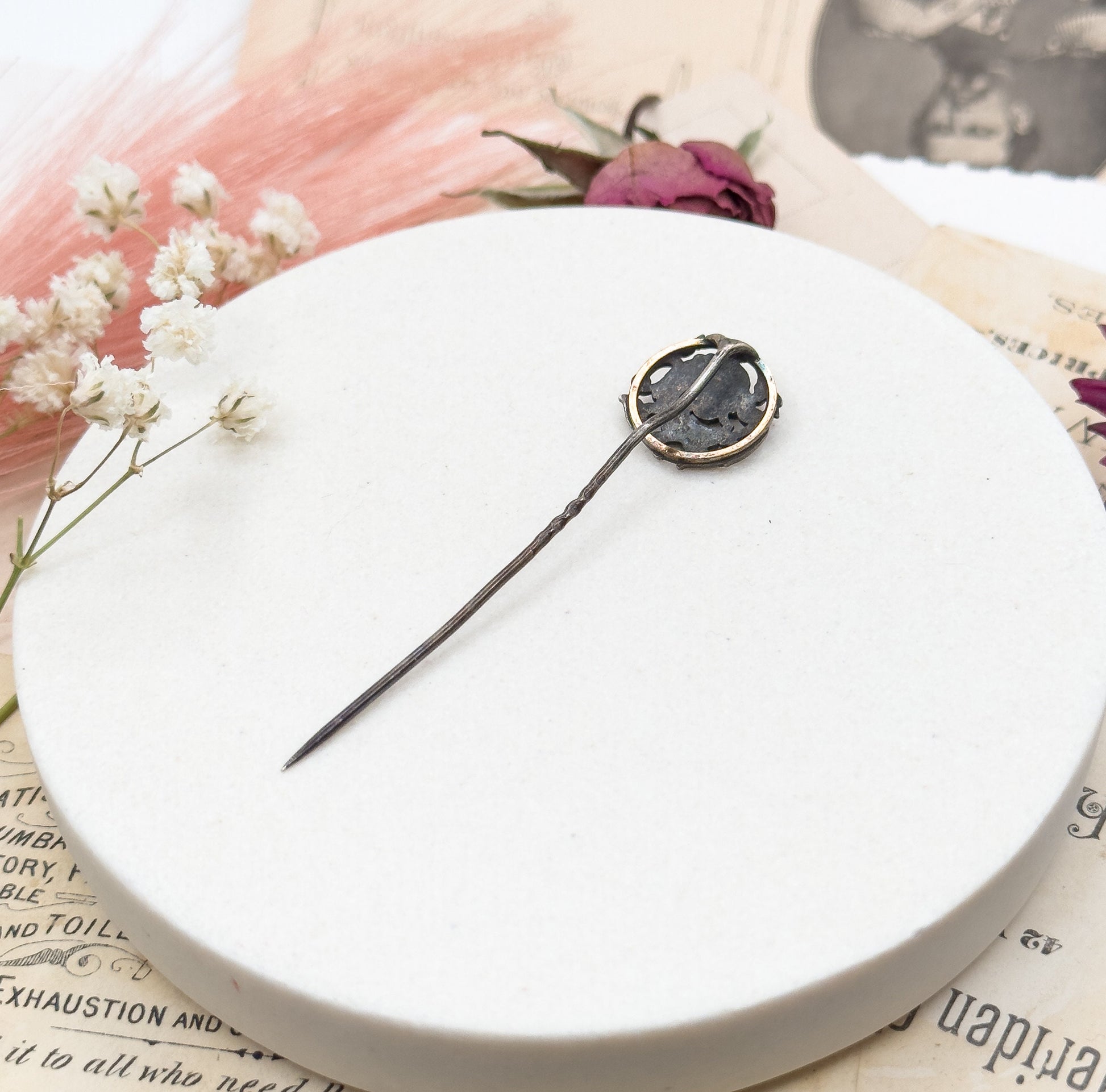 Here is a highly collectible Antique Silver French stickpin featuring a mythical creature. The head of the pin features a magnificent griffin or dragon, possibly a stylized lioness in an Art Nouveau style. The head of the creature is emerging from a scrolling flower, and the pin has beautiful organic openwork details. The head of the pin has a gold wash over a silver base that has worn with age. The pin is hallmarked with the French boars head and a makers mark. This lovely little piece of history would make an excellent addition to any antique jewelry collection.