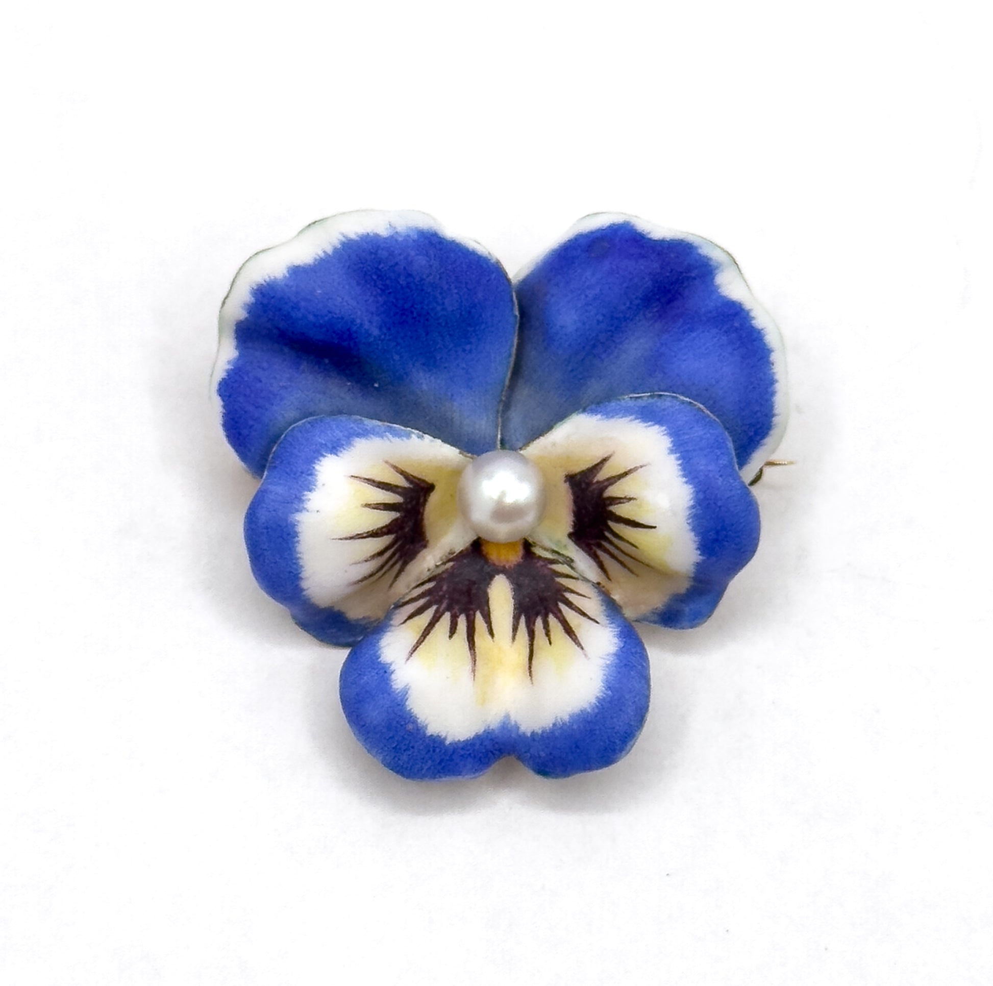A vibrant turn-of-the century enamel pansy brooch, showcasing vivid matte (almost purple)blue and soft yellow petals finished with a luminous pearl center. This beautifully crafted Edwardian flower sits in 14K gold with a lovely, time-earned patina. The pansy motif was especially beloved in the late Victorian and Edwardian eras, symbolizing pensée—the French word for “thought”—and given as a token meaning “think of me.” Enamel pansy jewels were popular sentimental gifts. This substantial brooch will make a lovely addition to any antique jewelry collection.