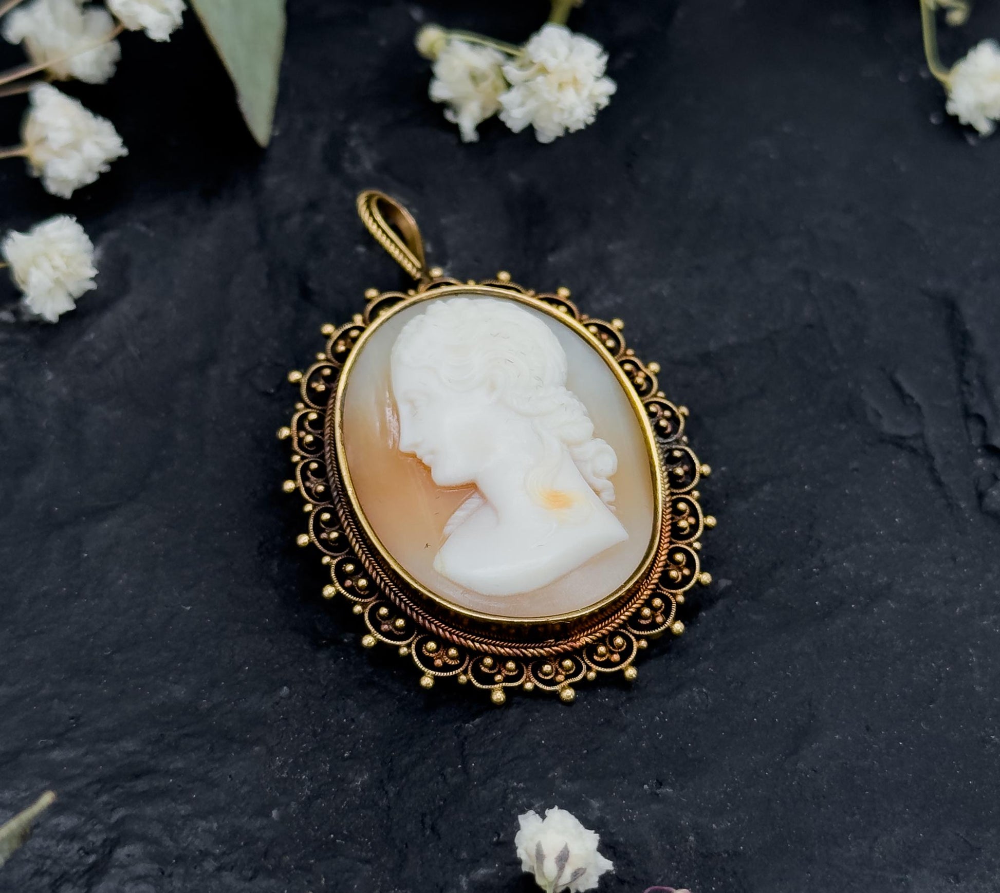 A lovely hand‑carved shell cameo featuring a left‑facing woman in profile. The shell has a lovely soft pastel orange/cream hue. Her neoclassical styling evokes a goddess, with graceful hair details and serene expression. Her hair is beautifully carved with twisting tendrils, reminiscent of classical paintings. The cameo is framed in rich 14k gold with delicate boule and rope‑twist work around the border. It has both a bail to wear as a pendant and a pin fitting to wear as a brooch, offering versatile styling. This lovely heirloom quality cameo pendant/brooch will be at home in any jewelry collection.