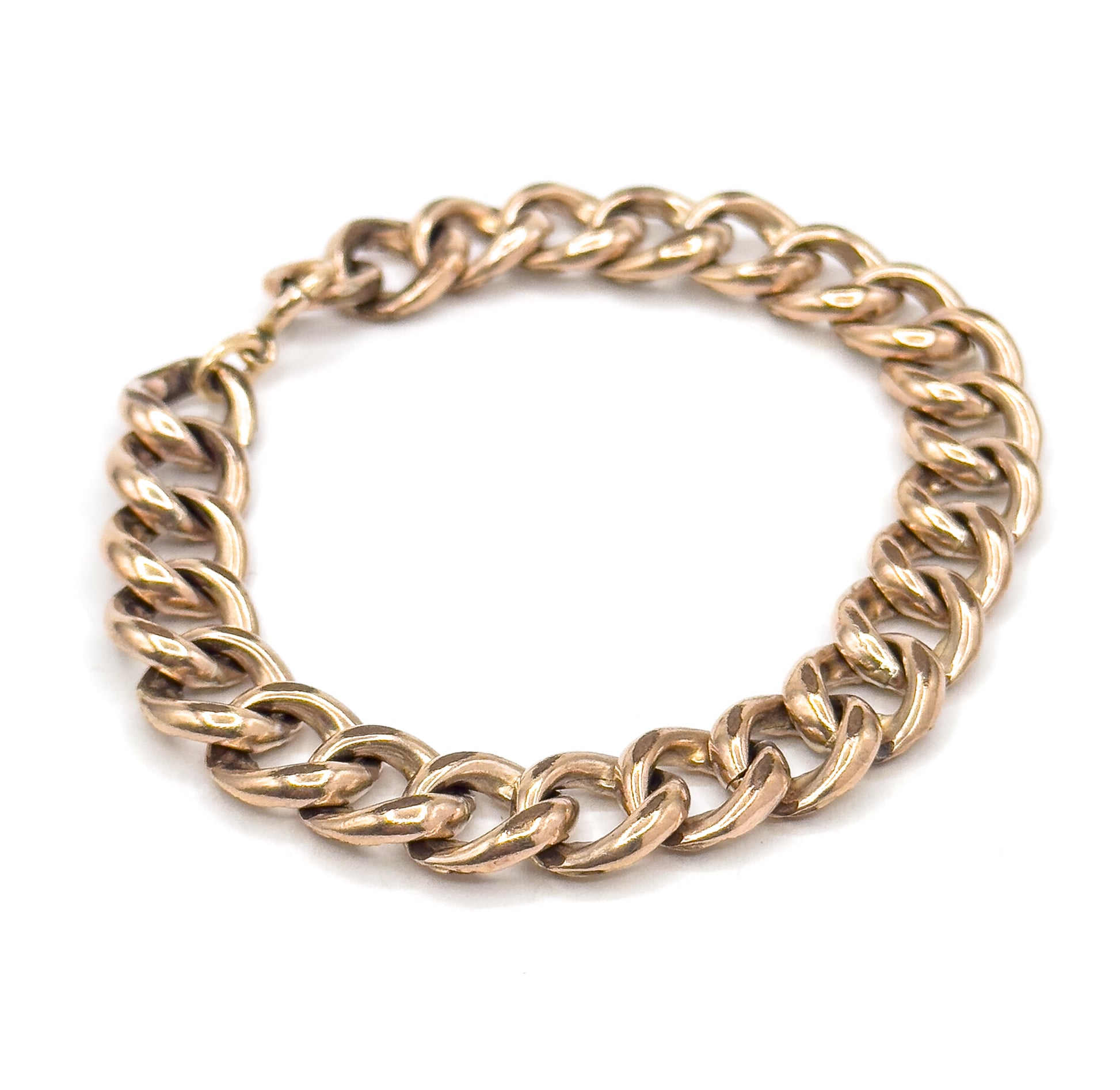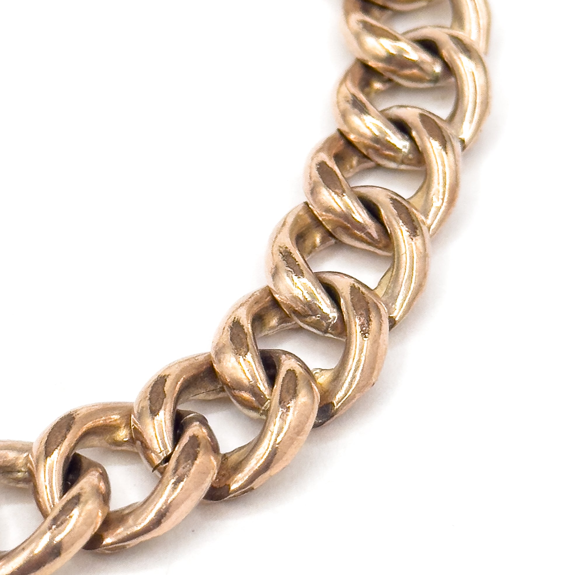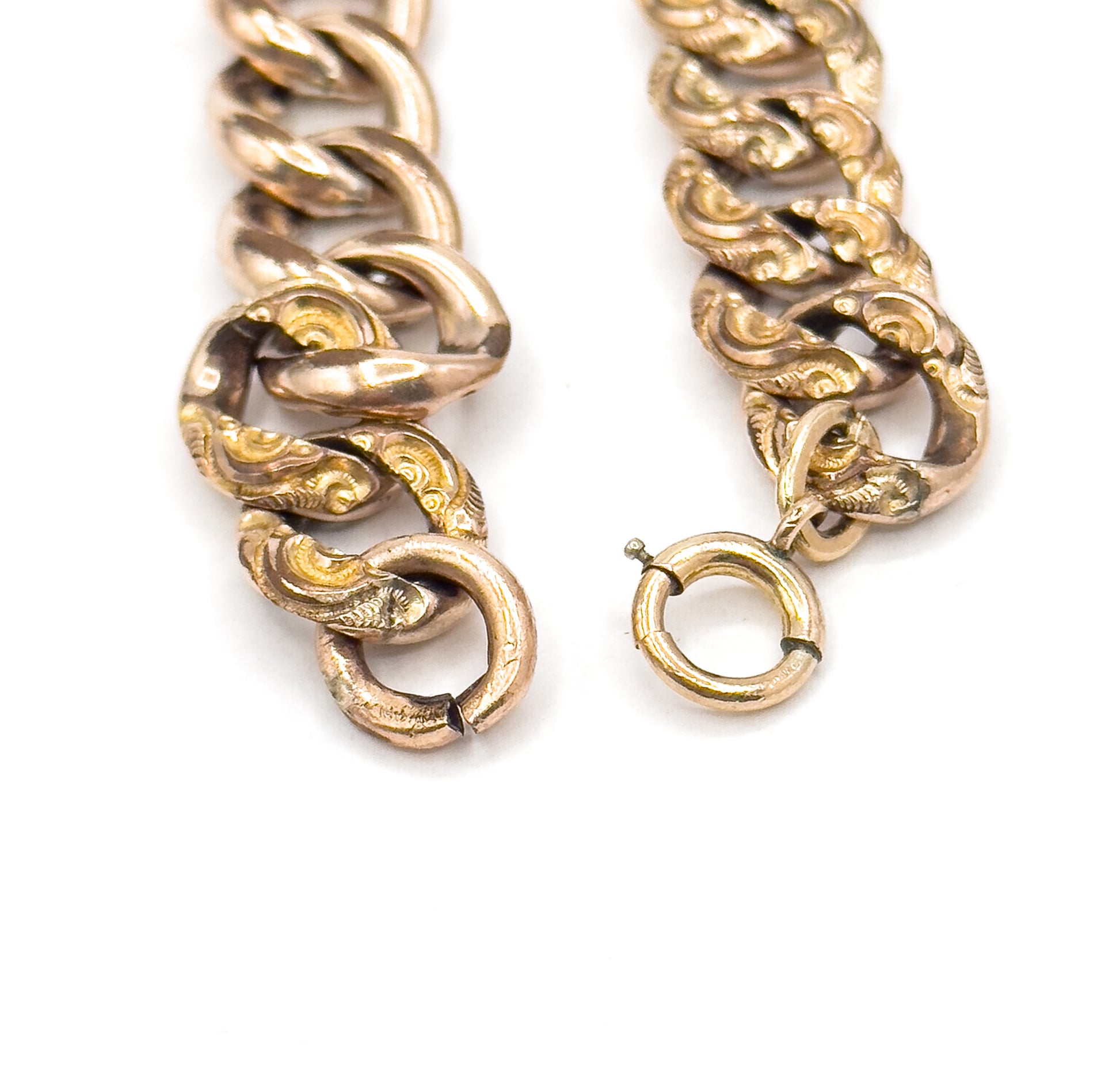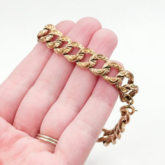 A beautifully detailed Antique chased curb link bracelet with nice chunky links: Each link is detailed with deep, crisp ornate scrollwork designs, creating a rich texture and depth that catch the light beautifully. A great older piece with charming patina - this bracelet is gold filled, meaning there is a thick layer of gold over a base metal. This antique bracelet looks great worn on its own, but it also adds instant texture to a bracelet stack.