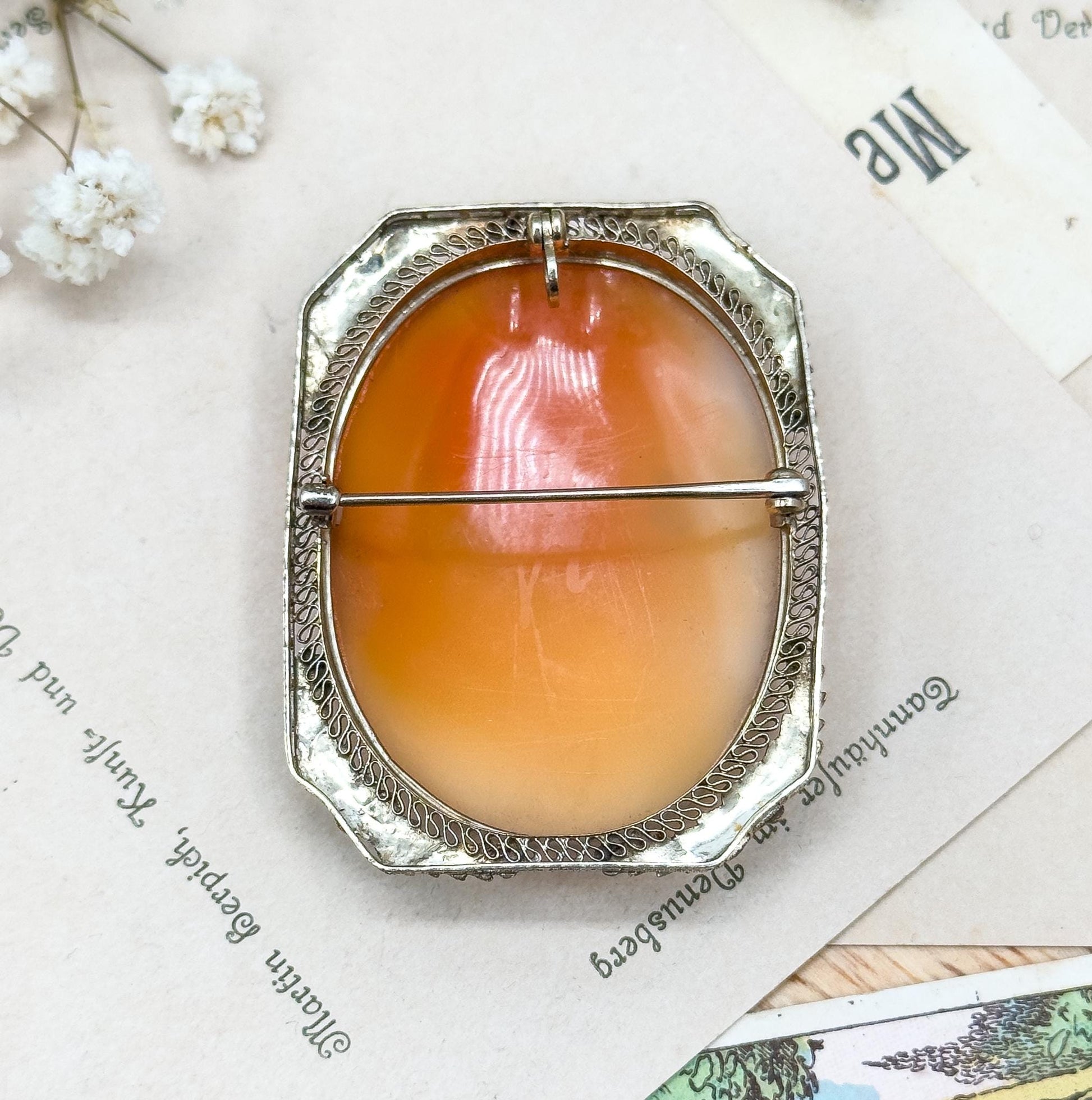 Art Deco Era Shell Cameo Brooch/Pendant in 14K White Gold with Enamel This lovely Antique shell cameo features a beautiful hand carved woman in profile, possibly the Goddess Flora. She has detailed flowers woven through her hair and delicate blooms draped across her gown. Carved in warm peachy toned shell, she is bezel‑set in 14K white gold with ornate filigree details. The border is decorated with hand‑applied floral enamel details and a touch of vibrant green and blue, with some light age‑related wear to the enamel as shown. This piece is fitted with a secure pin and a hidden bale, making it easy to wear as a brooch or pendant. This beautiful cameo will make an excellent addition to any vintage jewelry collection.