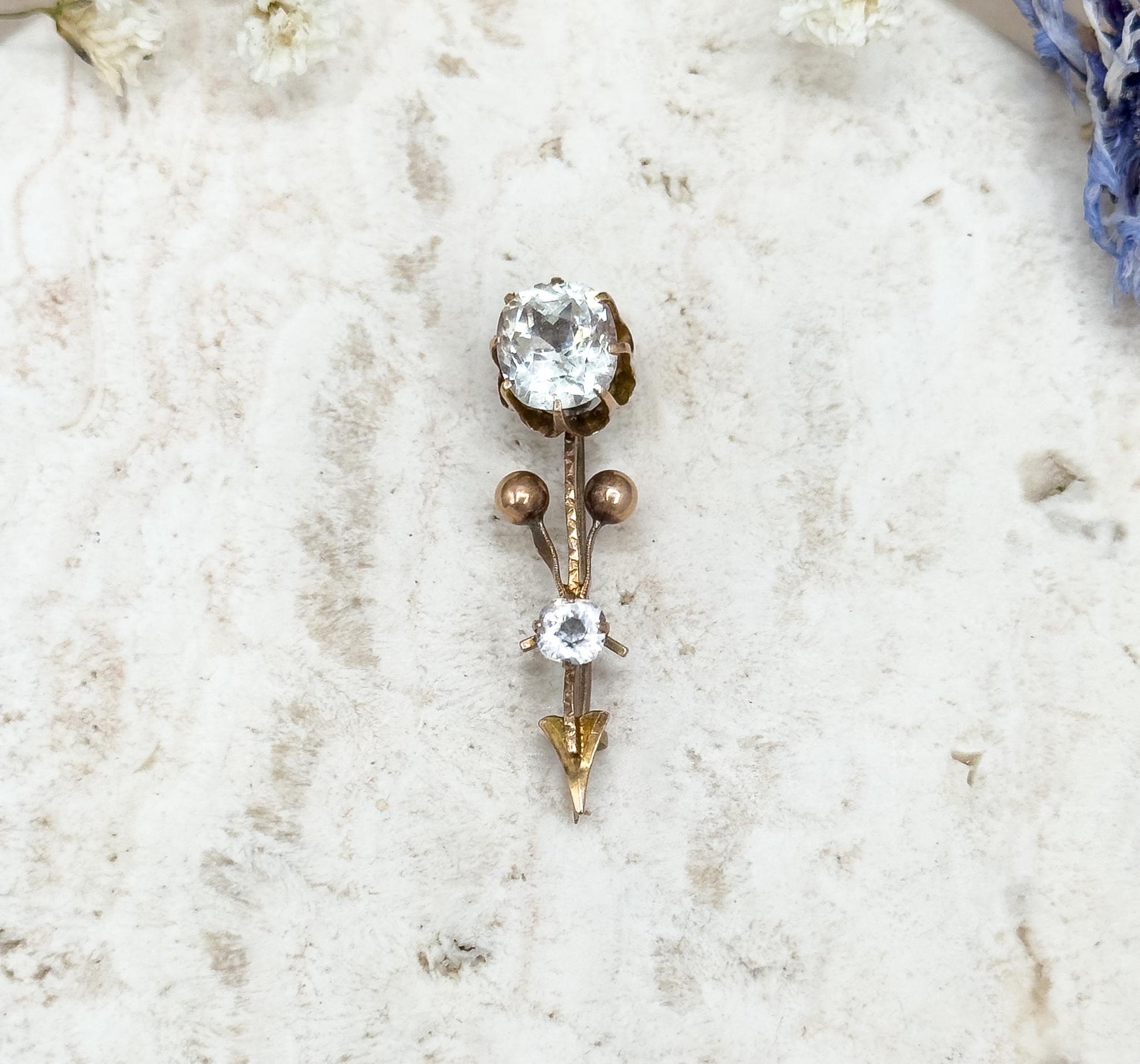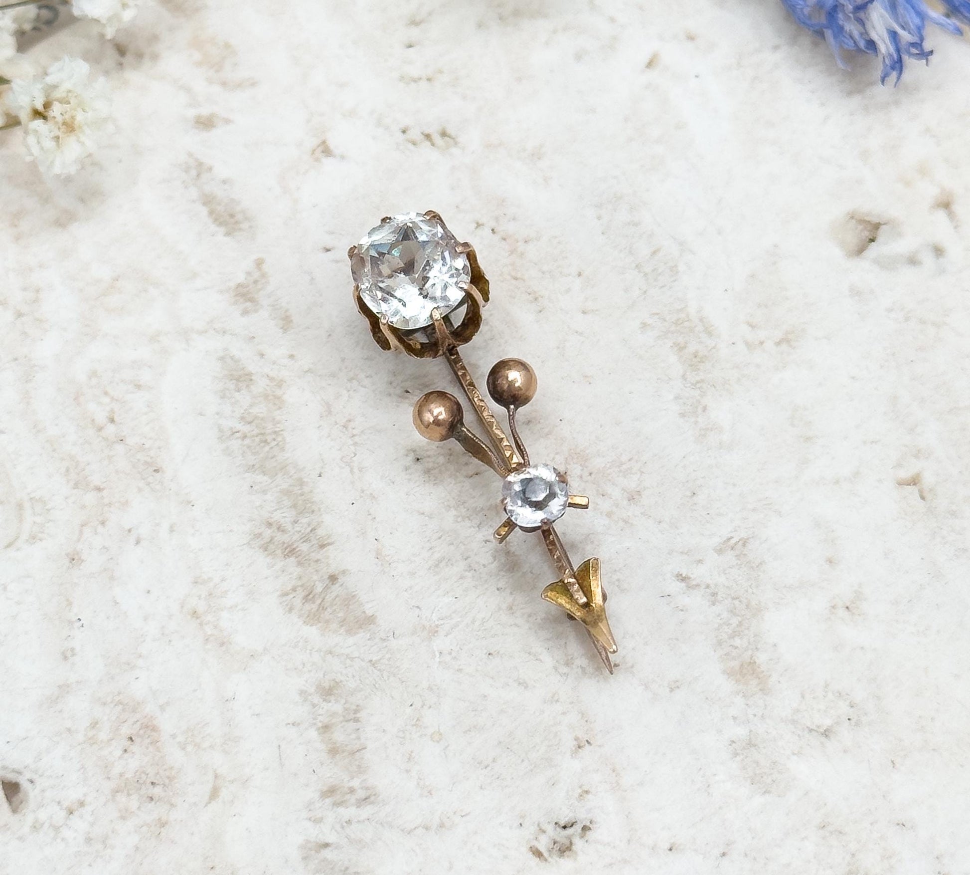CONDITION Lovely antique condition with light, age-appropriate wear. Paste stones are bright and securely set. Patina present on gold adds character.
