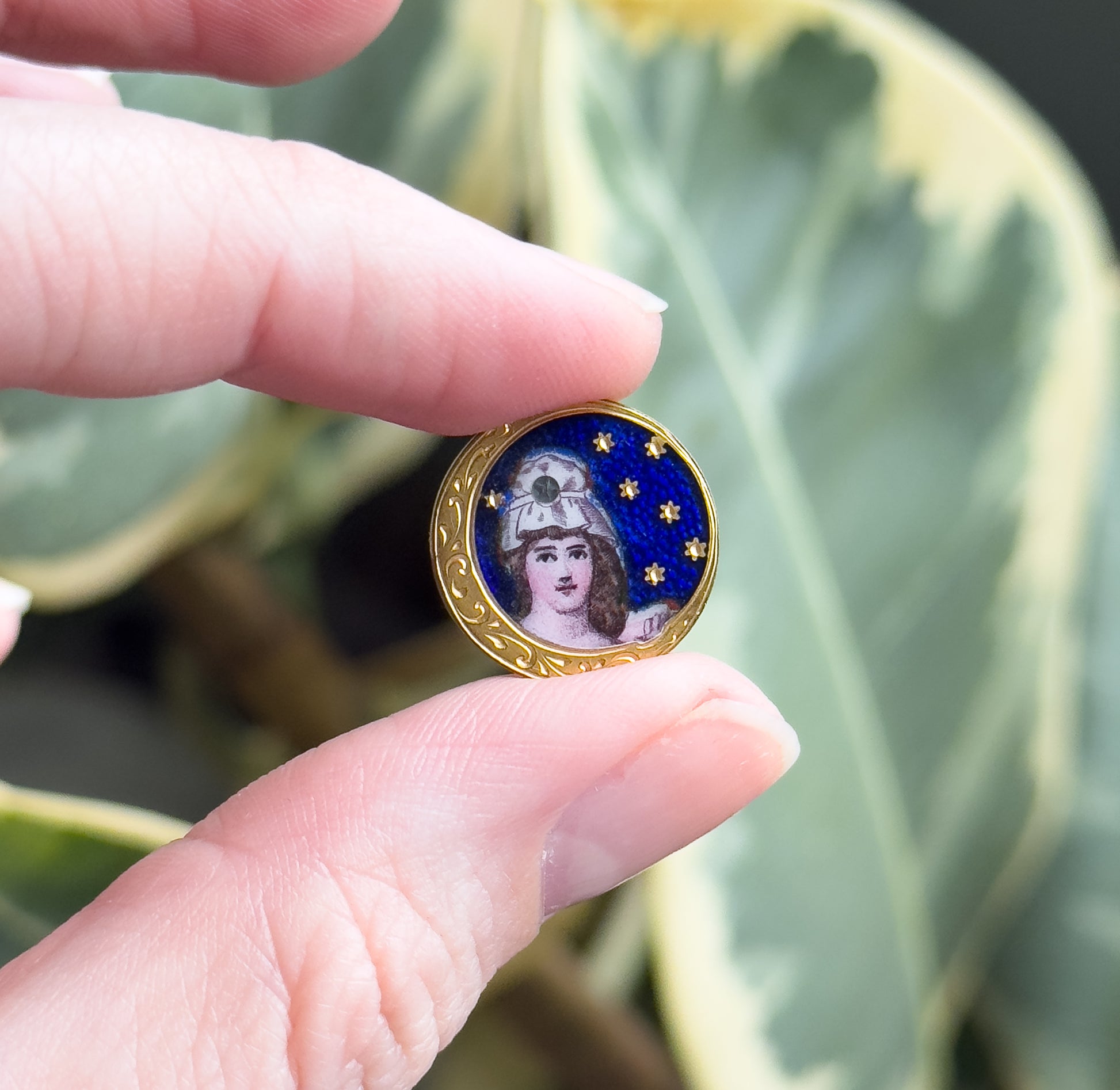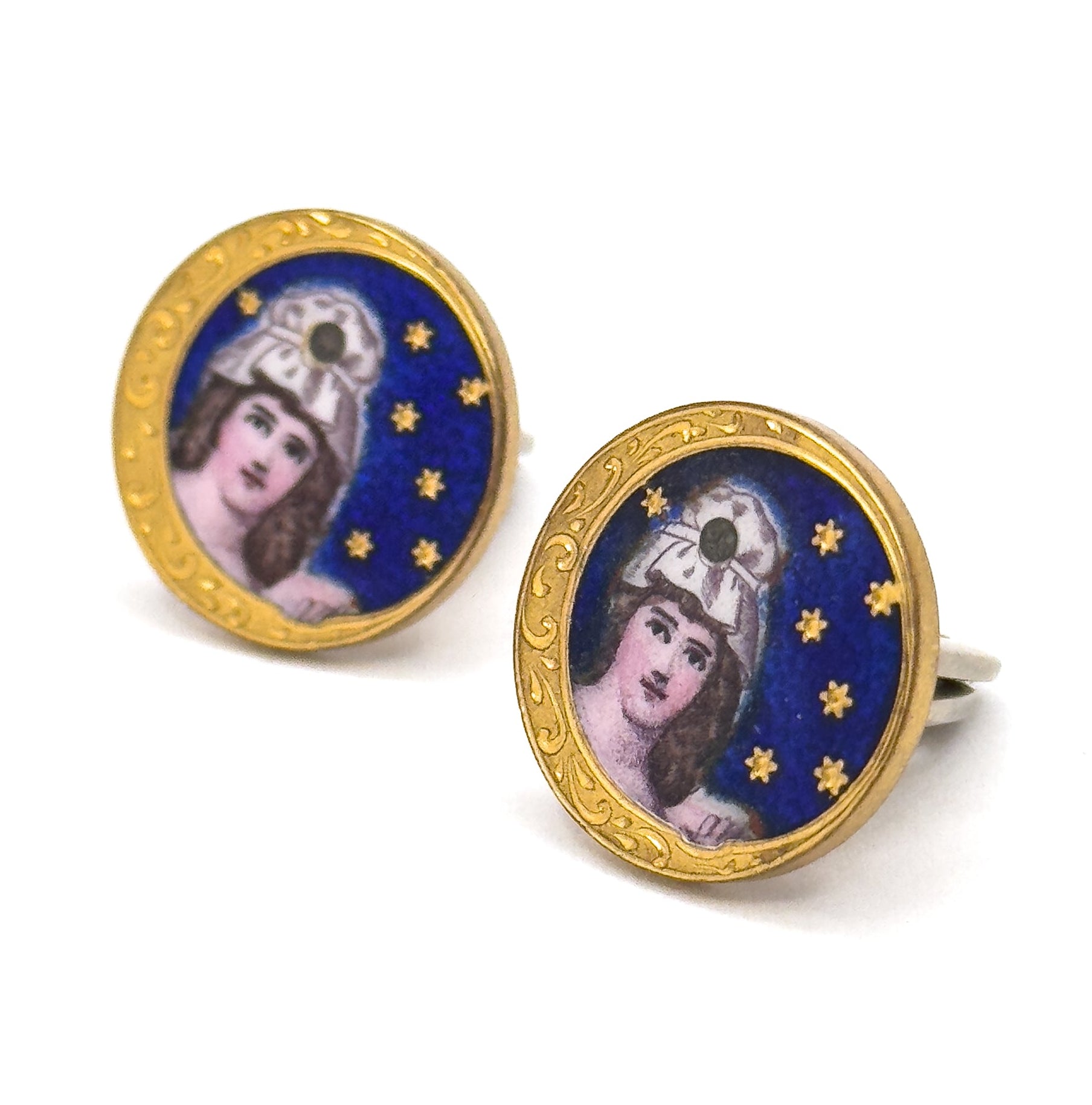 Antique Hand Painted Guilloche Moon Maiden Cufflinks