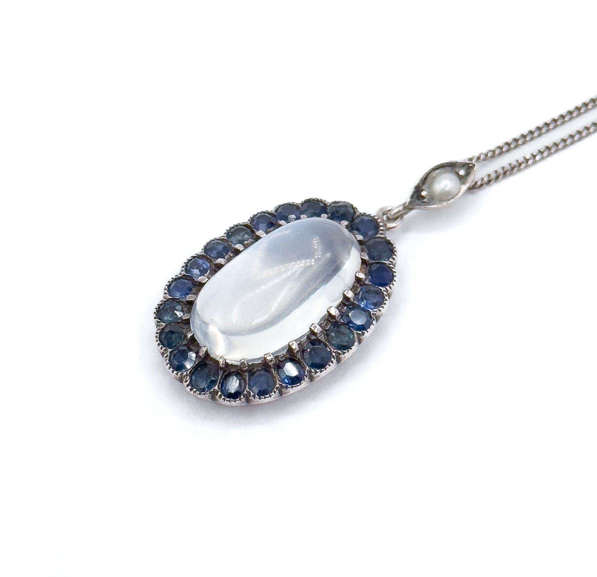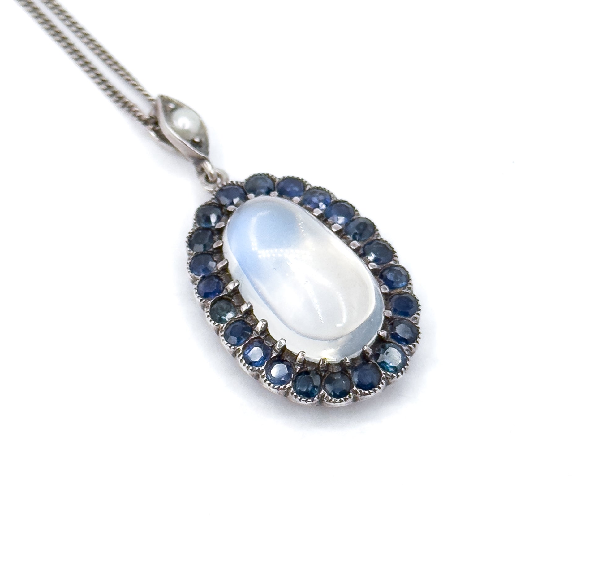 A striking English Late Edwardian / Early Art Deco moonstone and sapphire pendant dangling beautifully on an 18in silver chain. The center moonstone shows that soft, glowing adularescent flashy blue sheen desired in fine stones. The center stone is framed by a halo of deep blue sapphires—both natural and created—set in sterling silver with lovely milgrain texture. The slightly geometric gallery and the tiny seed pearl in the bail give this pendant charming personality. This lovely piece is ready to wear or collect!