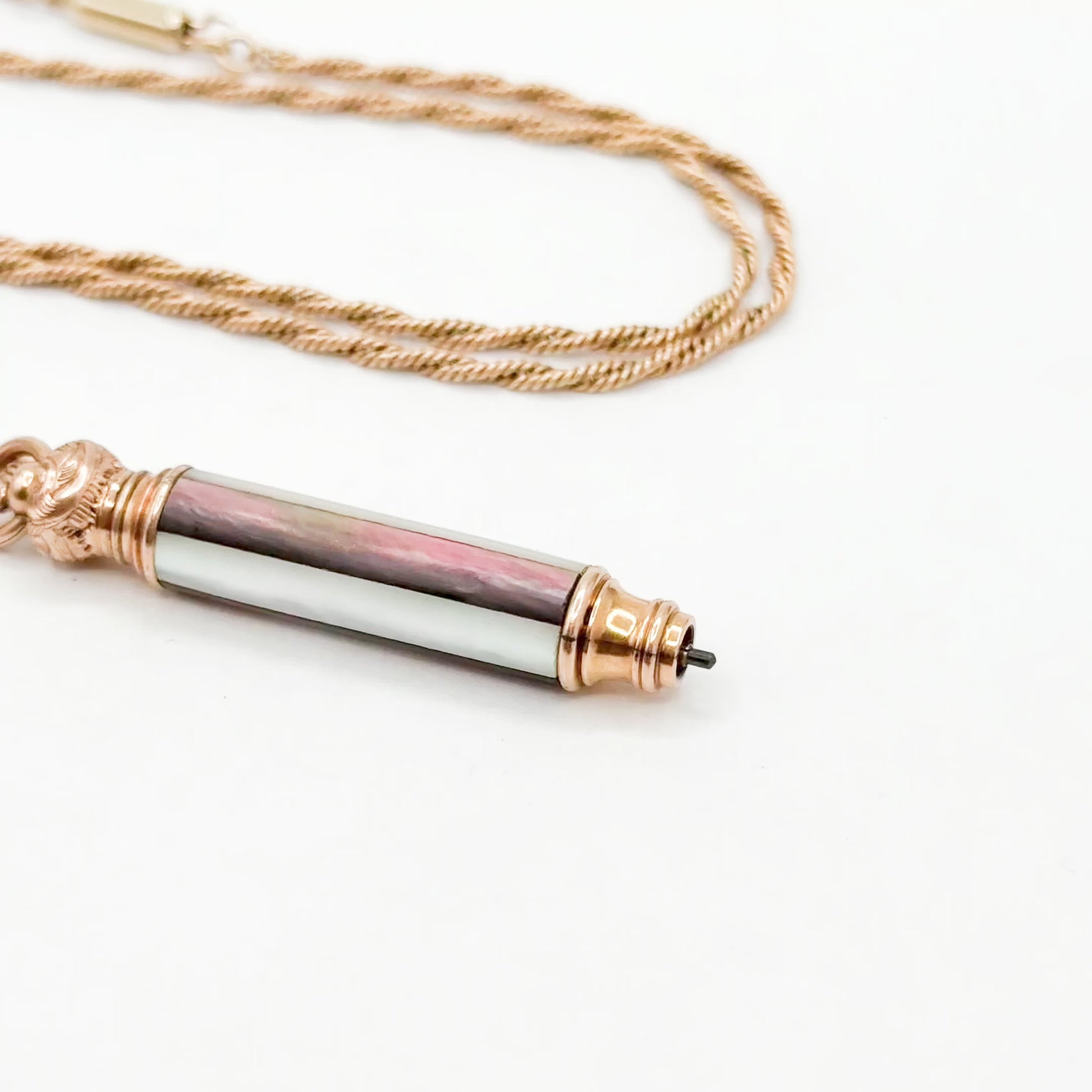 A charming Victorian-era telescopic pencil pendant with alternating panels of iridescent mother of pearl. The pencil is set in warm gold-filled metal with decorative caps on each end and hangs from a vintage twisted gold-tone chain. Originally a functional pencil, now a lovely and wearable piece of antique history. The mechanism does have resistance and this is sold as a lovely antique pendant rather than a usable pencil for writing.