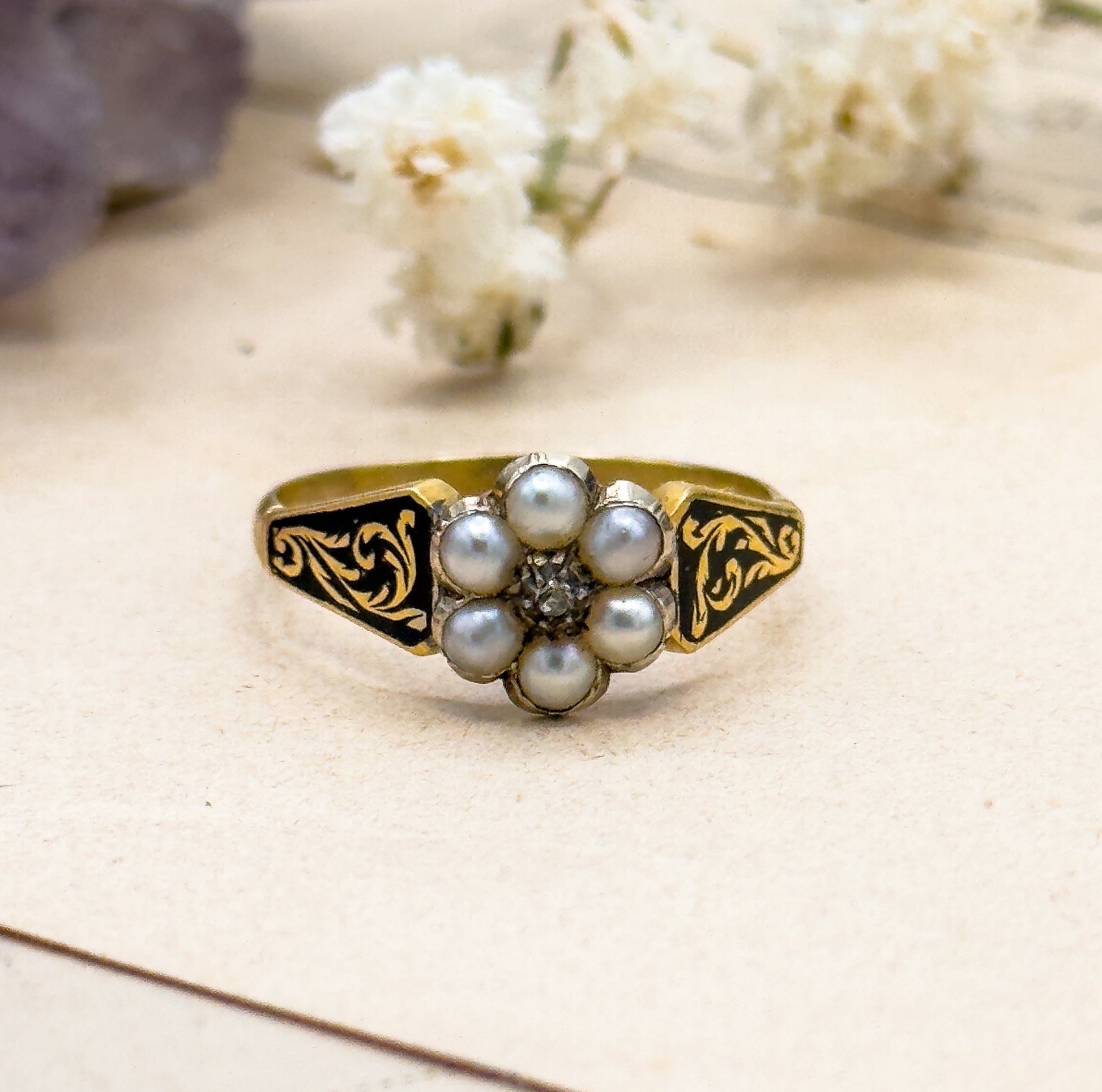 Here is a fantastic and rare antique early Victorian/Late Georgian mourning ring from the early 1800's. The face of the ring features a delicate pearl forget me not flower set masterfully set atop a 14K solid yellow Gold Band. The pearls are bright and lovely, especially for being over 100 years old. The center of the pearl holds a darling antique rose-cut diamond. The shoulders are highlighted with deep black enamel detailing in the form of decorative scrolls. The reverse of the ring holds a tiny glazed locket compartment with a circular beveled glass window containing two tones of hair, carefully intertwined. This beautiful and sentimental antique mourning Ring would make an excellent addition to any antique jewelry collection.
