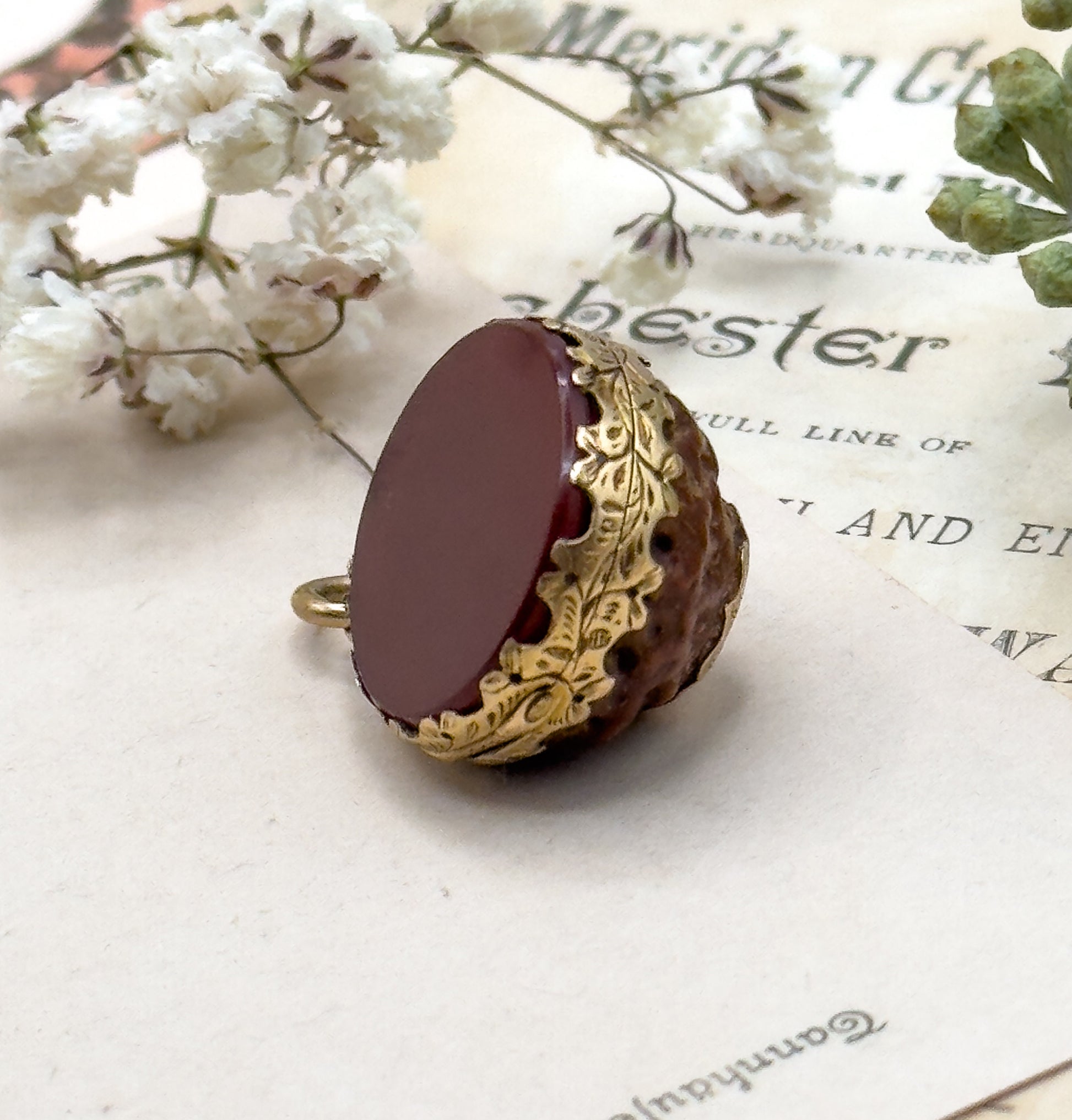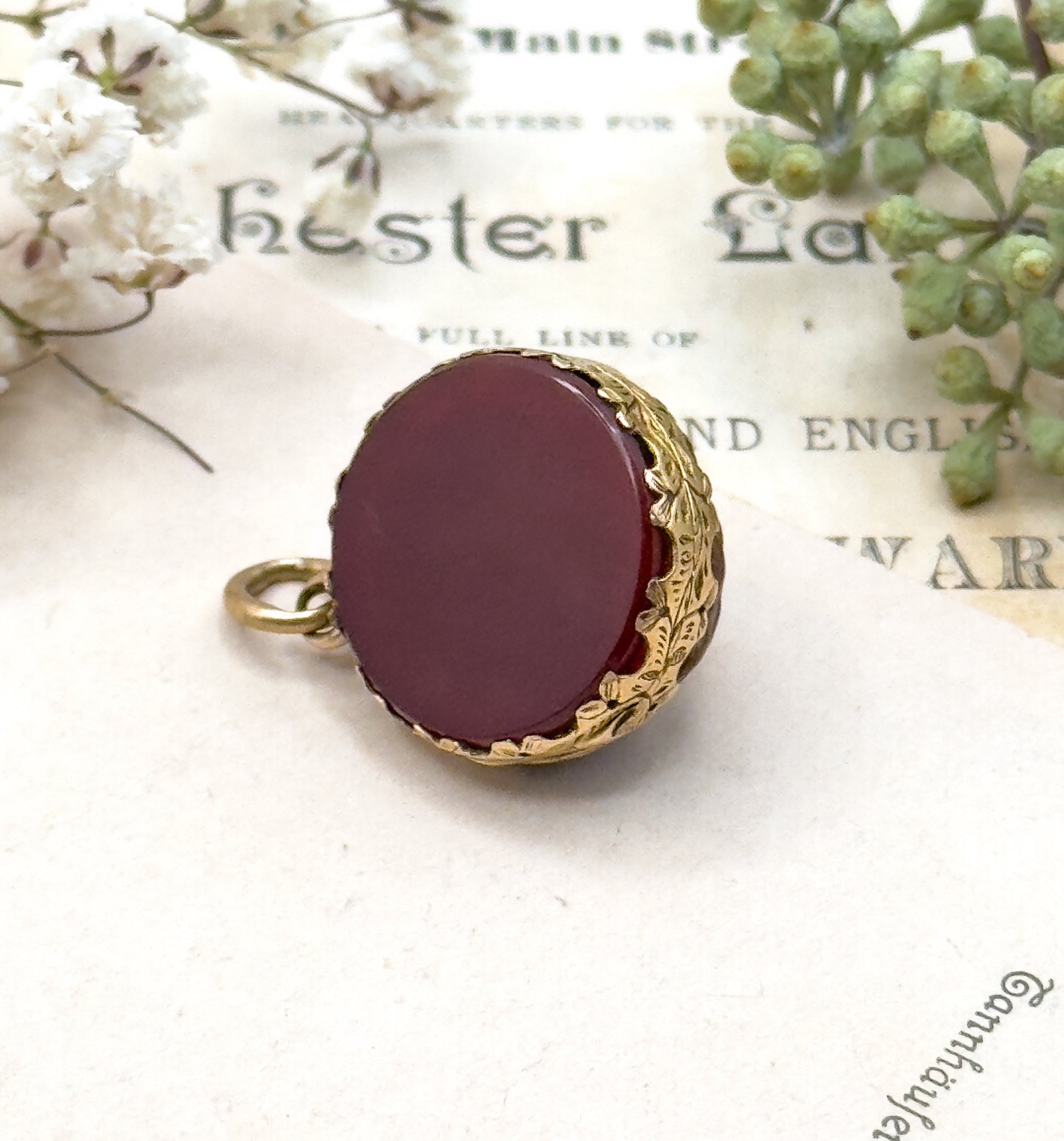 Here is a rare and wonderful Circa 1830s-1850s antique locket made from a Rudraksha Prayer Seed, Carnelian, and 15K Gold. This beautiful little piece of antique sentimental jewelry opens to reveal a compartment, likely for a photo or lock of hair. The carnelian back is a smooth, deep red color, and the nut has a lovely organic texture that contrasts with the warm Gold. The gold has hand-chased details and a beautiful vine pattern. This is a rare example of sentimental jewelry. There is a small age-related crack in the side of the walnut measuring approx 4mm. However, the walnut is secure in its setting. This piece of jewelry has been well cared for and is ready for its next custodian. This little token would make an excellent addition to any collection or display.