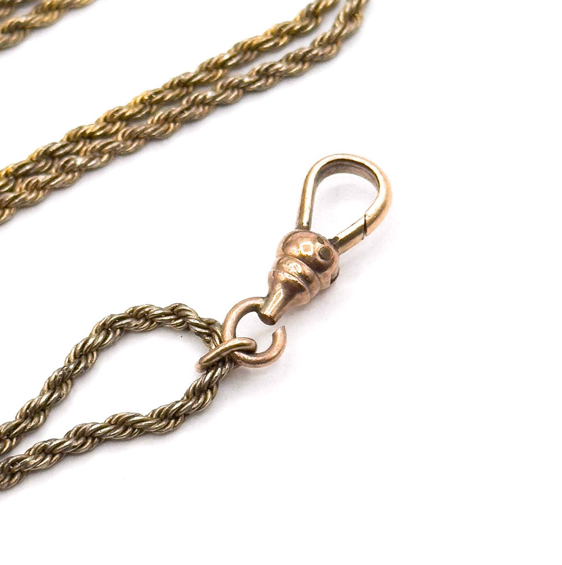 CONDITION Sold as-is with visible age-related wear. Wear throughout chain with gold fill worn through in some areas, and surface wear to slider charm. Despite this, the piece remains a fun antique guard chain at a discounted price, with plenty of character and history.