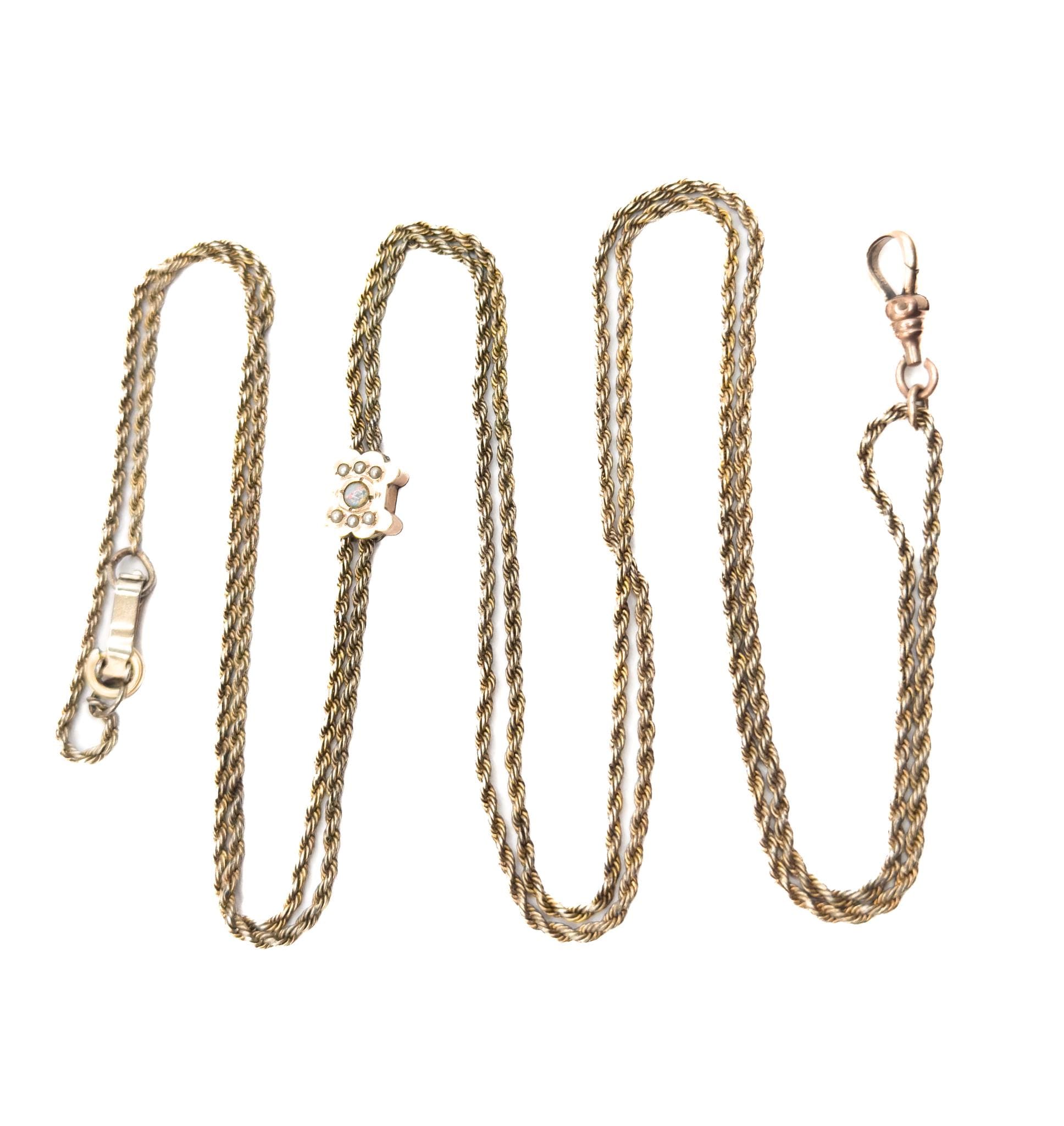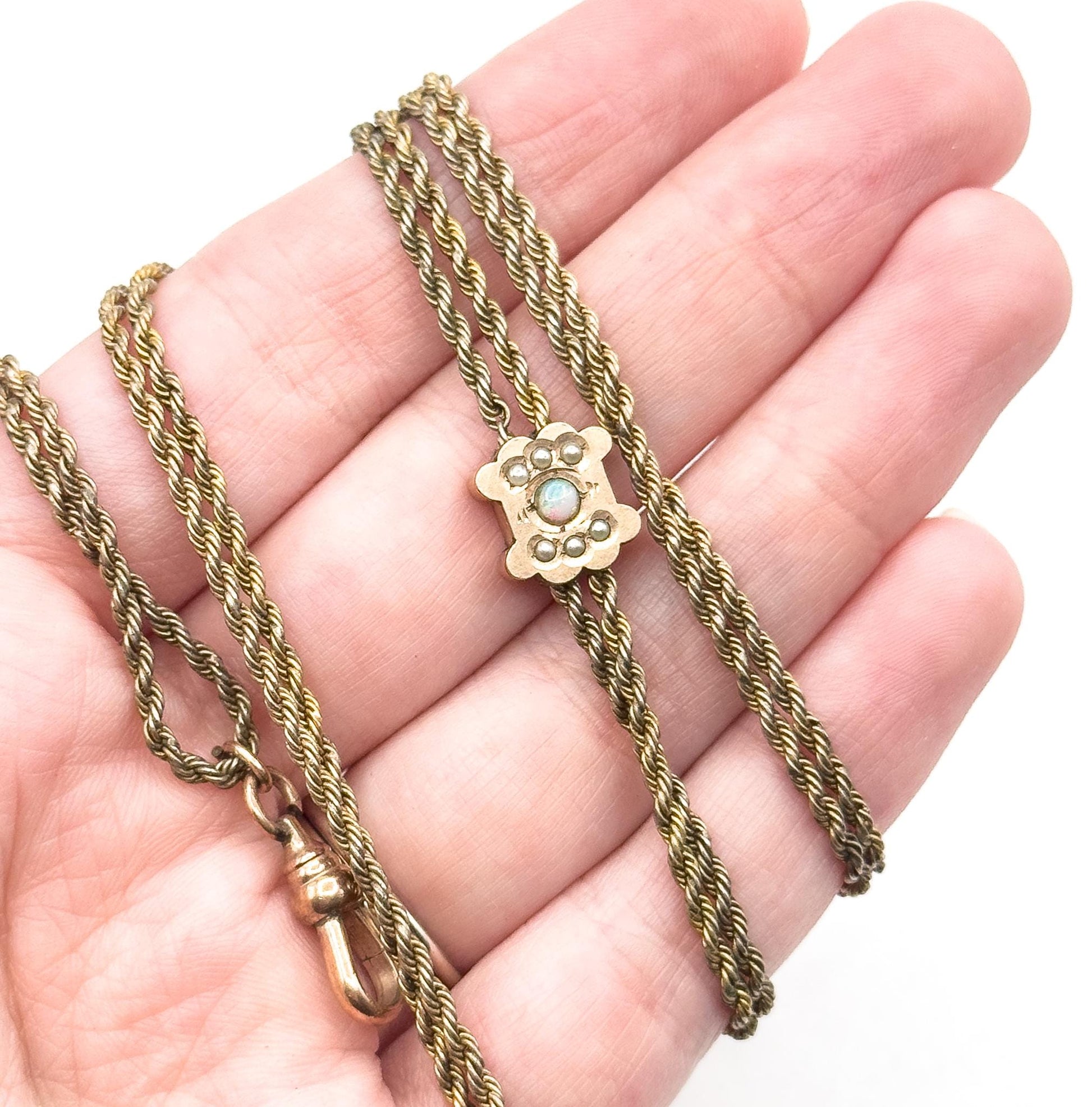 A Victorian long guard chain featuring a charming slide pendant set with a small opal cabochon and six seed pearls. The decorative slide showcases delicate antique detail, the pearls and opal are bright. A classic piece of Victorian jewelry history, perfect for layering or wearing as a pendant chain. This chain is over 100 years old and does have visible age related wear throughout.