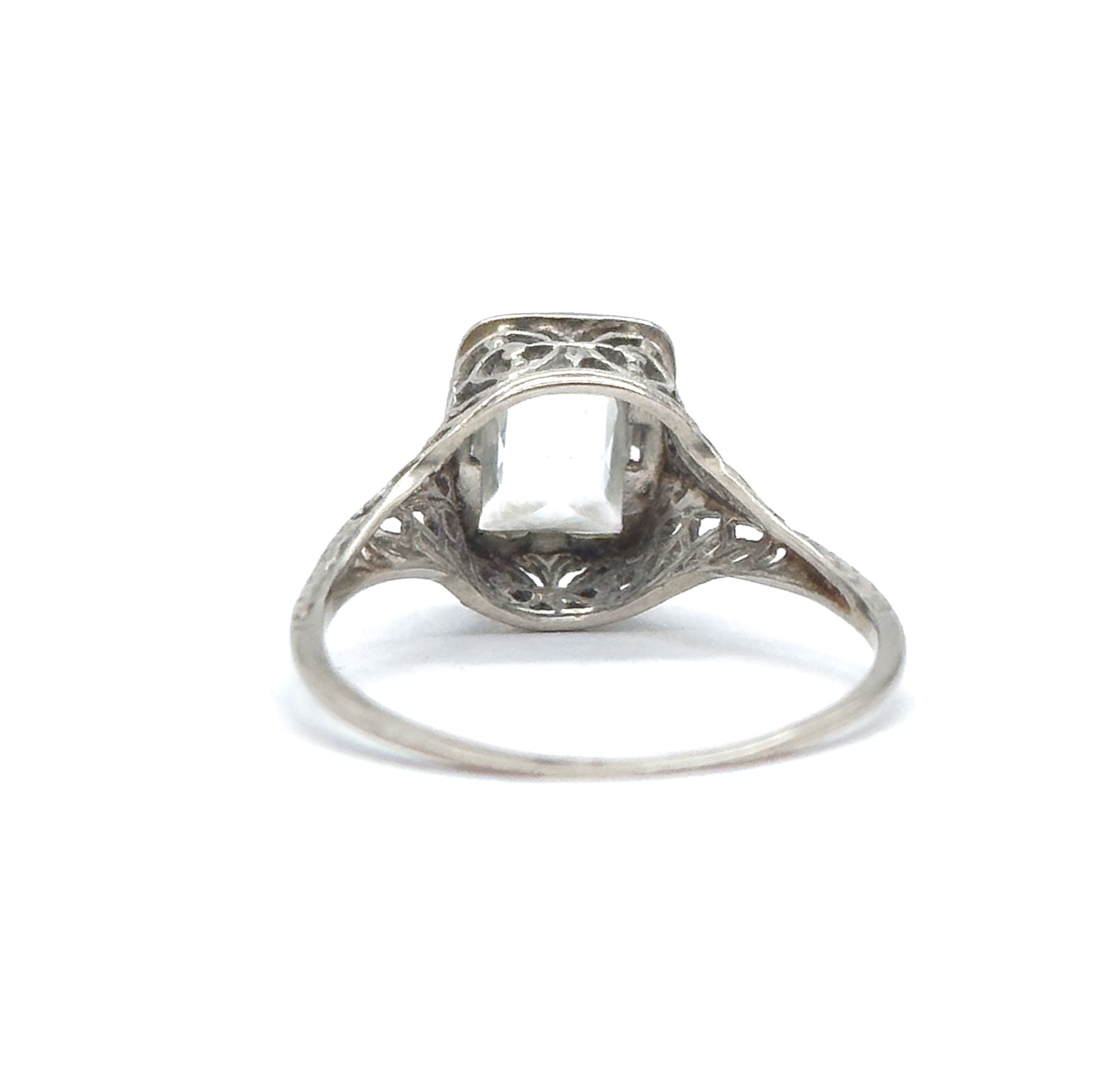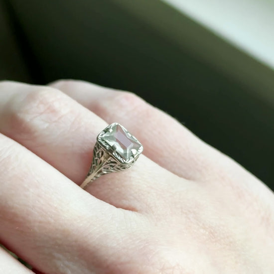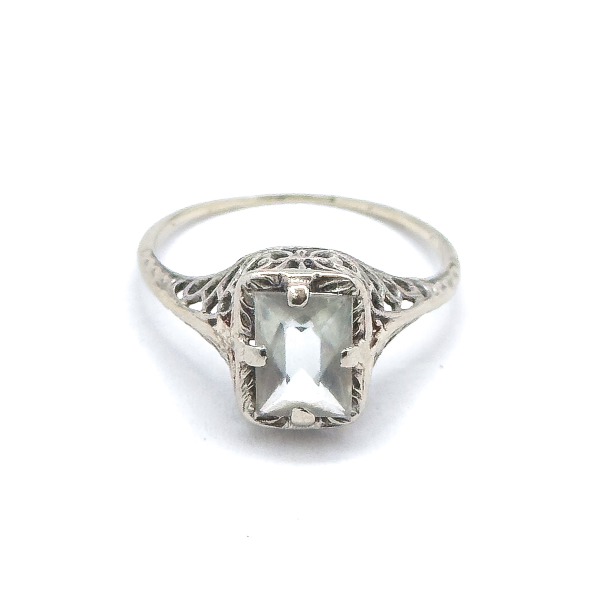 A delicate Art Deco era filigree ring set with a pale emerald-cut aquamarine. The stone is prong set within an openwork gallery, allowing light to pass through the airy white gold setting. Slender shoulders and fine filigree details give this piece a light, architectural feel true to the period. This ring is about 100 years old, sold as found, and does have some wear throughout, fully described below. A very cute and dainty ring.