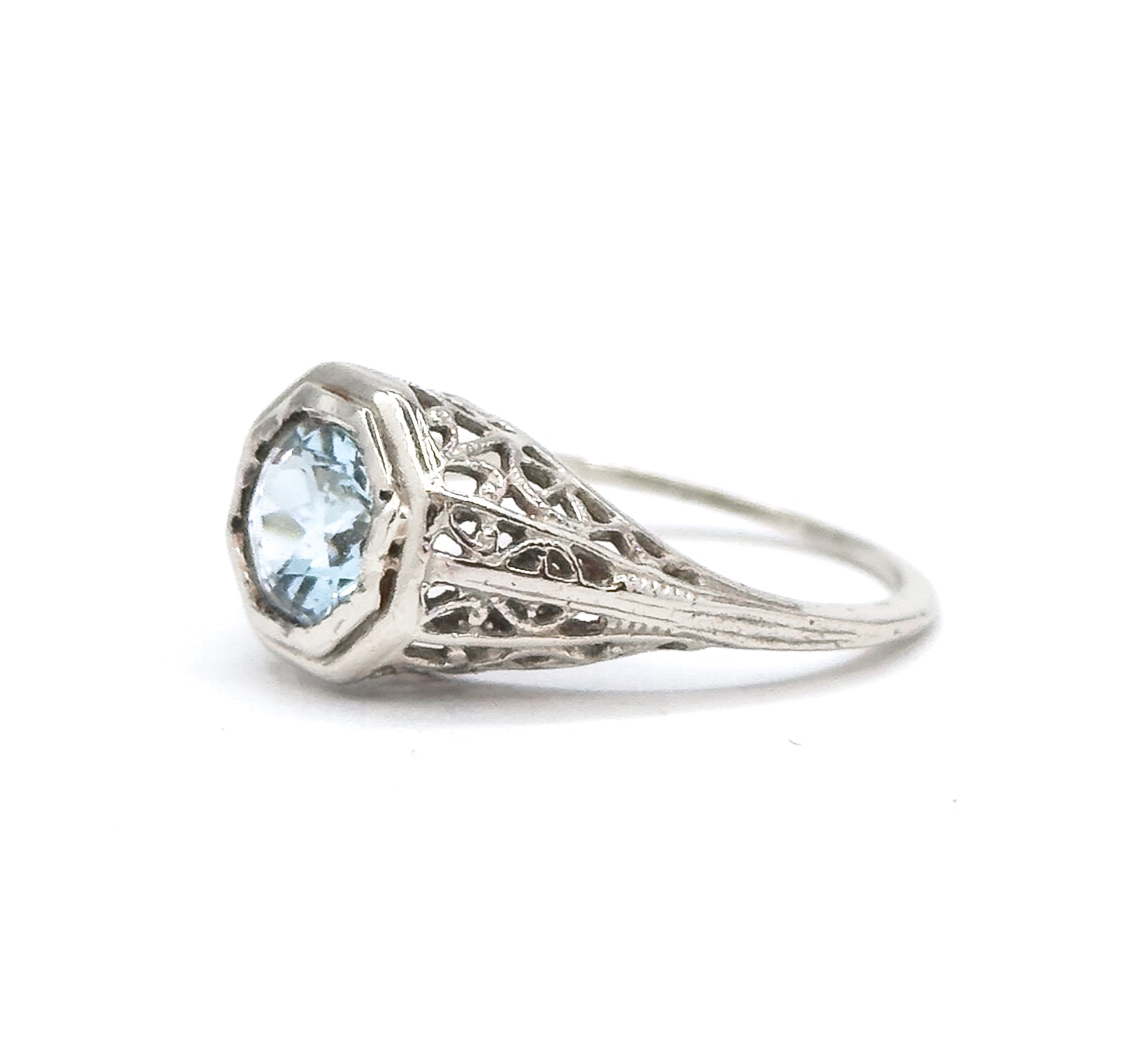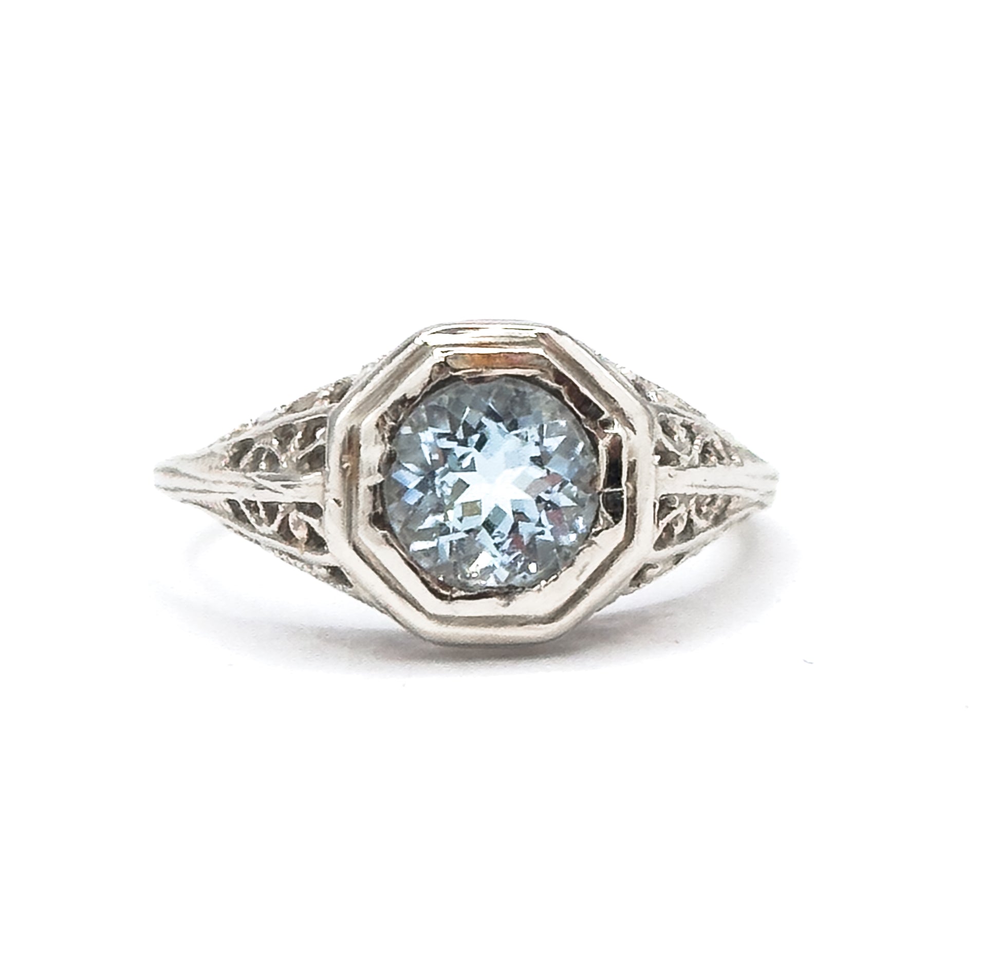 A dreamy Art Deco filigree ring set with a soft pastel blue aquamarine. The round 6mm stone is framed in an octagonal bezel and accented by airy, lace-like gallery work typical of the 1920s. Light in scale yet beautifully detailed, this is a charming period piece with refined proportions. This piece is lovely however it does have some imperfections (cosmetic, not structural) fully described below in the condition report. Stone is securely set and overall quite charming! Price is reduced to reflect the imperfection.