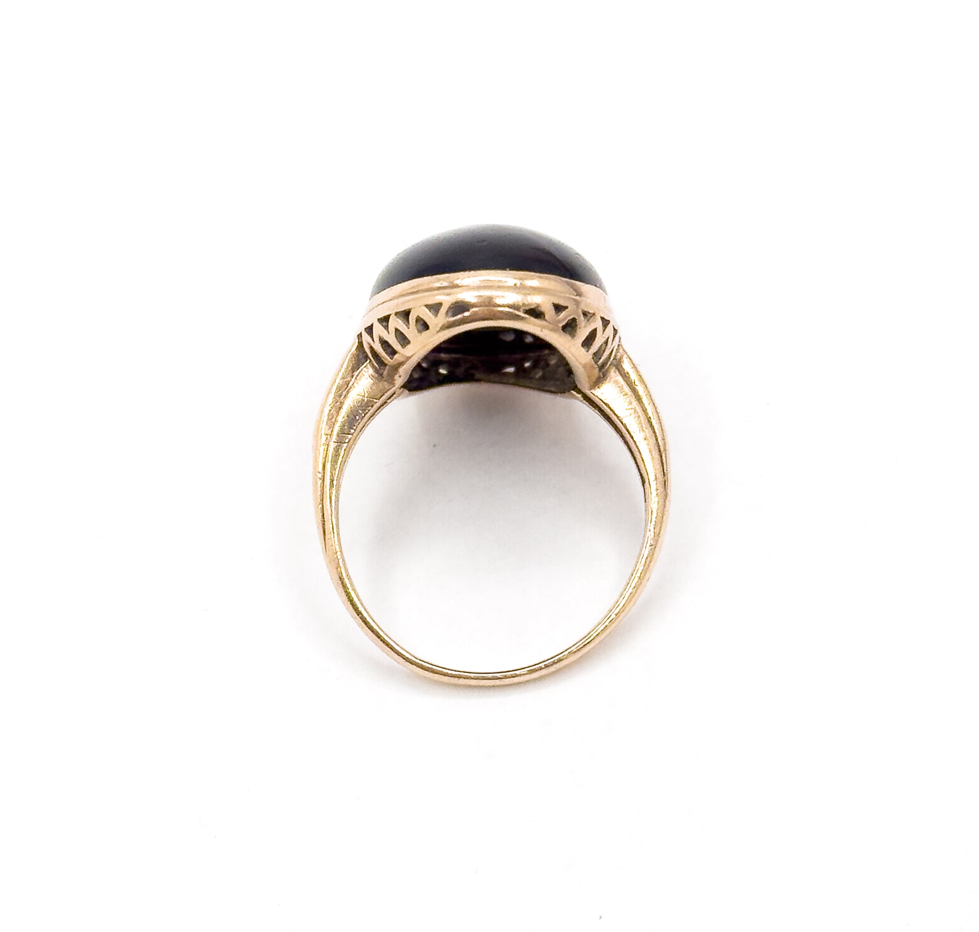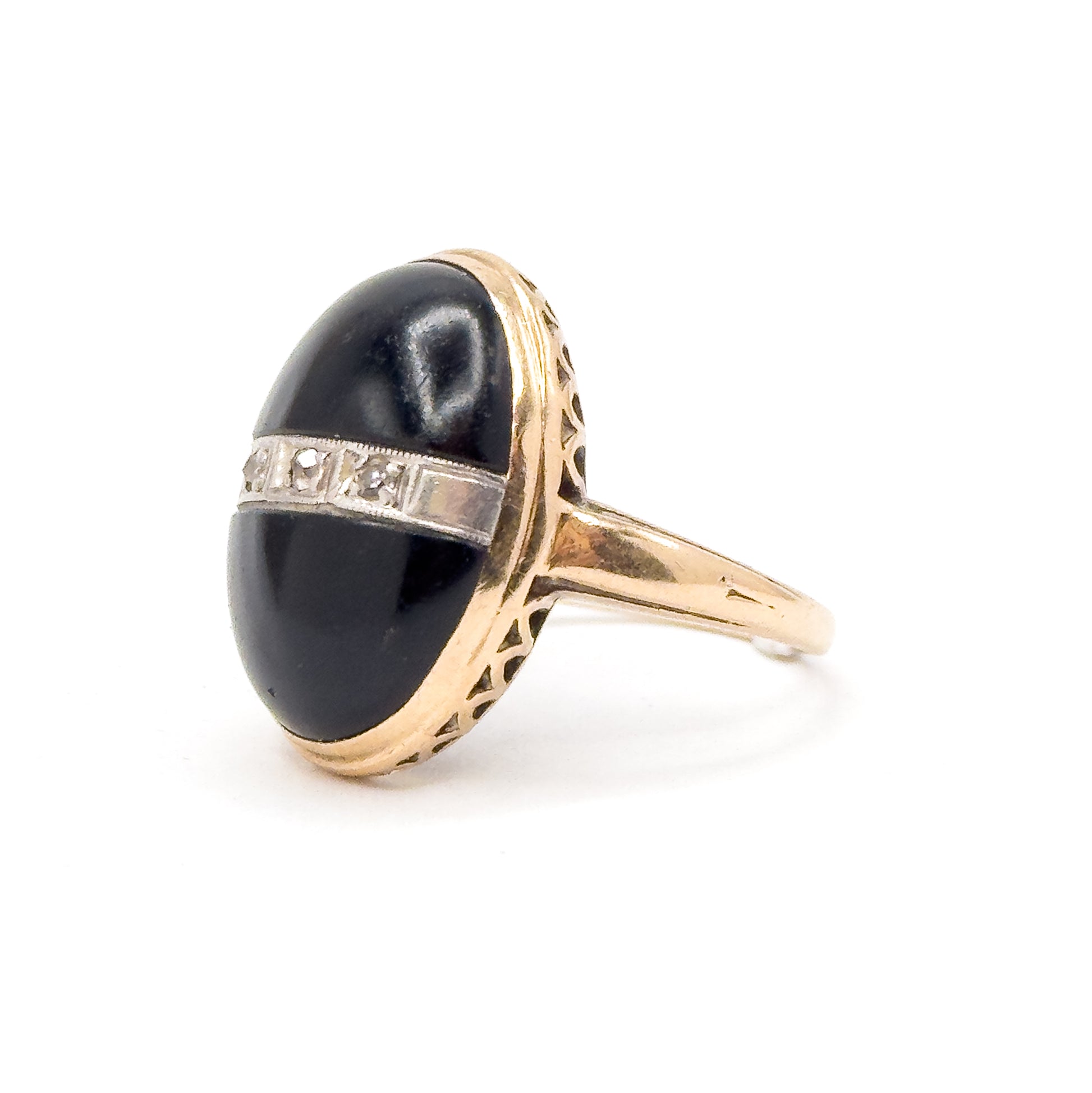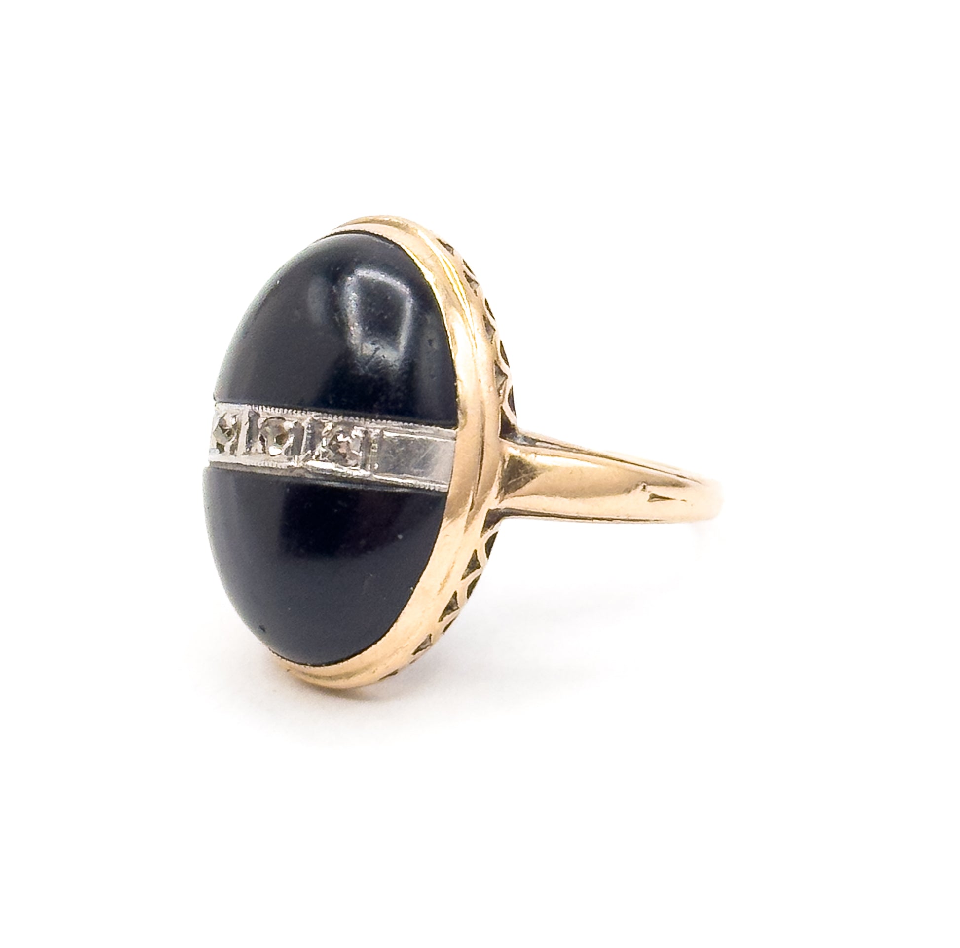 A striking late Art Deco ring featuring a black onyx split cabochon crossed by a white-gold bar set with three tiny old-cut diamonds. Hand-applied milgrain decorates the diamond accent band like a small belt across the onyx. A unique lattice gallery and the warm glow of 10k yellow gold give this piece that unmistakable 1930s–40s character. A bold and unique vintage ring that is comfortable and wearable.