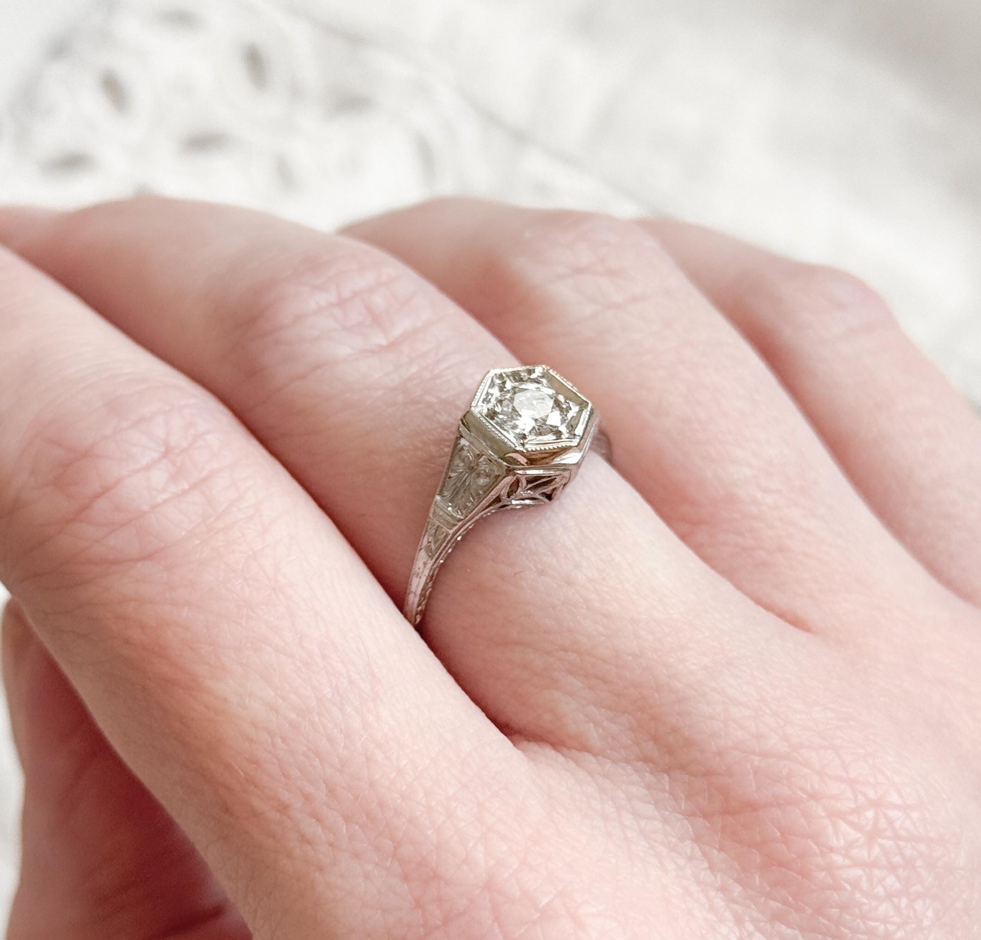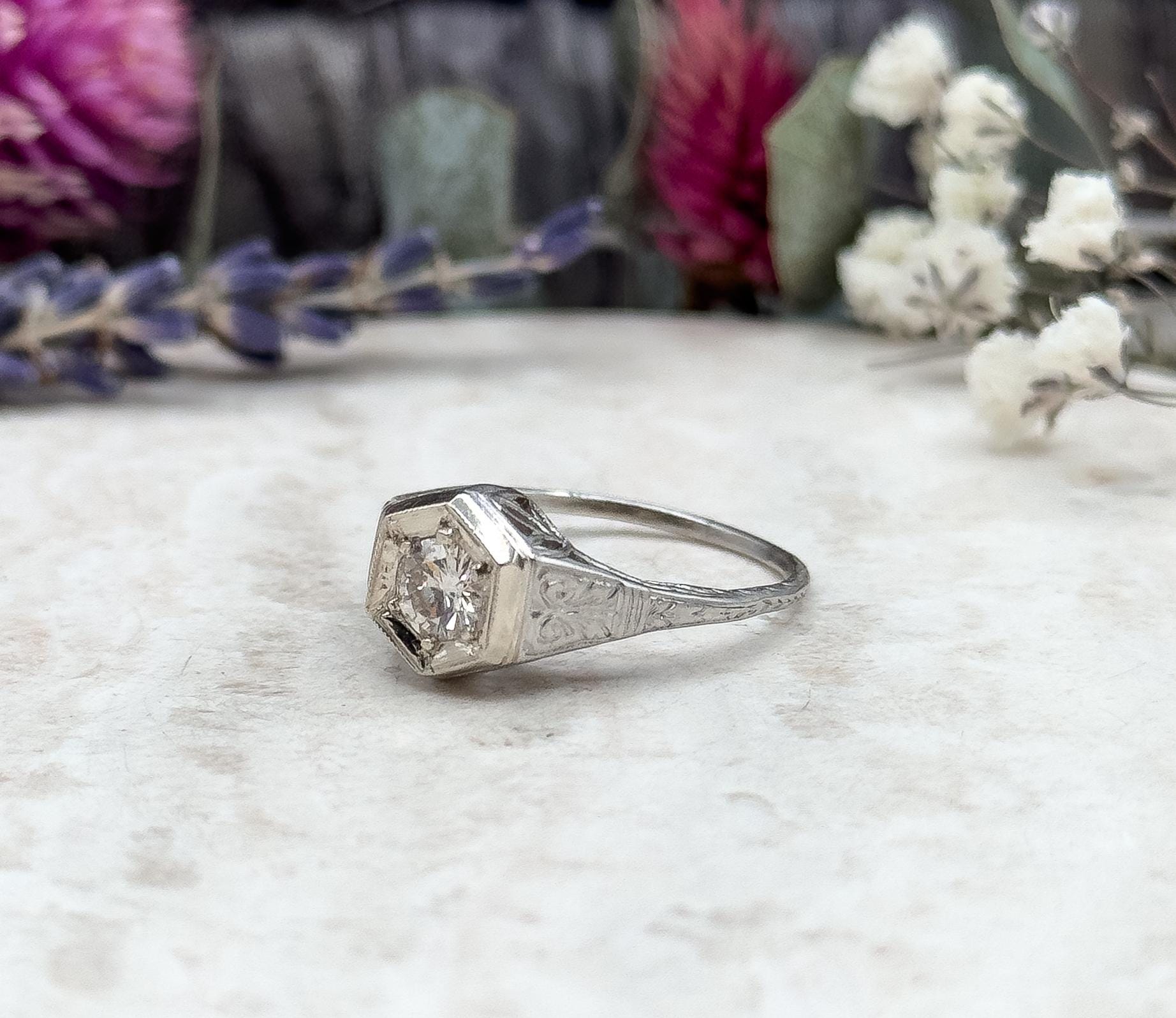 Art Deco Platinum Diamond Ring Filigree Hexagon Setting 1920s Engagement Ring Half Carat Round Brilliant Size 6.75 Vintage Bridal