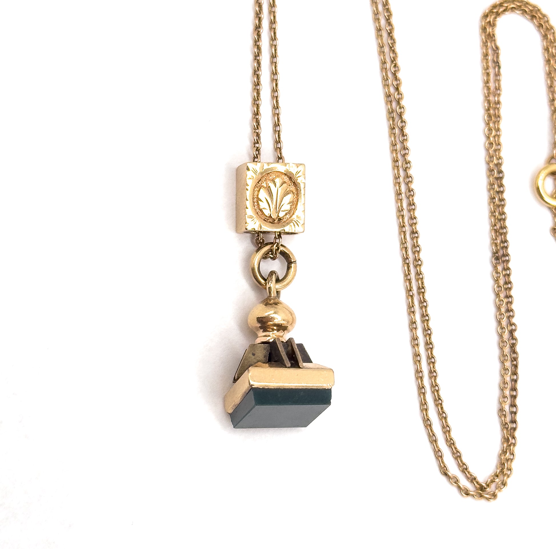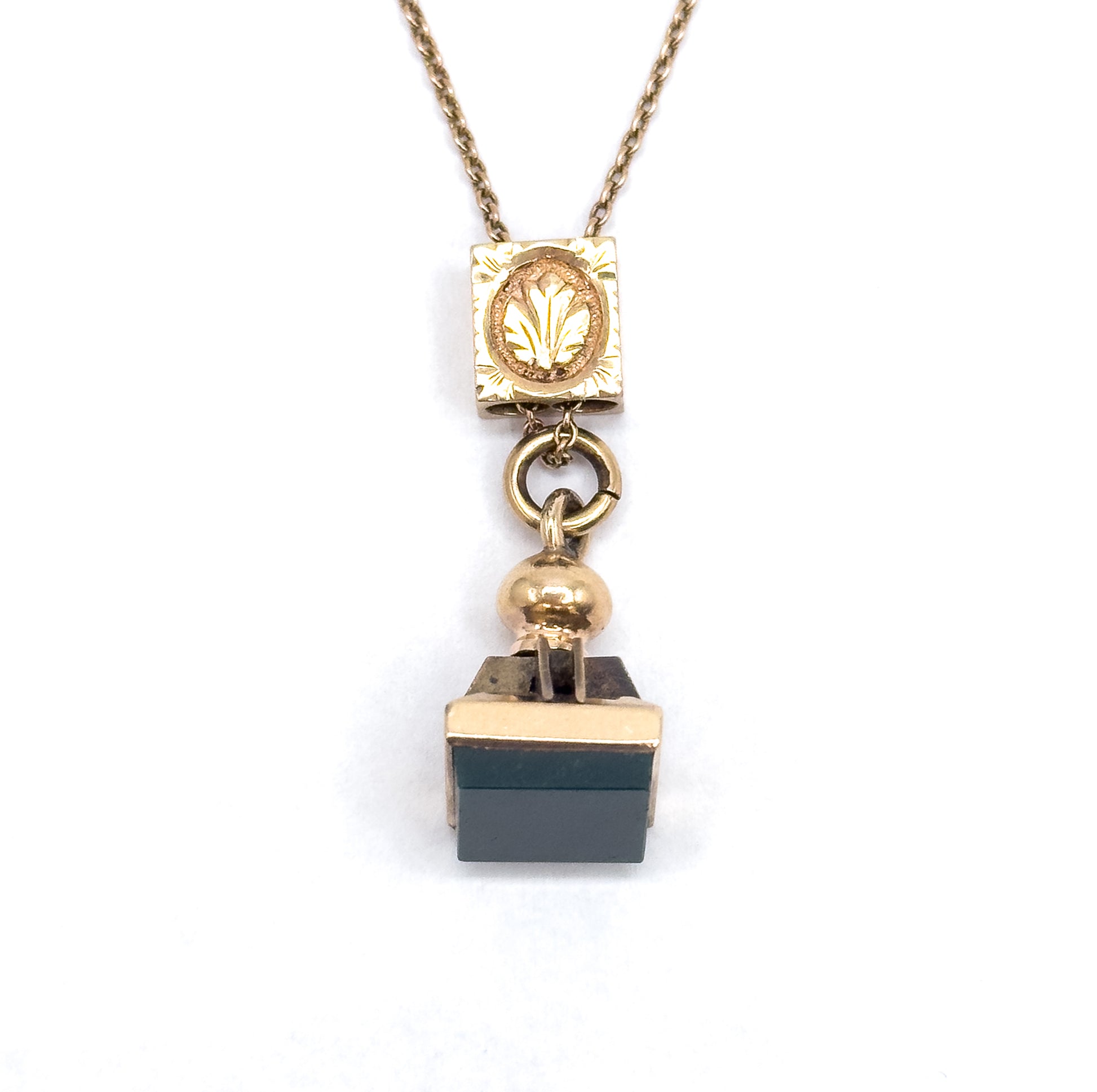 This thoughtfully composed assemblage necklace brings together antique and vintage components into a cohesive, wearable design with strong architectural character. The dark hard stone fob anchors the piece with crisp geometric pendant, paired with a finely detailed leaf-motif slider charm and a slim yellow gold chain. The result is a dainty yet distinctive necklace—easy to wear, visually interesting, and ideal for someone drawn to subtle antique elements with a modern feel.