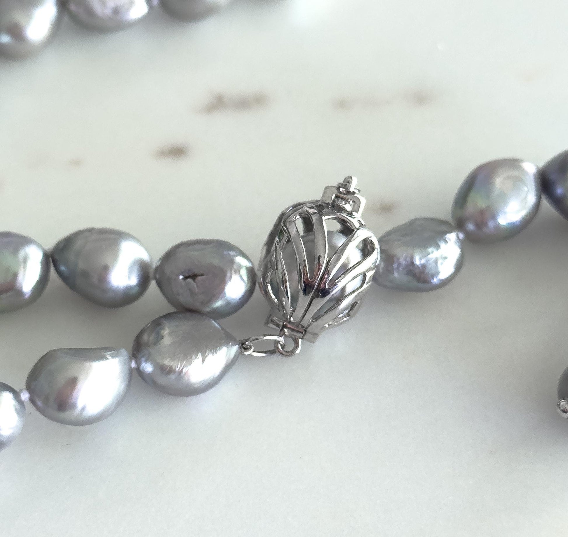 Here is a stunning hand-knotted necklace featuring large, luminous baroque pearls in a soft silvery grey hue. Each cultured freshwater pearl showcases unique texture and organic shape, giving the piece a beautifully natural elegance. The necklace is finished with a sterling silver clamper clasp, offering both security and subtle adjustability for the perfect drape. Elegant yet earthy, this strand is perfect for collectors of statement pearls or anyone drawn to timeless, ocean-born beauty.