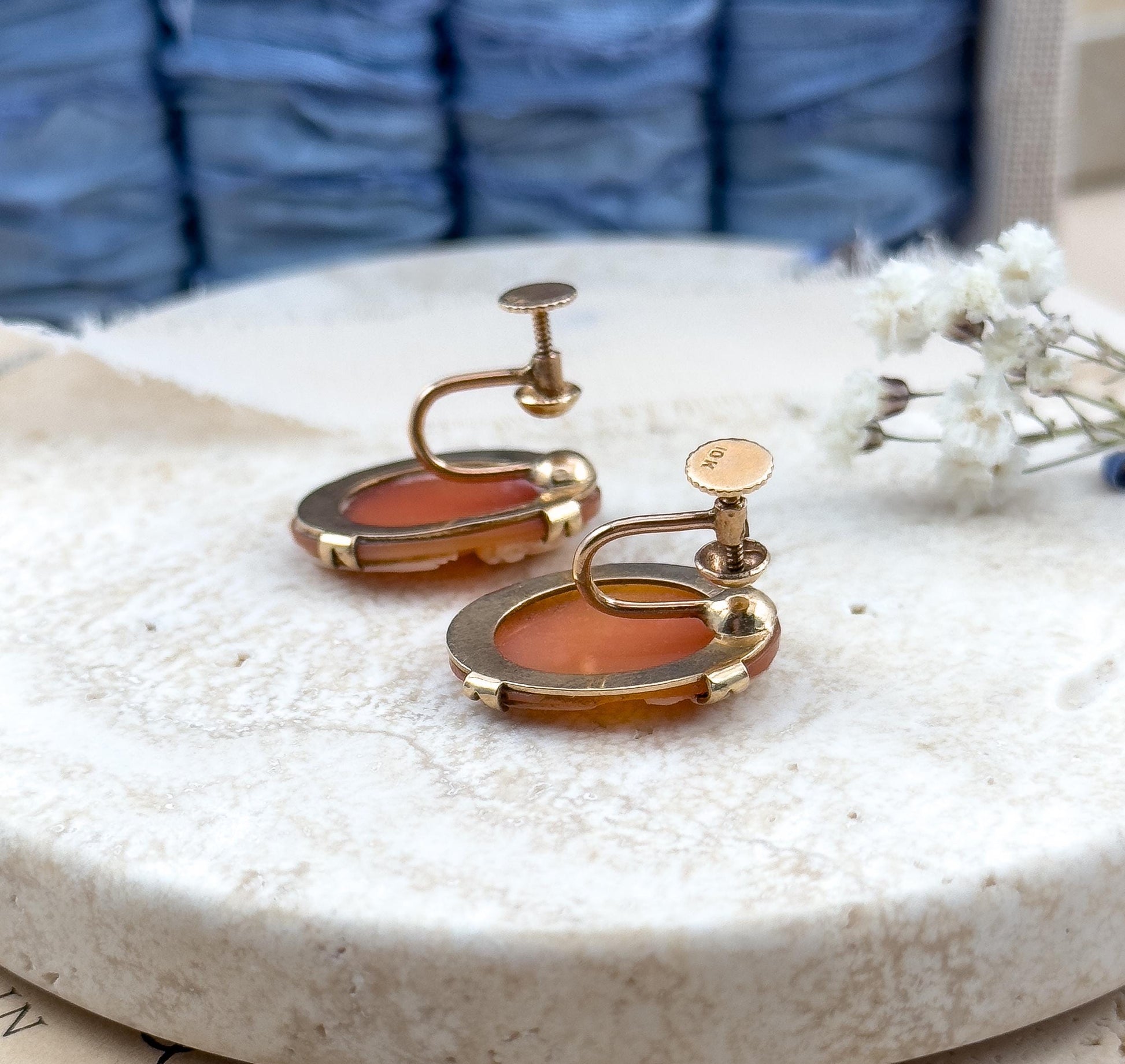 Boxed Antique Shell Cameo Earrings 10K Gold w Screw Backs