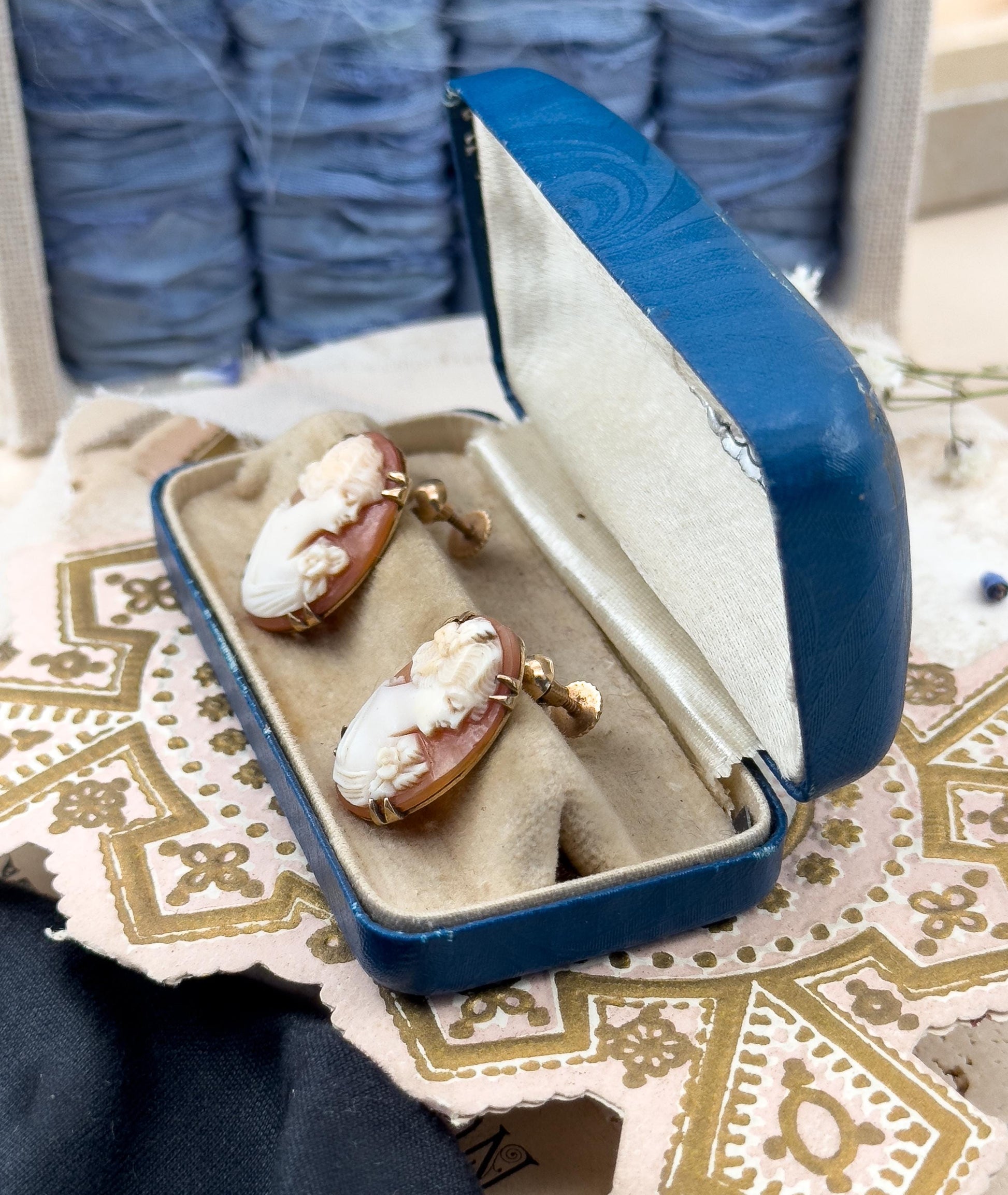 CONDITION These earrings are in well-preserved antique condition. As mentioned, one of them is not perfectly round with one square edge—it's not very noticeable, but you can see it on the right side cameo in the video. Overall, they're nice and ready to wear! Box is in nice shape but does not close fully. Our antique and vintage jewelry collection offers authentic pieces with rich histories. Everything we offer is pre-owned, meaning the items may have age-related wear. Each item is meticulously inspected by our expert jewelers, who provide detailed, transparent descriptions noting any signs of age-related character. We're committed to your complete satisfaction, offering additional images and answering any questions you may have. By choosing our jewelry, you're not just acquiring a beautiful accessory, but embracing a piece of history curated with care and presented with integrity.