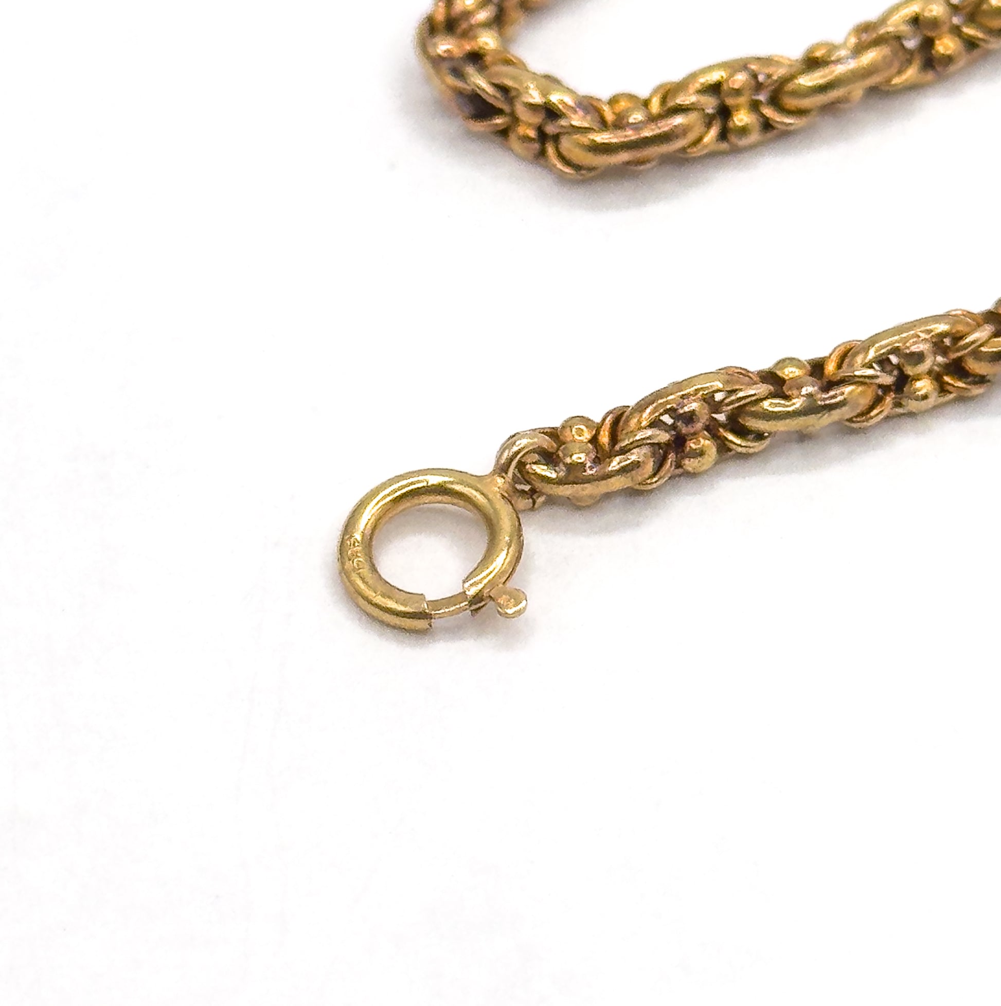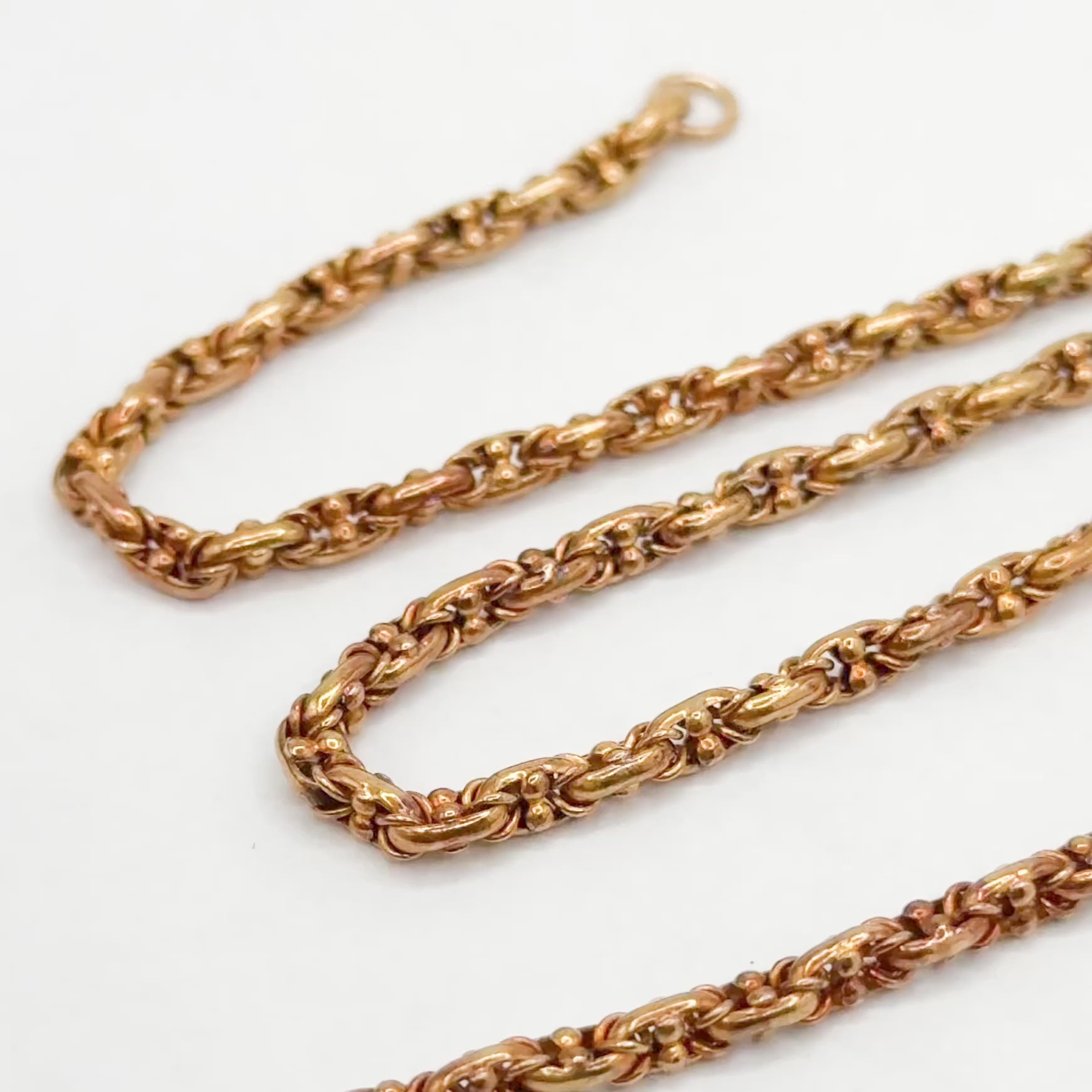Here is a fantastic, and very special hand fabricated antique chain necklace with beautifully crafted, intricately fashioned fancy links. This is an Etruscan Revival Byzantine-esque/rope variation with granulation/bead detail on each link. This necklace measures 20.25 inches and is crafted from solid 14K Rose Gold. The gold is antique with a rich warm patina, this chain was originally part of an antique ladies long guard chain that was split into three separate chains. The clasp works nicely and is not original to the chain and is 14K(stamped & tested). The chain has a weight of 11.6 grams. This gorgeous chain with its unique links will add instant texture to any ensemble. This unique piece of history will be at home in any antique jewelry collection.