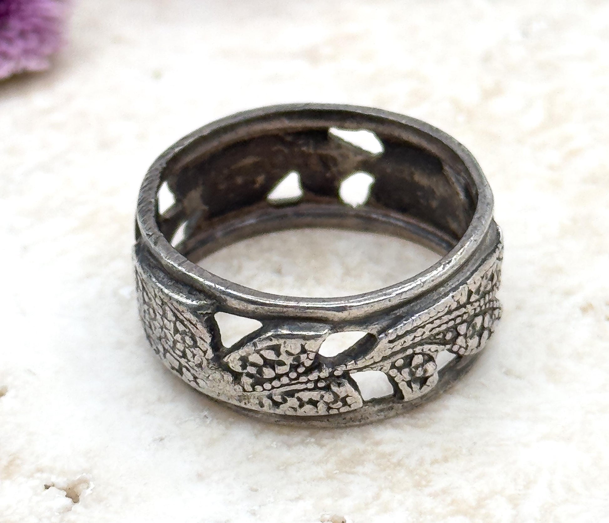 Here is a super cool vintage handmade ring in sterling silver. This ring features a textured floral design and cutouts in the metal. The ring also has a nice patina, further enhancing the textured design. The ring is stamped sterling on the inside and could be polished to a bright silver color if desired by the new owner. This cool piece will be at home in any vintage jewelry collection.