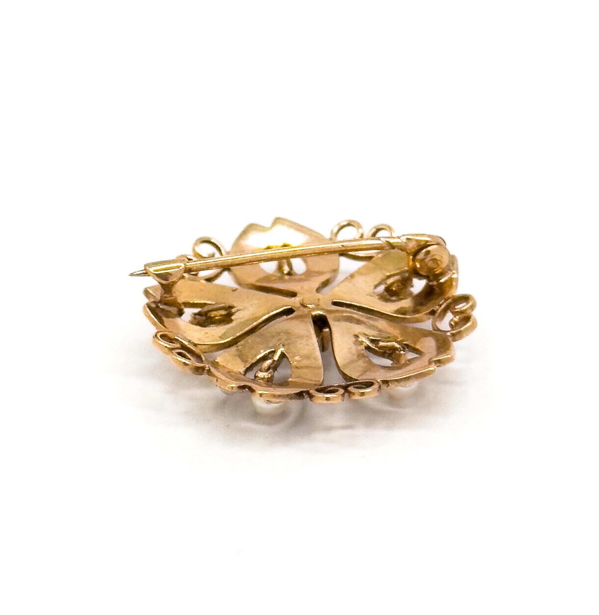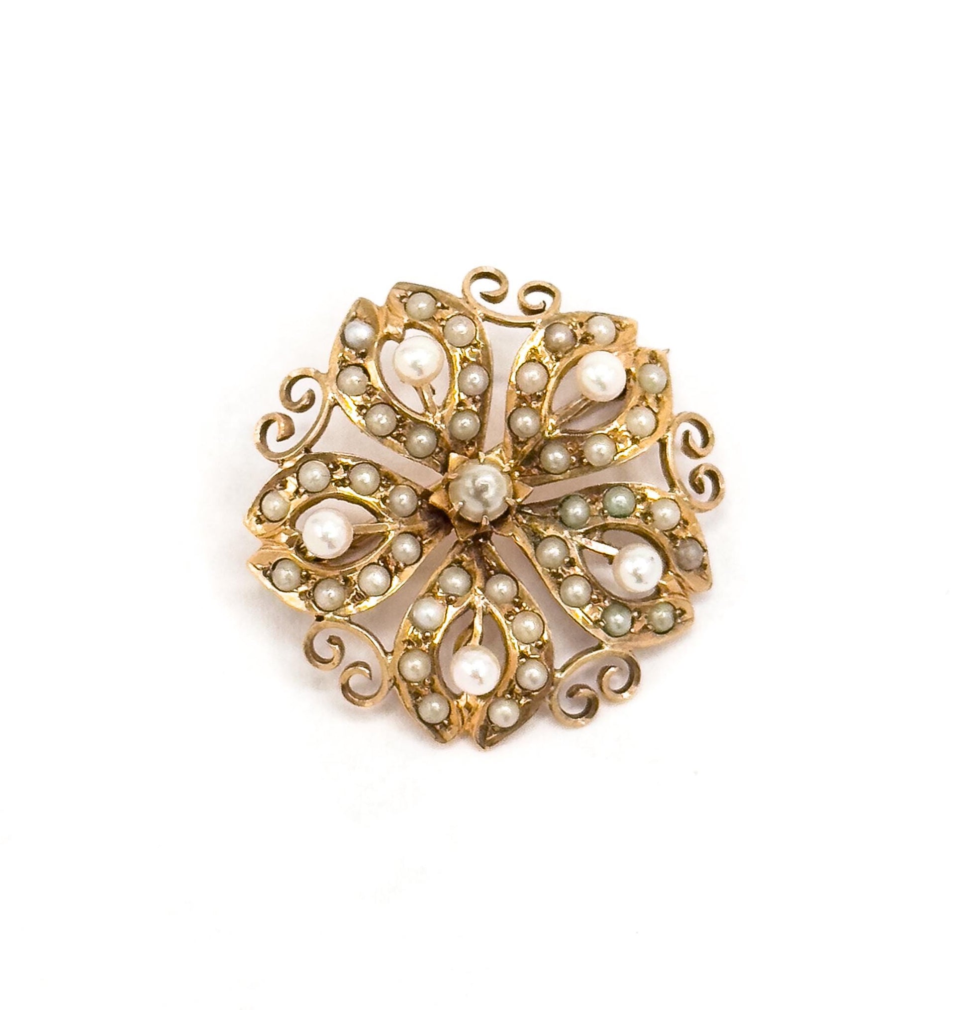 This antique Edwardian brooch is designed in a floral snowflake motif, hand-crafted in warm 10K yellow gold and set with creamy white pearls. The openwork petals are delicately adorned with 46 seed pearls, giving it a luminous texture and refined antique charm. This darling antique brooch is over 100 years old and is ready to add to your jewelry collection.