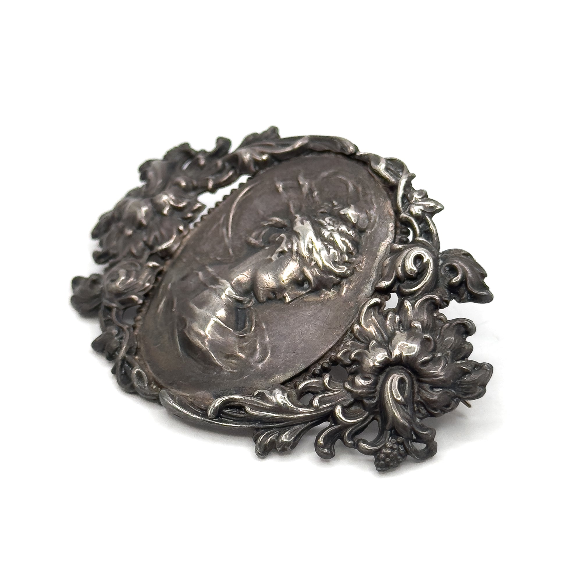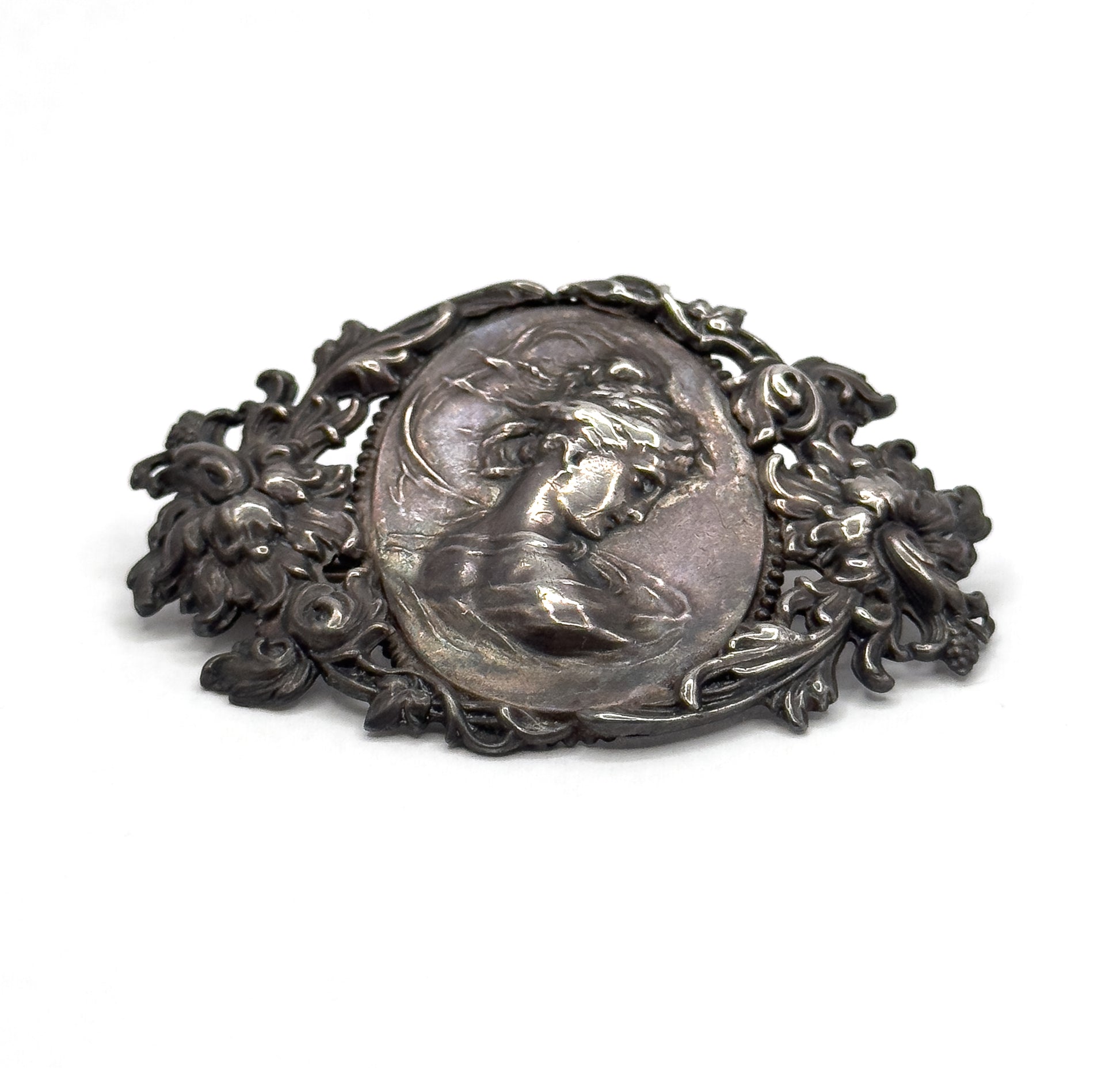 A striking Art Nouveau brooch featuring beautiful Repousse work and a captivating wind swept Gibson Girl in profile. This piece captures the soft femininity and movement typical of the Art Nouveau period. The highly detailed floral surround and sculptural form make it a beautiful example of early 20th-century silver artistry. This beautiful brooch features a tube hinge and C cache, with nice tension in secure working order. The brooch has a deep patina on the silver which can be polished if desired by the new owner. Ready to wear, collect, or gift!