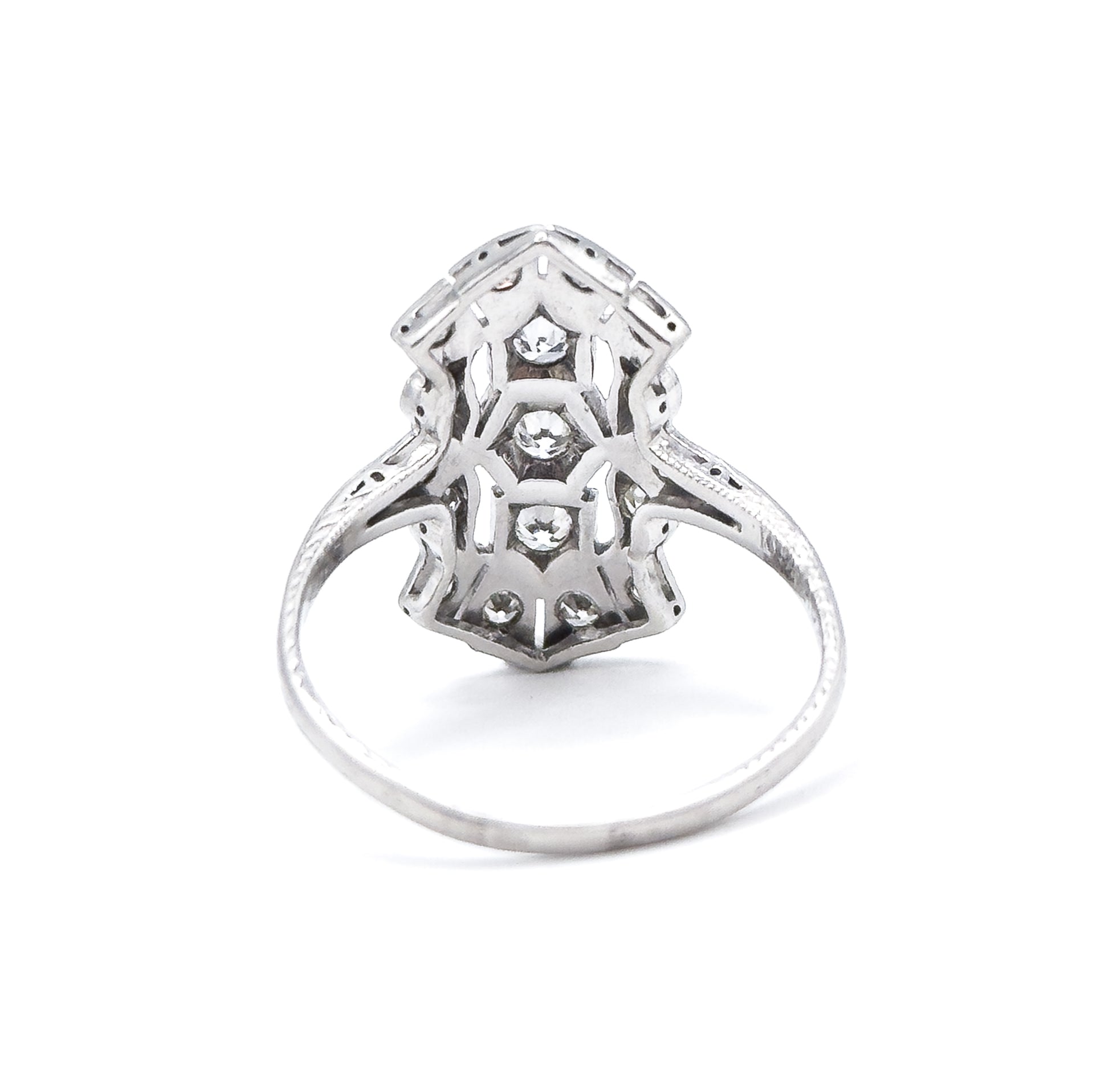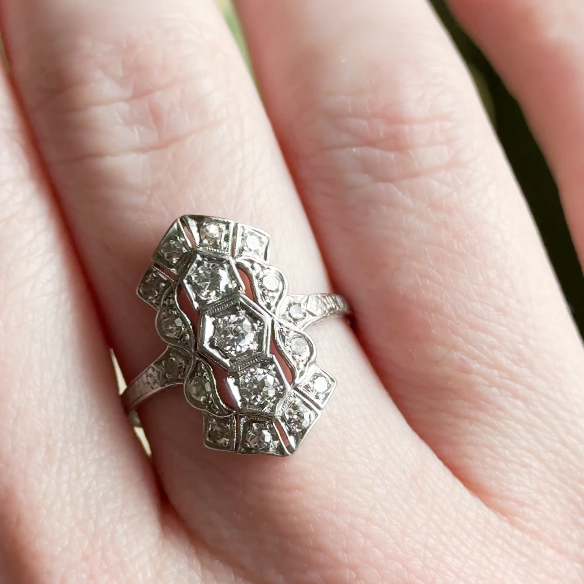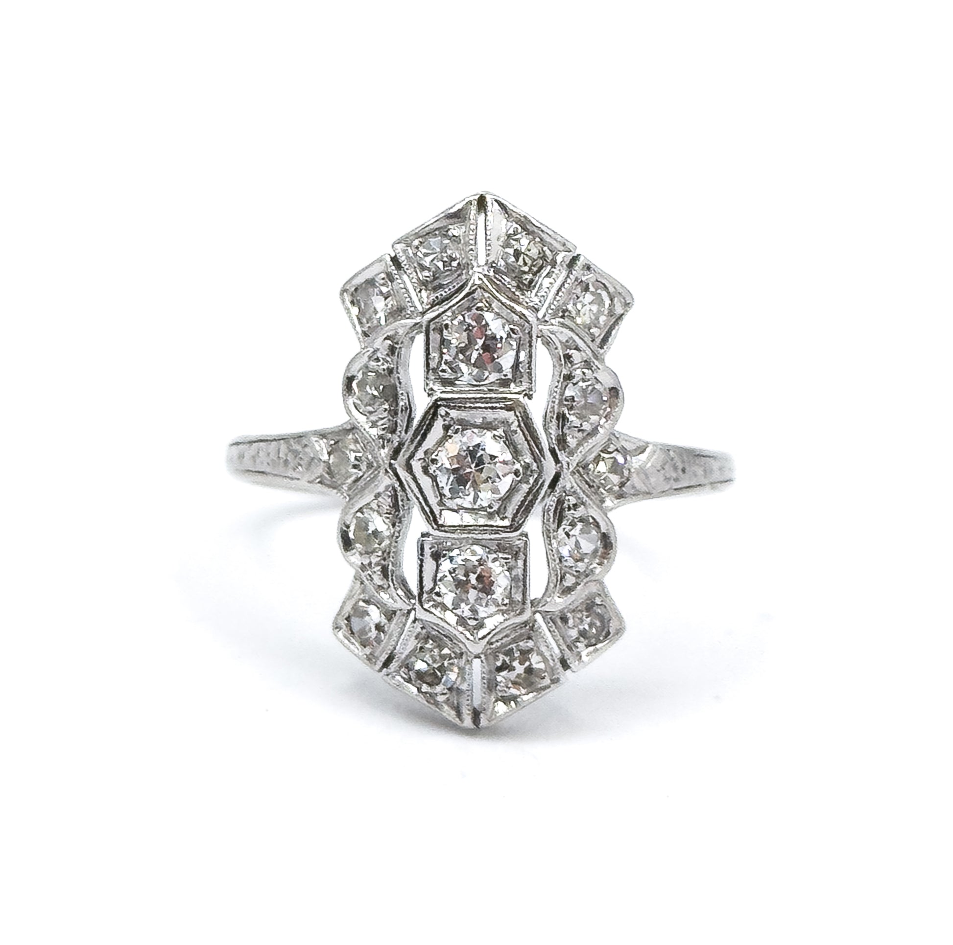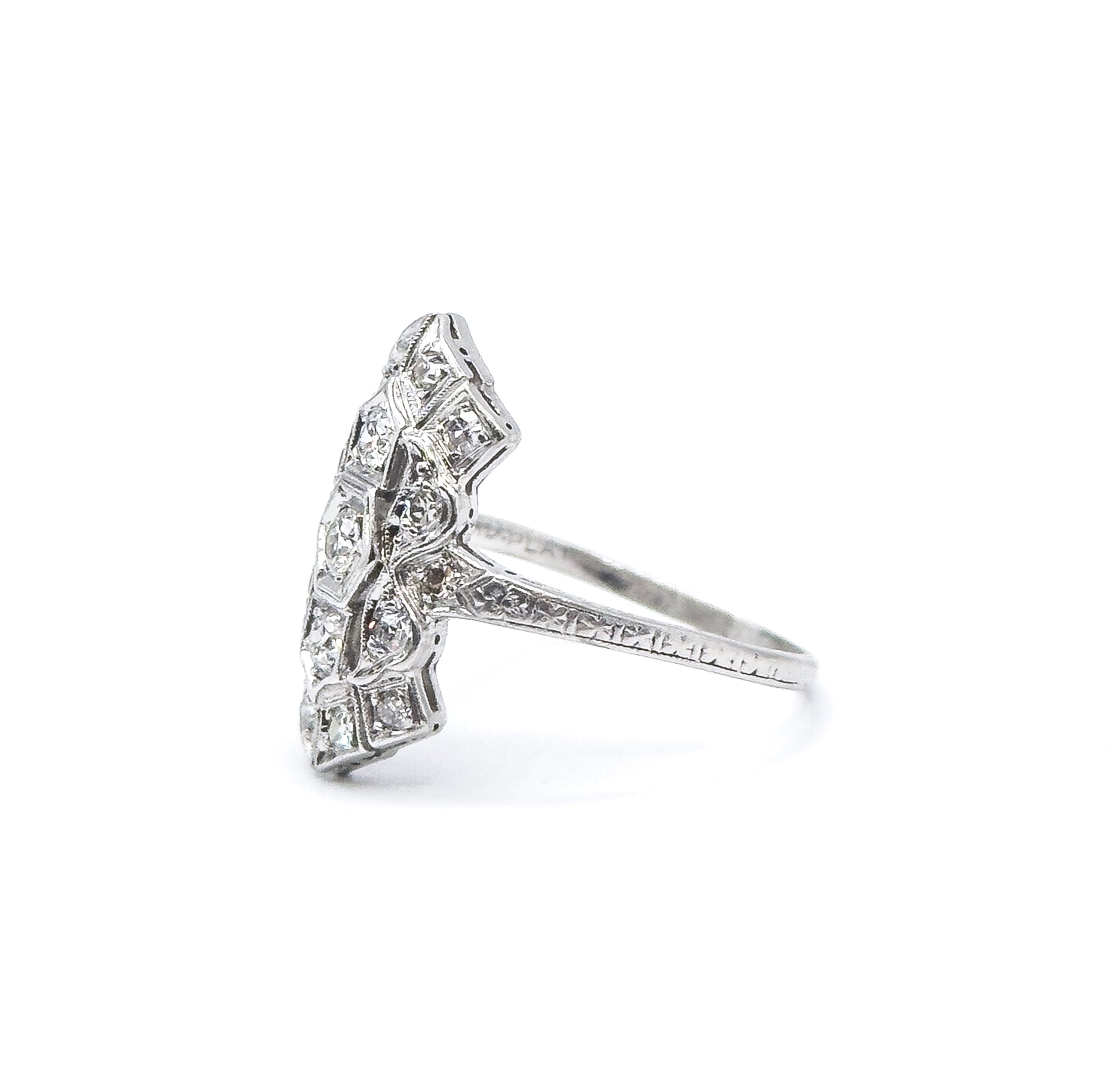 An antique Edwardian - Art Deco shield ring crafted in platinum with a finely worked, open geometric face and etched shoulder details. Seventeen natural diamonds are arranged across the shield in a mix of old European and single cuts, giving the ring depth and sparkle without excess height. A well-balanced antique design with a comfortable profile and crisp 1920s detail.