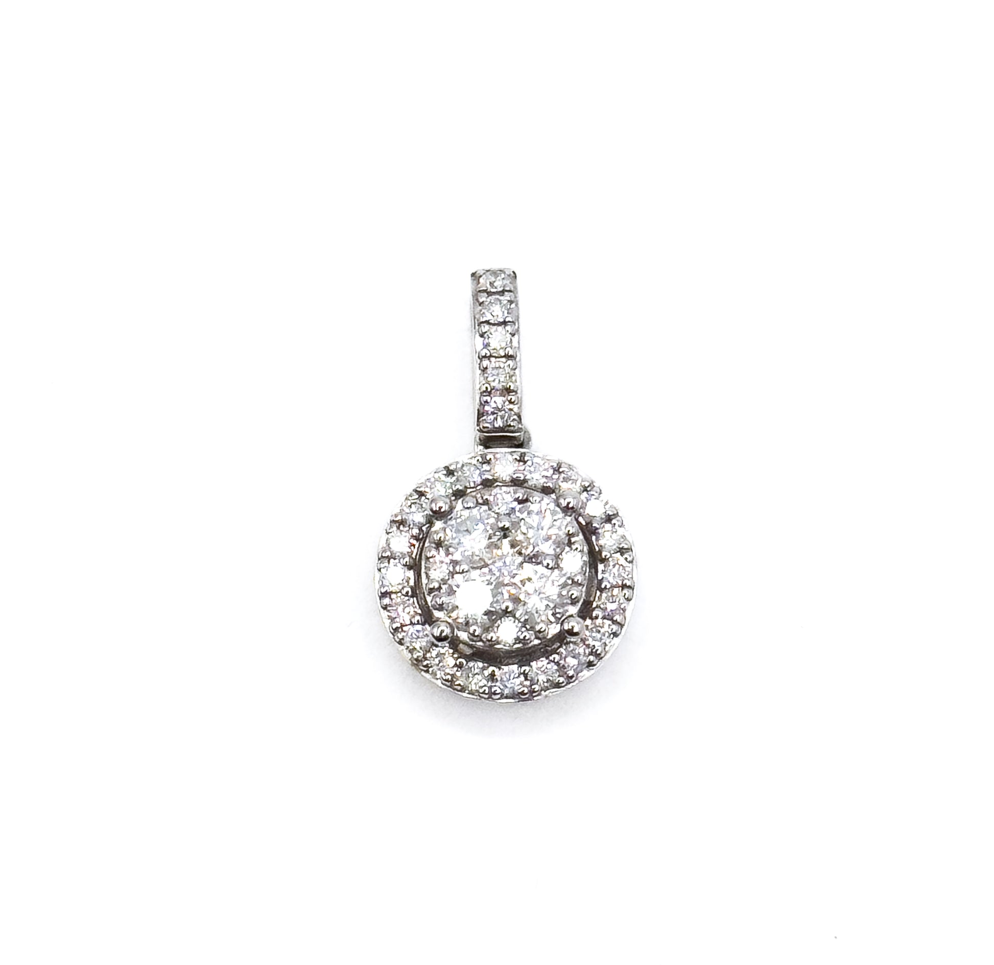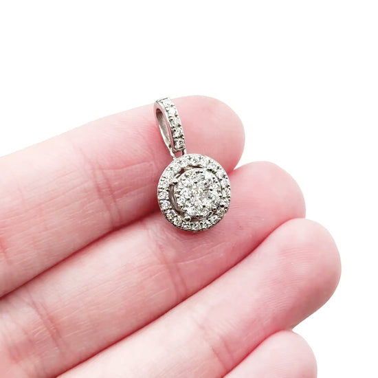 A bright and sparkling diamond halo cluster pendant crafted in bright 14K white gold. The design features a central cluster surrounded by a glittering halo with pavé-set bail—34 round diamonds in total, shimmering with every movement. A beautiful contemporary estate piece that pairs easily with any chain and adds instant shimmer.