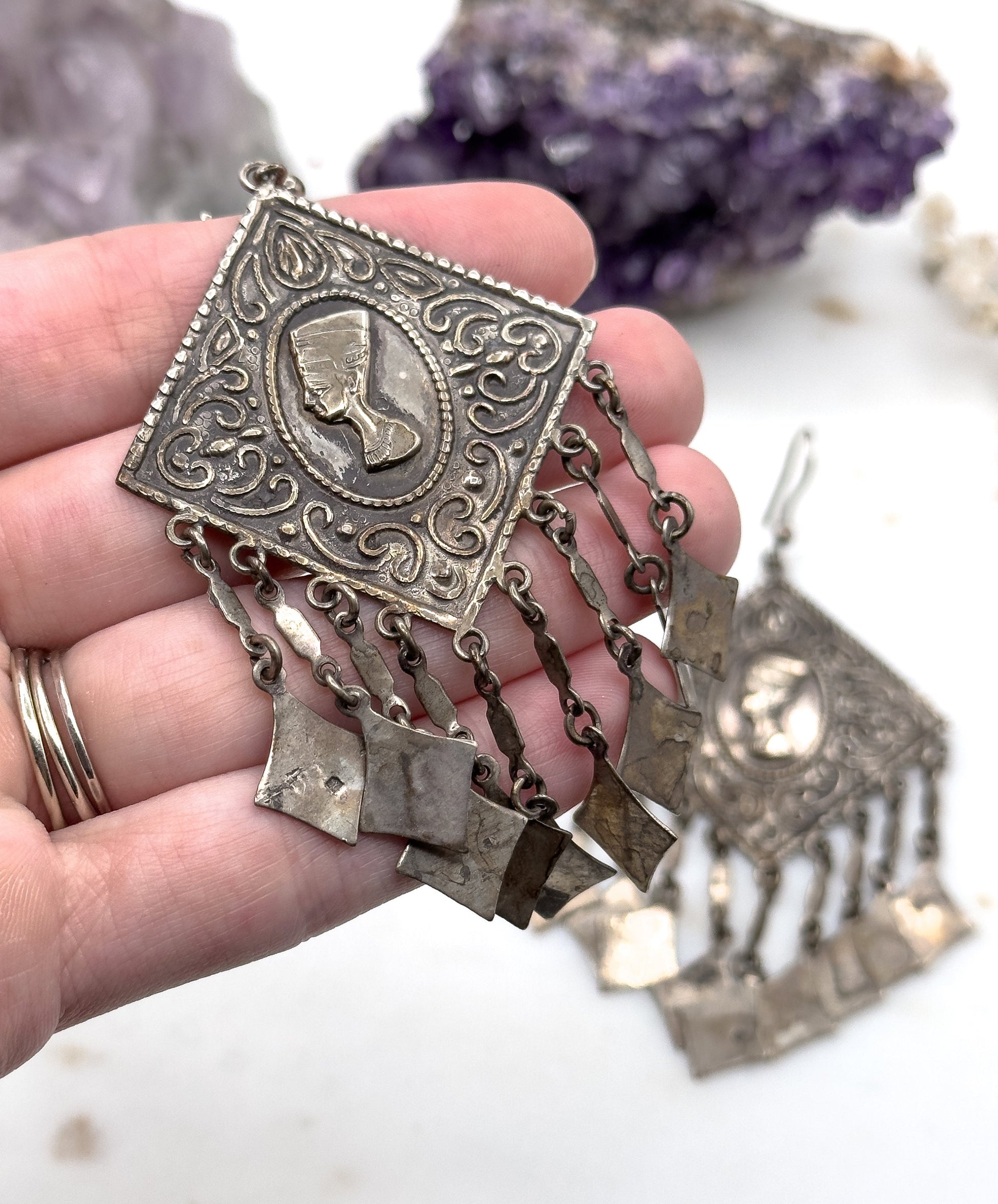 Here is a rare and awesome pair of authentic Vintage Egyptian revival earrings in silver from Egypt. These earrings are a huge and substantial vintage pair from the 1970s. Each earring features a diamond-shaped plaque with a fringe waterfall of smaller silver diamond-shaped drops. In the center of the earring is a bust of Queen Nefertiti in profile. In the late 1970s, the “Treasures of Tutankhamun” exhibition toured America, resulting in a huge wave of retro Egyptian revival jewelry and fashion. These souvenir-style earrings were made around that time. These earrings are from Egypt and have Egyptian silver hallmarks. A truly fantastic vintage pair that is ready to wear, gift, or collect.