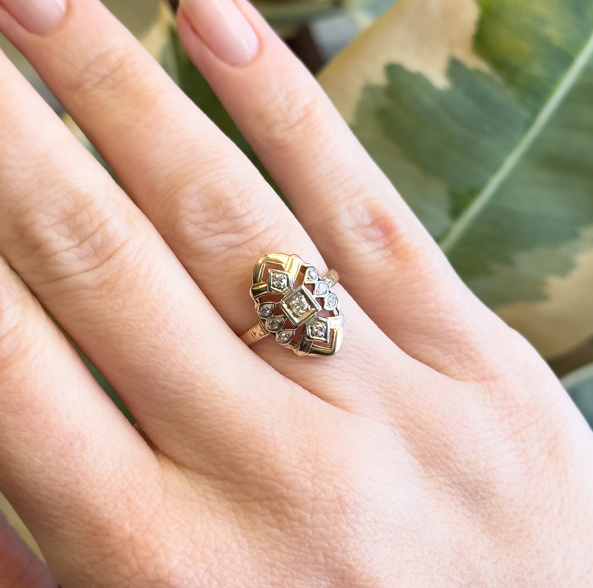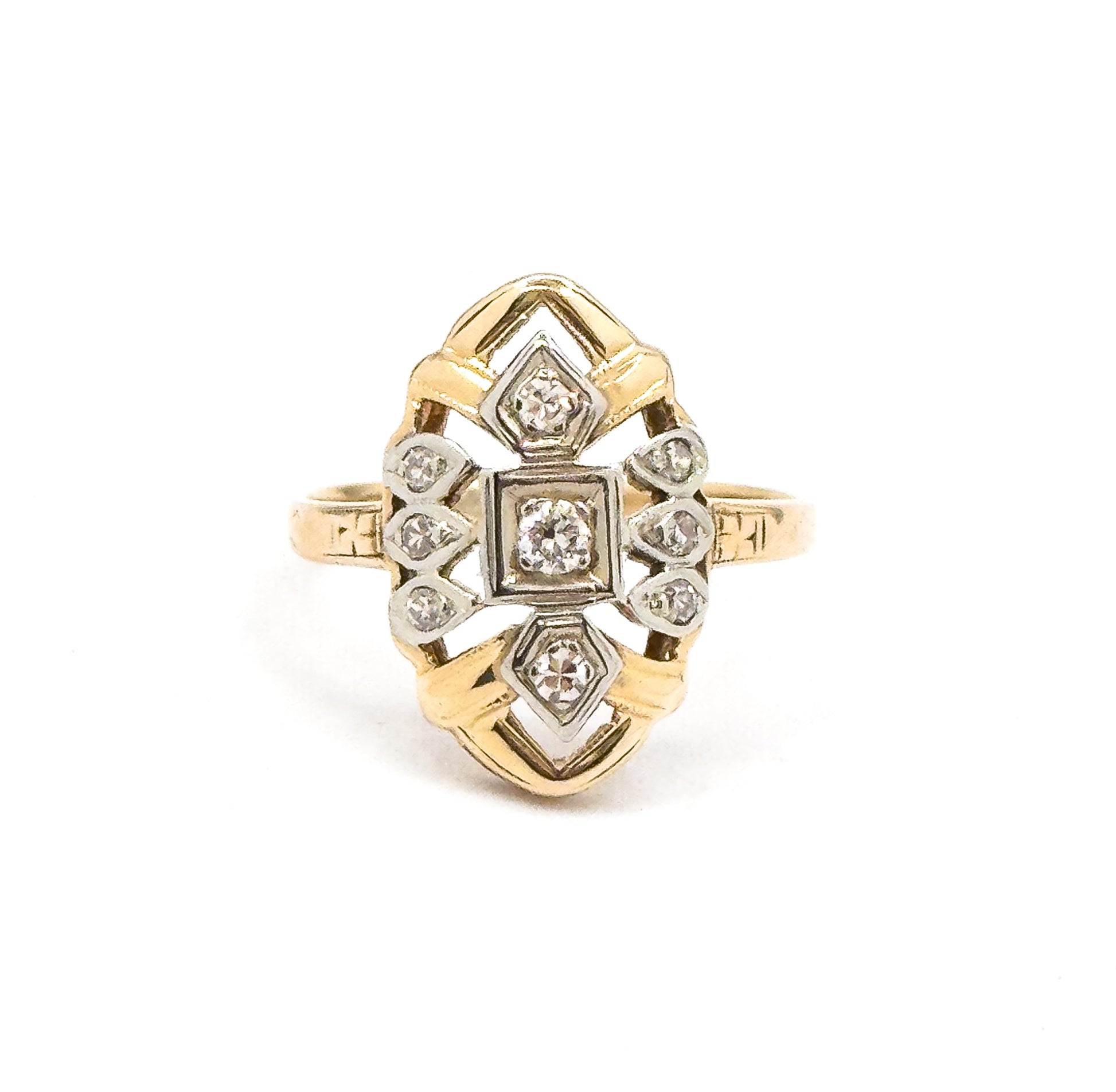 A beautiful Late Art Deco shield ring featuring glittering natural diamonds set in crisp white gold against a warm yellow gold frame. The elongated face showcases classic 40s design with geometric openwork, delicate milgrain detailing, and a symmetrical arrangement of sparkling single cut diamonds. The low profile sits comfortably on the finger, making this an easy everyday piece with vintage glamour. A lovely example of two-tone Art Deco craftsmanship.