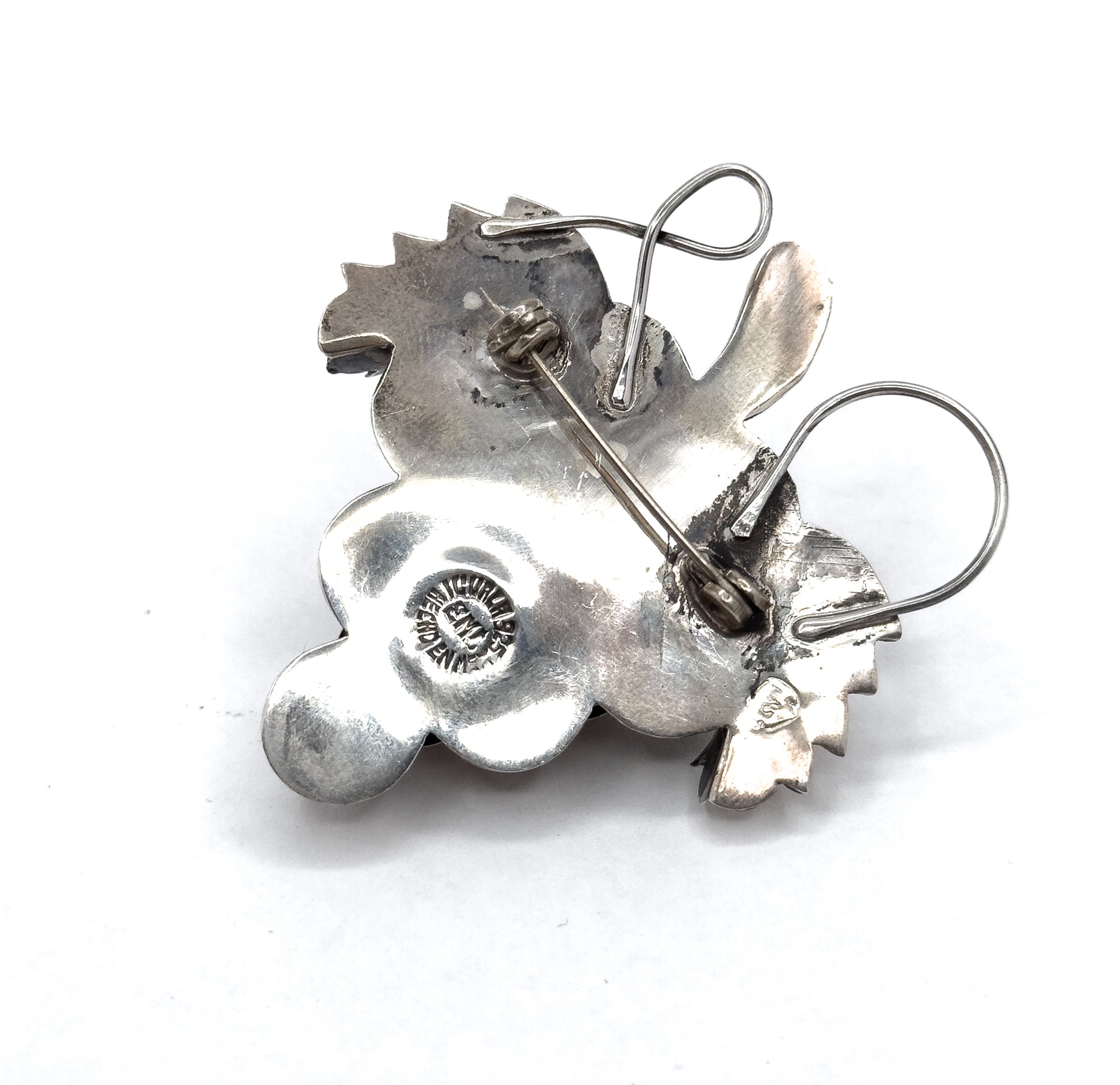 A charming mid-century handmade Mexican silver brooch shaped as a full, puffy grape cluster, complete with sculpted leaves and swirling vine tendrils. Beautifully crafted in Iguala, Mexico, this piece has that wonderful 1950s artisan feel—dimensional, bold, and full of character. A delightful collectible for lovers of Mexican silversmithing and vintage figural jewelry.