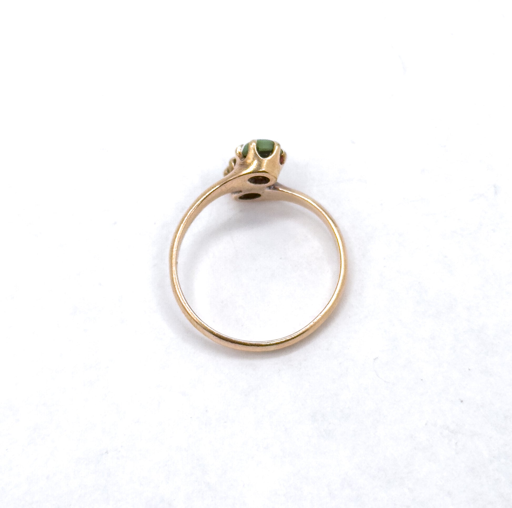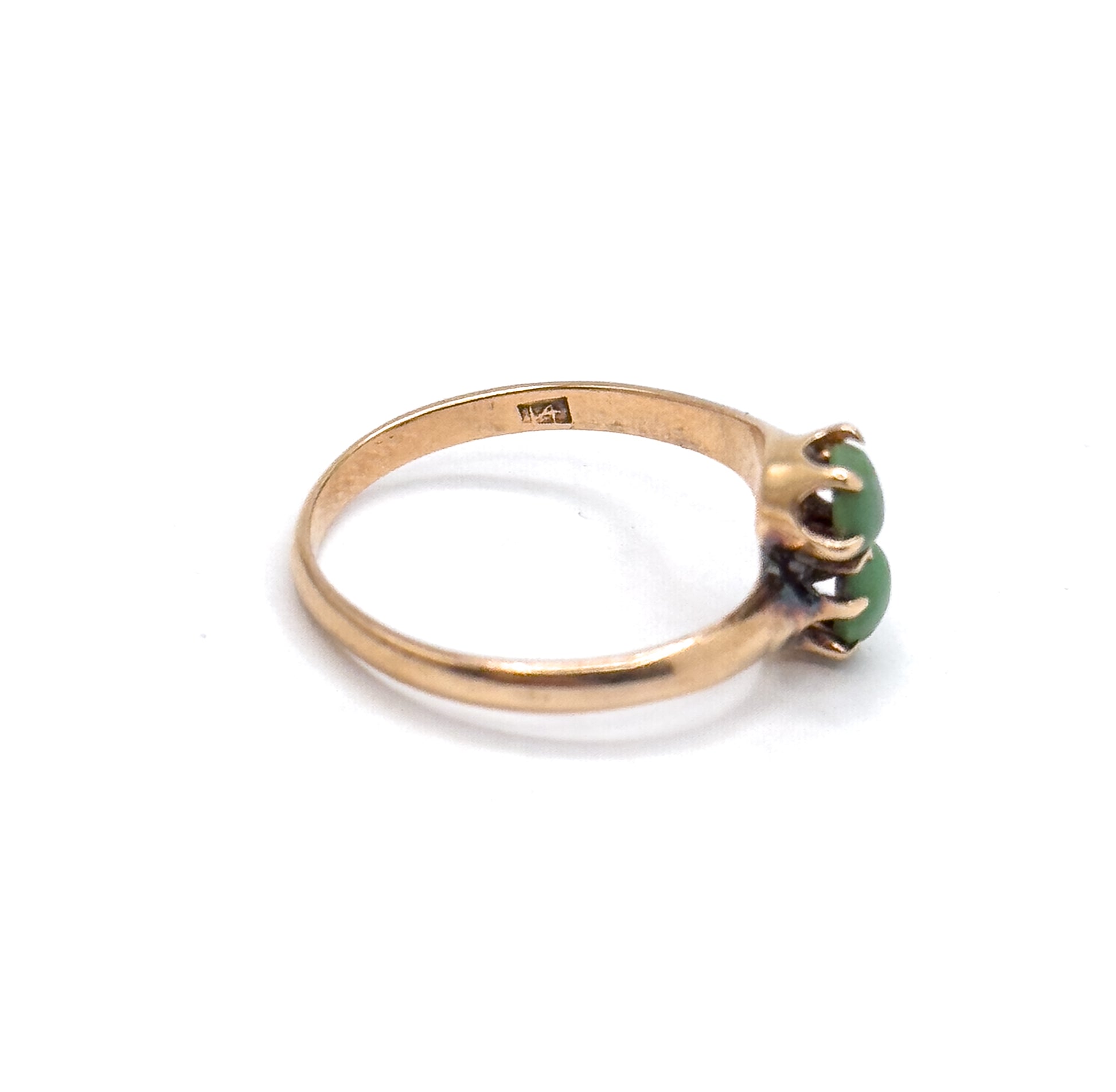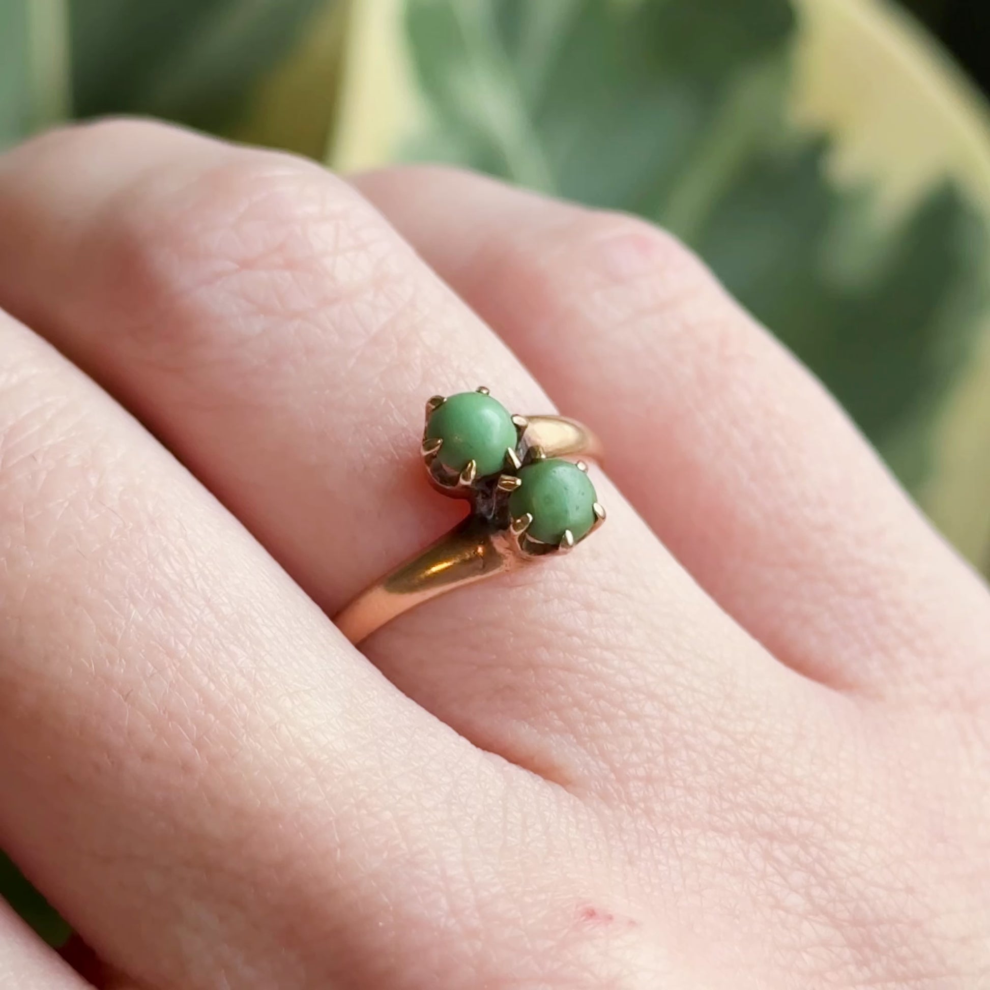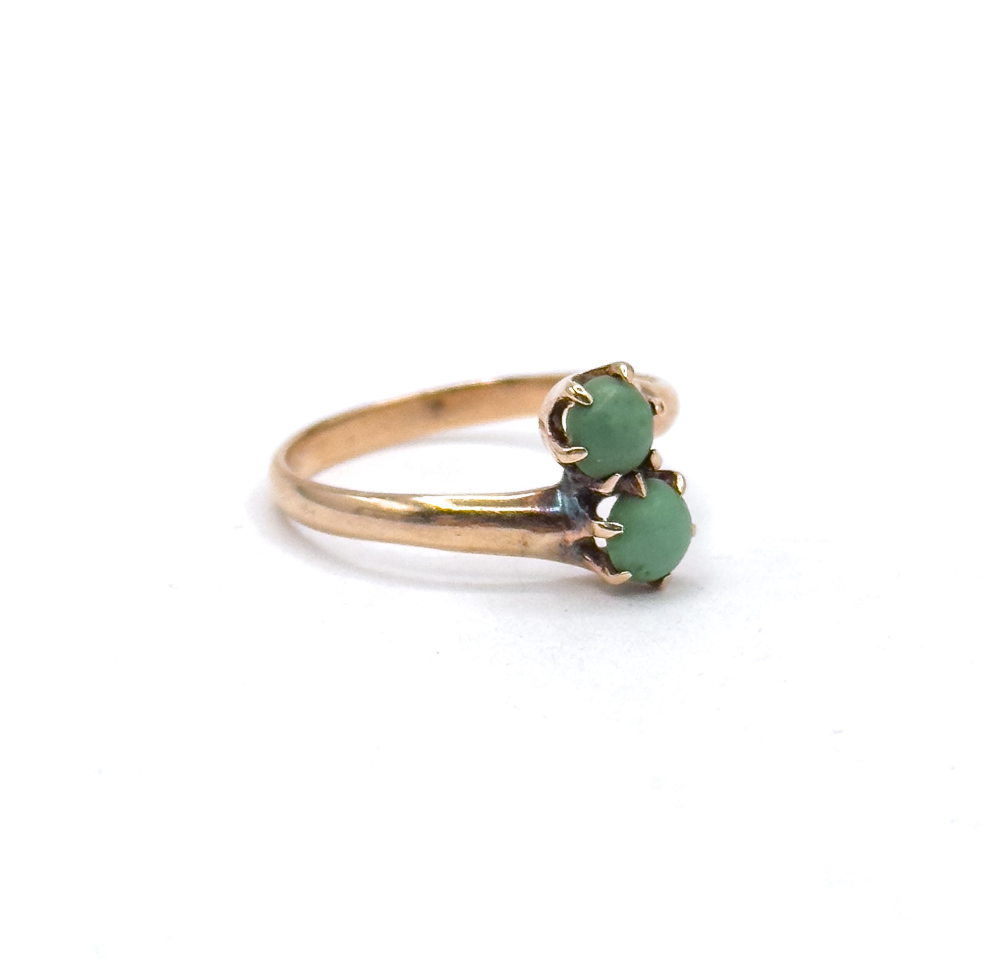 A petite Victorian moi et toi ring featuring two small turquoise cabochons in an asymmetric bypass setting. The warm 14K rose gold and deeply colored greenish-blue stones give this antique piece a sweet, understated character—perfect for stacking or wearing as a symbolic two-stone ring. The gold has a rich, time earned patina.