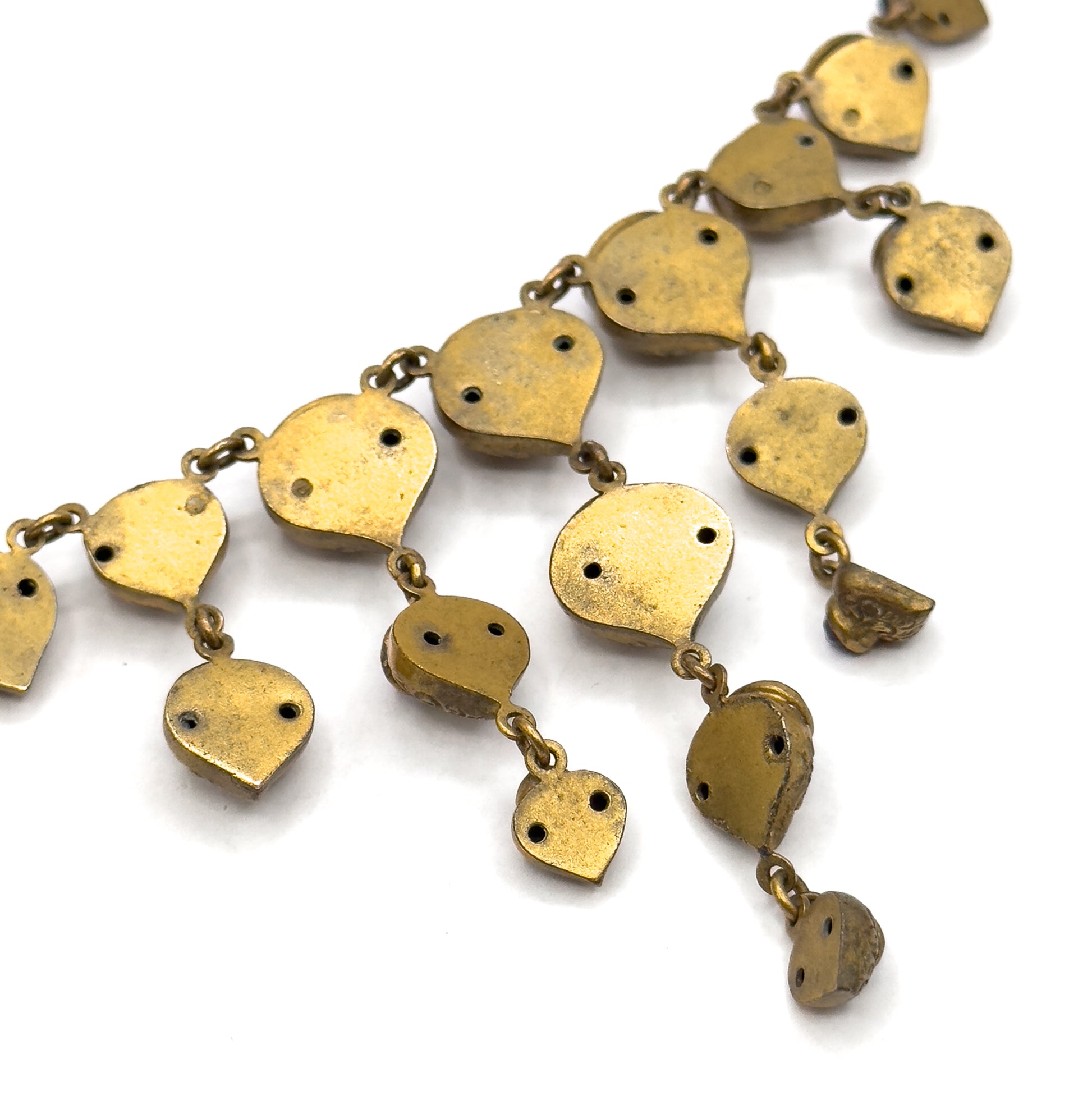 The Art Nouveau jewelry style emphasized natural motifs—vines, flowers, and curvilinear lines—often paired with colored glass and paste stones rather than precious gems. This piece has a very Czech look to it, however it is unsigned. This rare antique necklace will be a standout in any vintage costume jewelry collection.