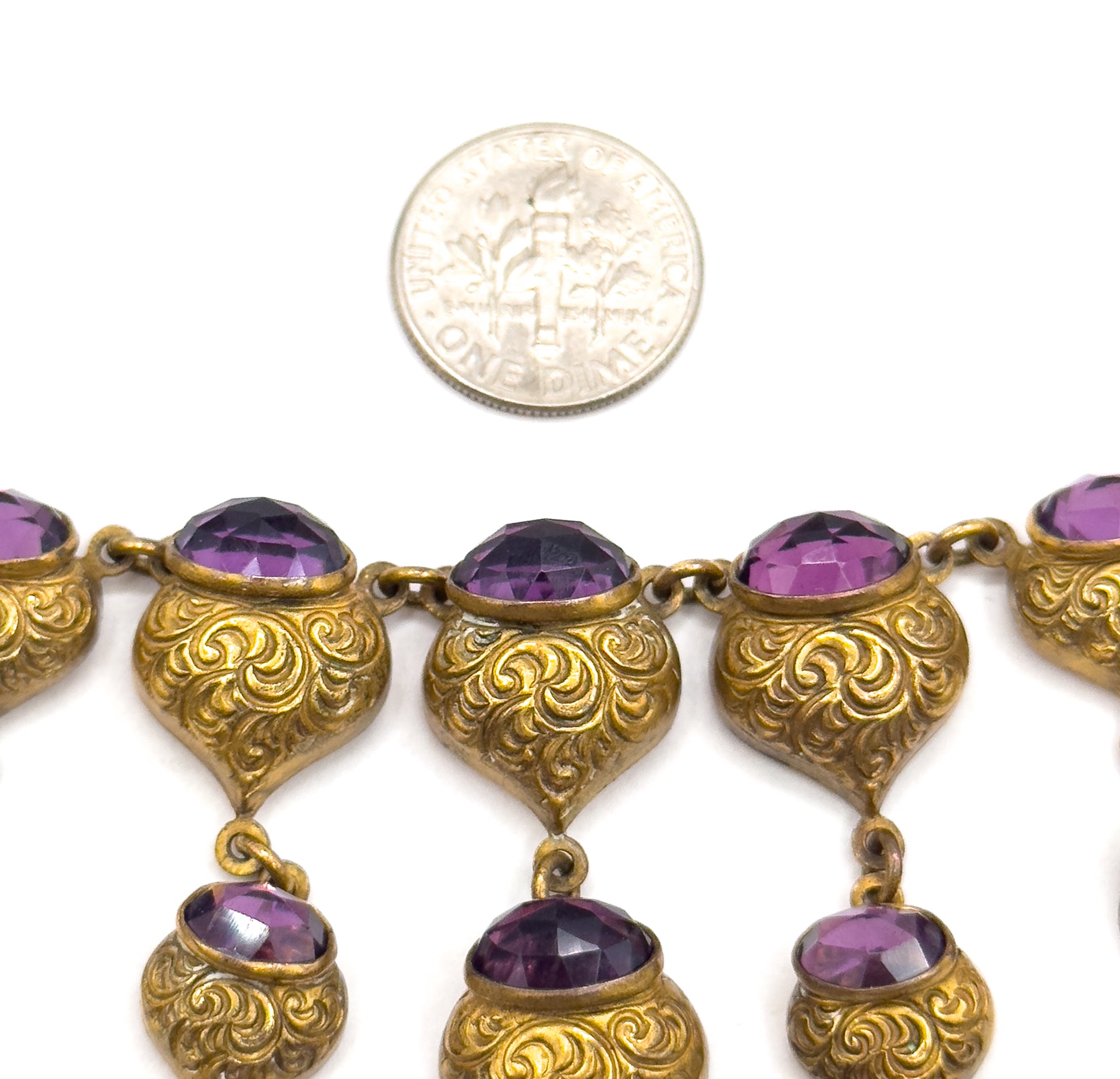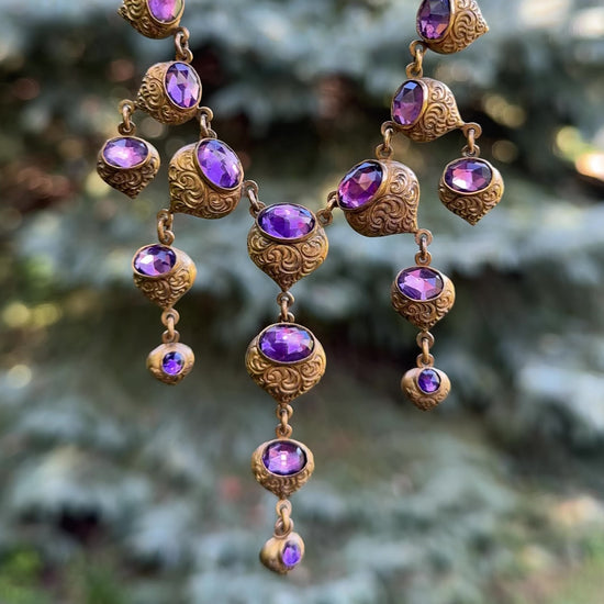 A rare and remarkable antique festoon necklace featuring a playful fringe of acorn shaped drops, each with embossed foliate scrollwork and purple foiled-back paste stones in bezel settings. The hollow links and light construction allow the piece to drape beautifully across the collarbone, culminating in a 2.75-inch front drop. Crafted in brassy/gold tone metal with a floral-engraved box clasp, this turn-of-the-century treasure captures the romantic fluidity and organic forms that defined Art Nouveau design.