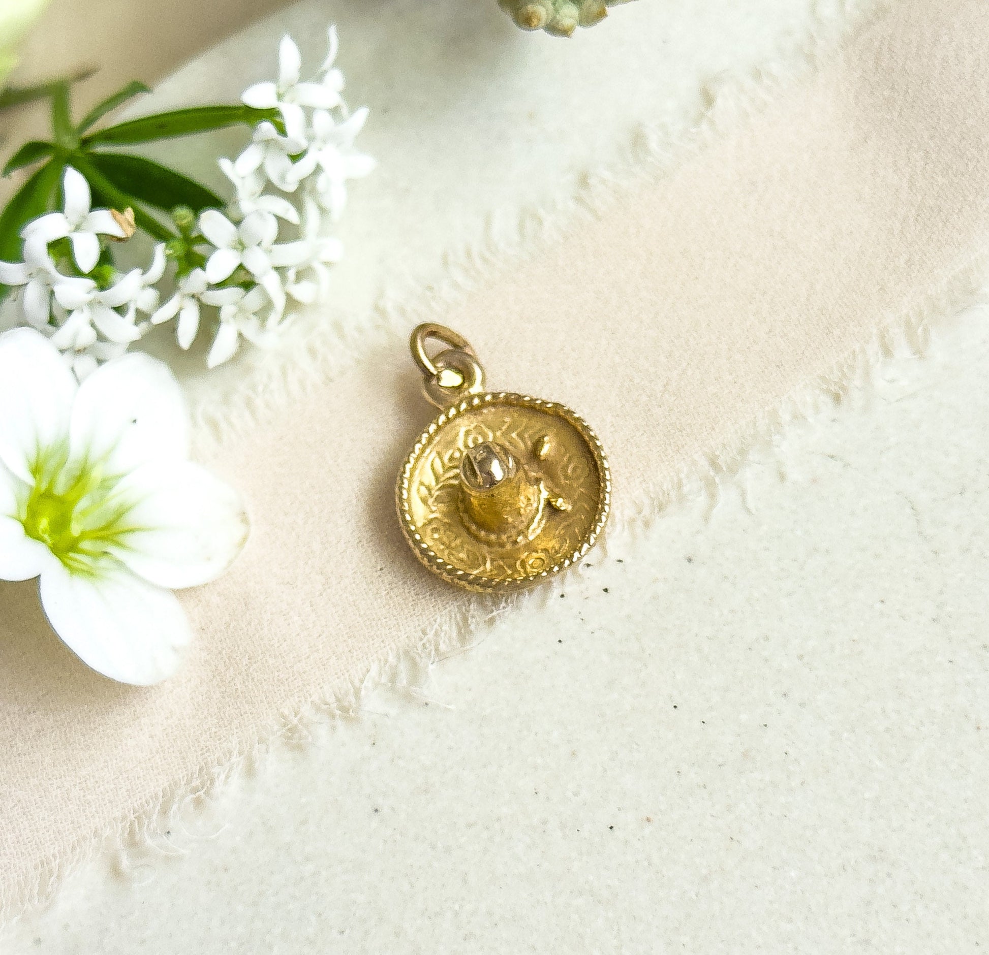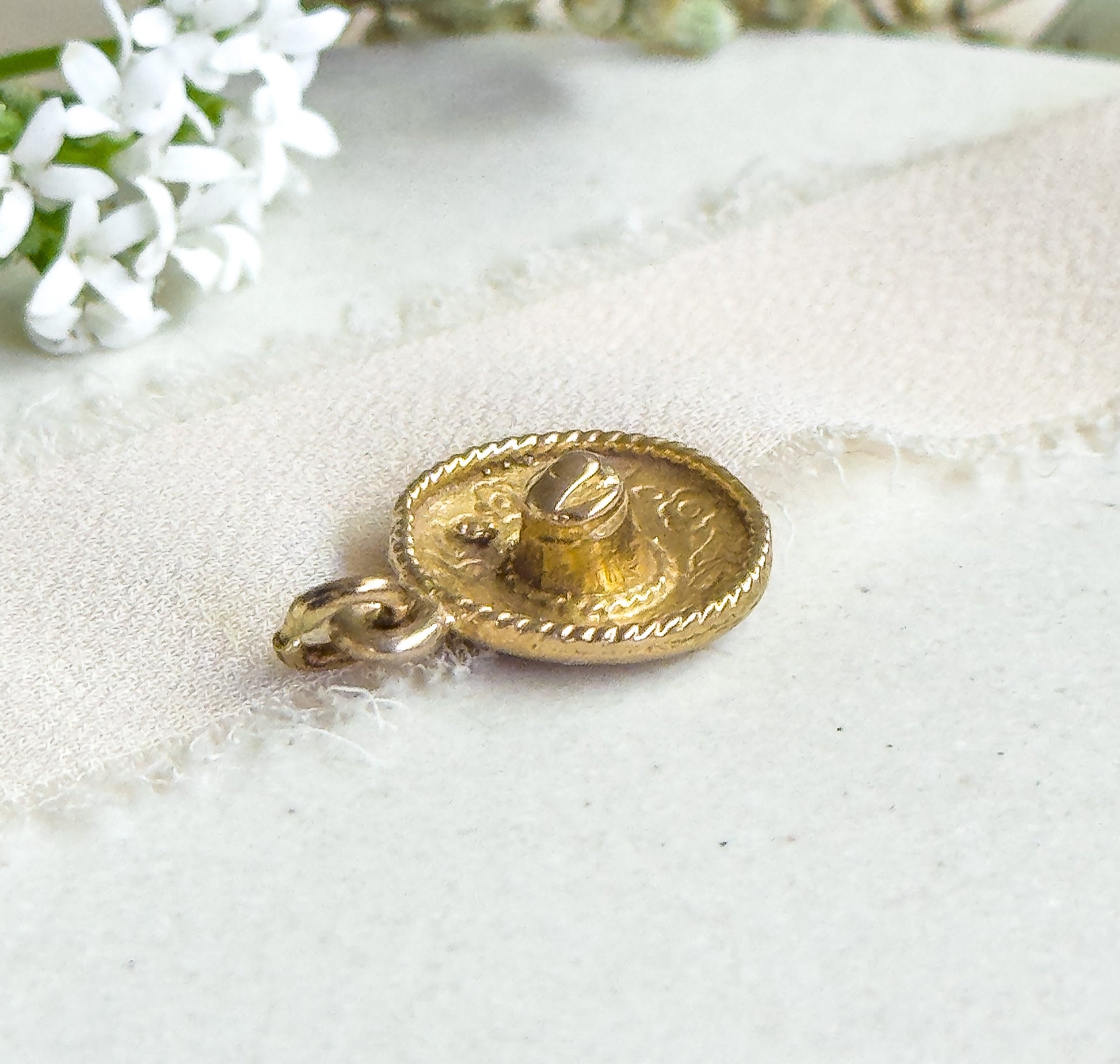 Here is the most darling vintage Sombrero charm in 10K Yellow Gold. This little charm is about a half inch and would look so sweet worn on a delicate chain or added to a charm bracelet. The gold is nice and buttery with cute details. This charm is ready to wear, collect, or gift to someone special!
