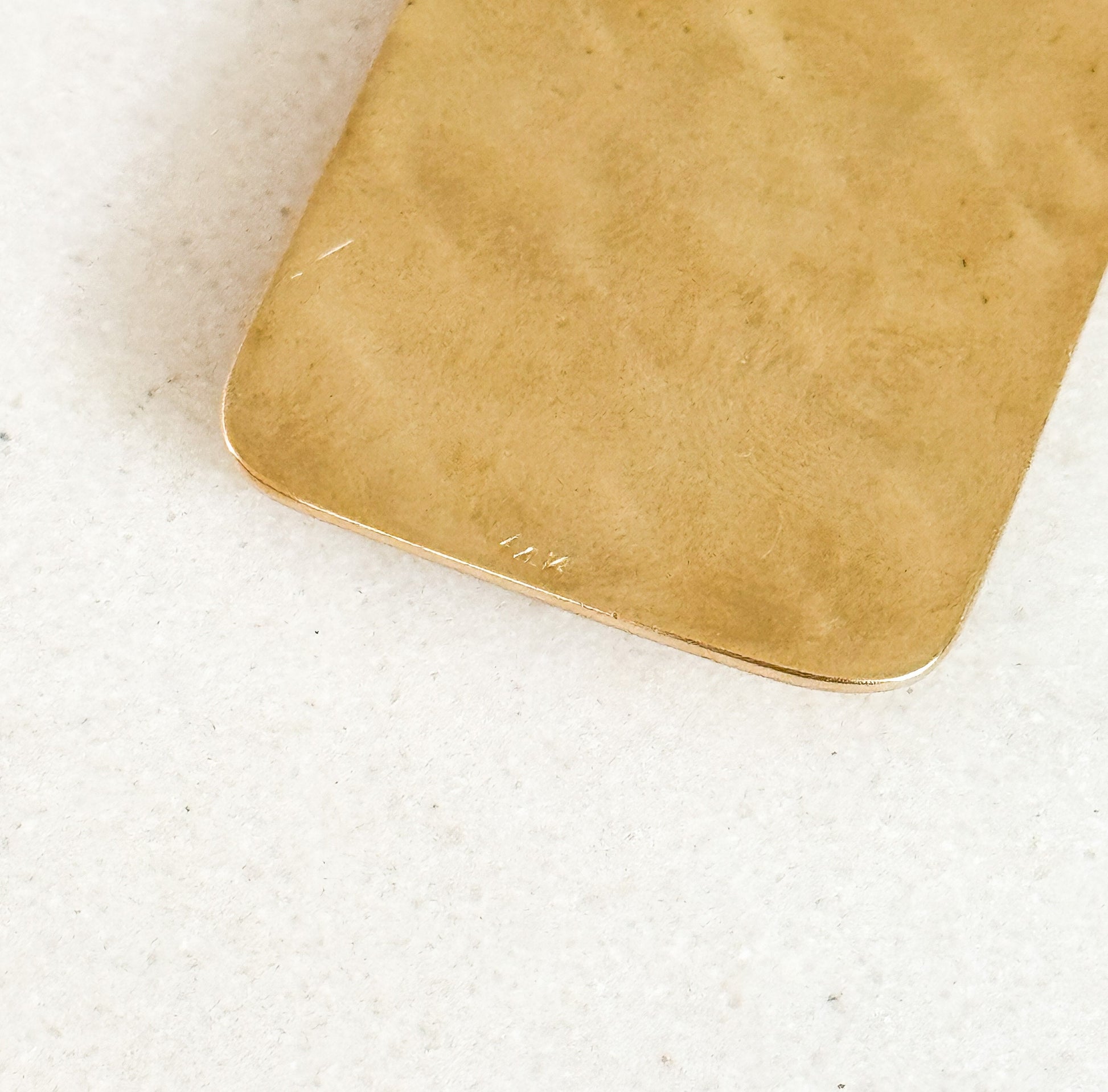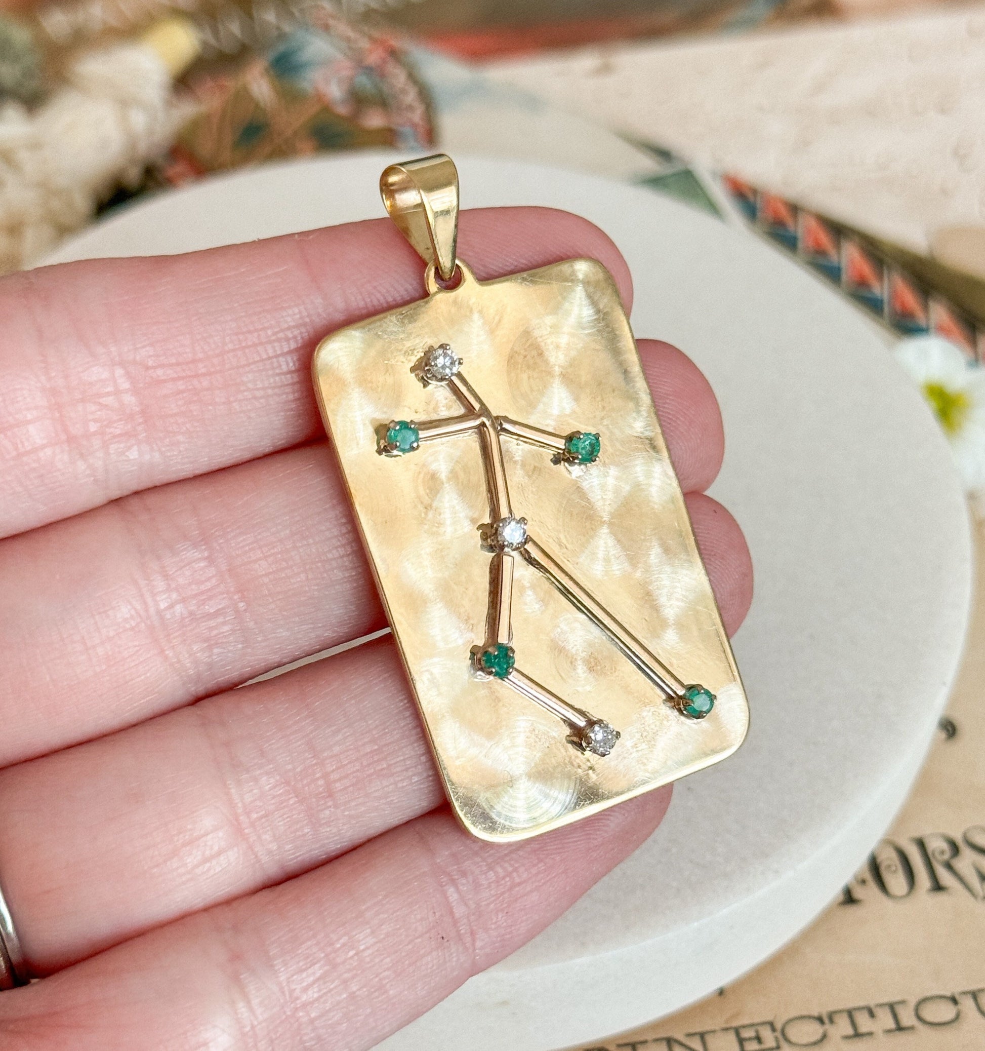 Here is a super cool and unique vintage dog tag style pendant with a mysterious constellation fashioned form Diamonds and Emeralds. This truly one-of-a-kind pendant has a wonderful hand detailed texture that is best seen in the video. This celestial design features a human-like form stamped for 14K gold purity, and the color is bright and buttery! This fantastic vintage solid gold pendant is ready to wear, gift, or collect!