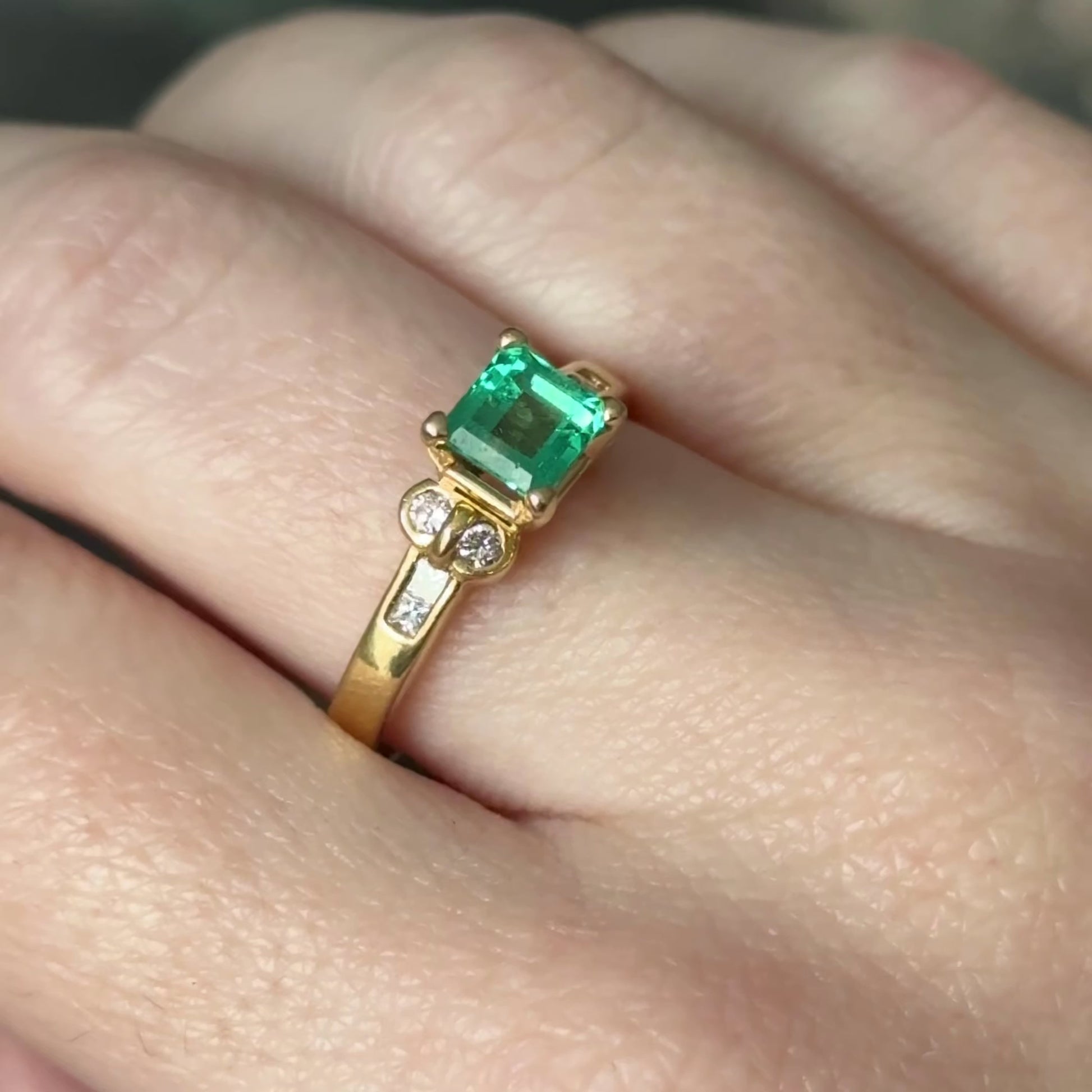 A step-cut emerald set east-west anchors this ring, its bright bluish-green color is captivating against the 18k gold. The emerald sits in a basket setting, flanked by princess and round brilliant diamonds in near-colorless, VS quality — the mixed diamond cuts creating playful interest alongside the emerald's clean rectangular lines. The 18 karat yellow gold has a polished surface that pairs nicely with the the cool green of the center stone.
