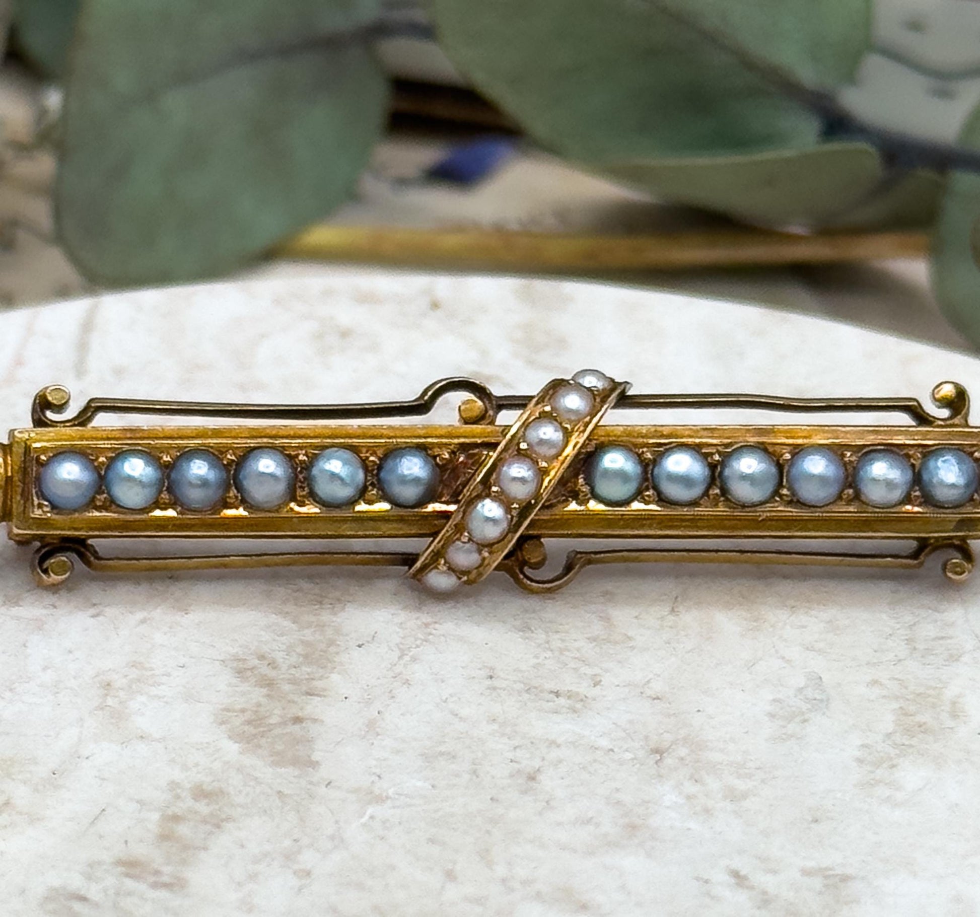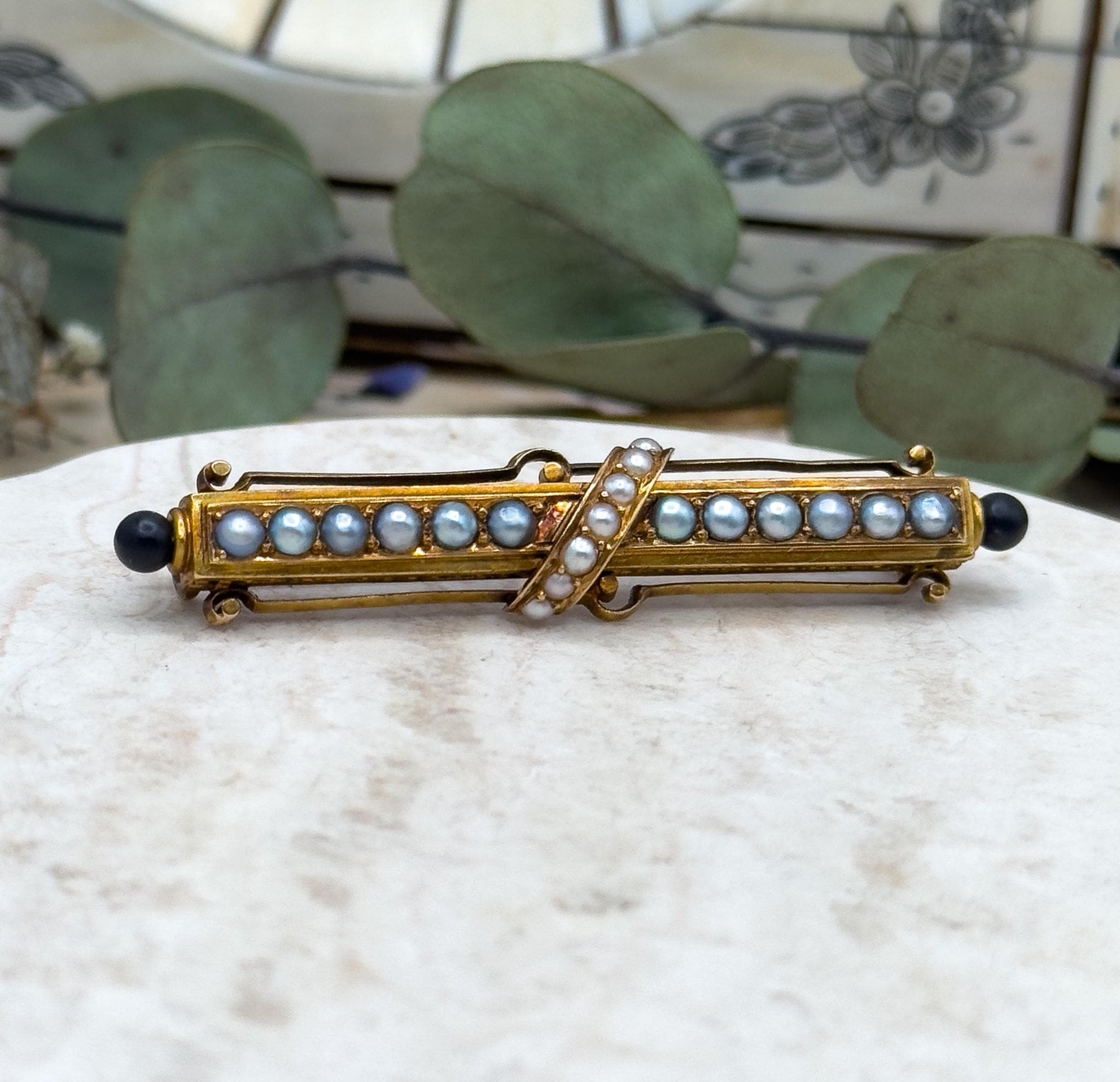 A beautiful antique Victorian bar brooch crafted in 14K yellow gold, richly patinated with a warm golden hue. The brooch features a diagonal row of seven creamy seed pearls and a horizontal row of twelve silvery pearls, all beautifully matched for luster and tone. Enamel ball finials finish each end, adding an elegant detail and a nod to Victorian aesthetics. The brooch is secured with a sturdy tube hinge and C-catch that functions perfectly. A refined and collectible Victorian jewel.