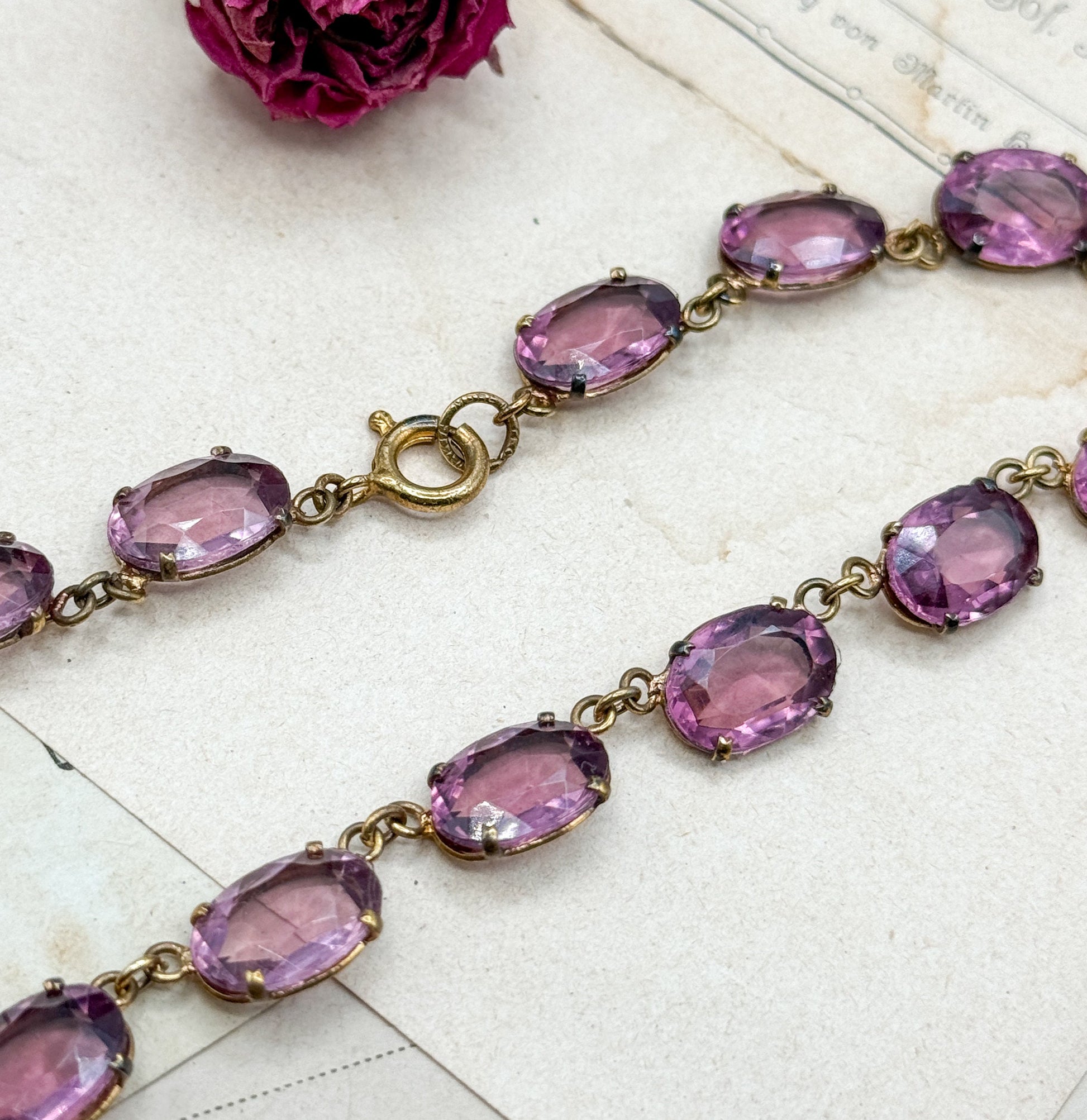 Here is a stunning antique Amethyst paste glass rivière necklace in a beautiful shade of amethyst purple. This beautiful turn of the century piece features rich purple faceted glass gems from Czechoslovakia. The gems are set in open-back gold-tone settings, causing the light to shine through - allowing them to glitter on the neckline. This beautiful antique necklace is an absolute treasure that is ready to wear, collect, or gift to someone special.