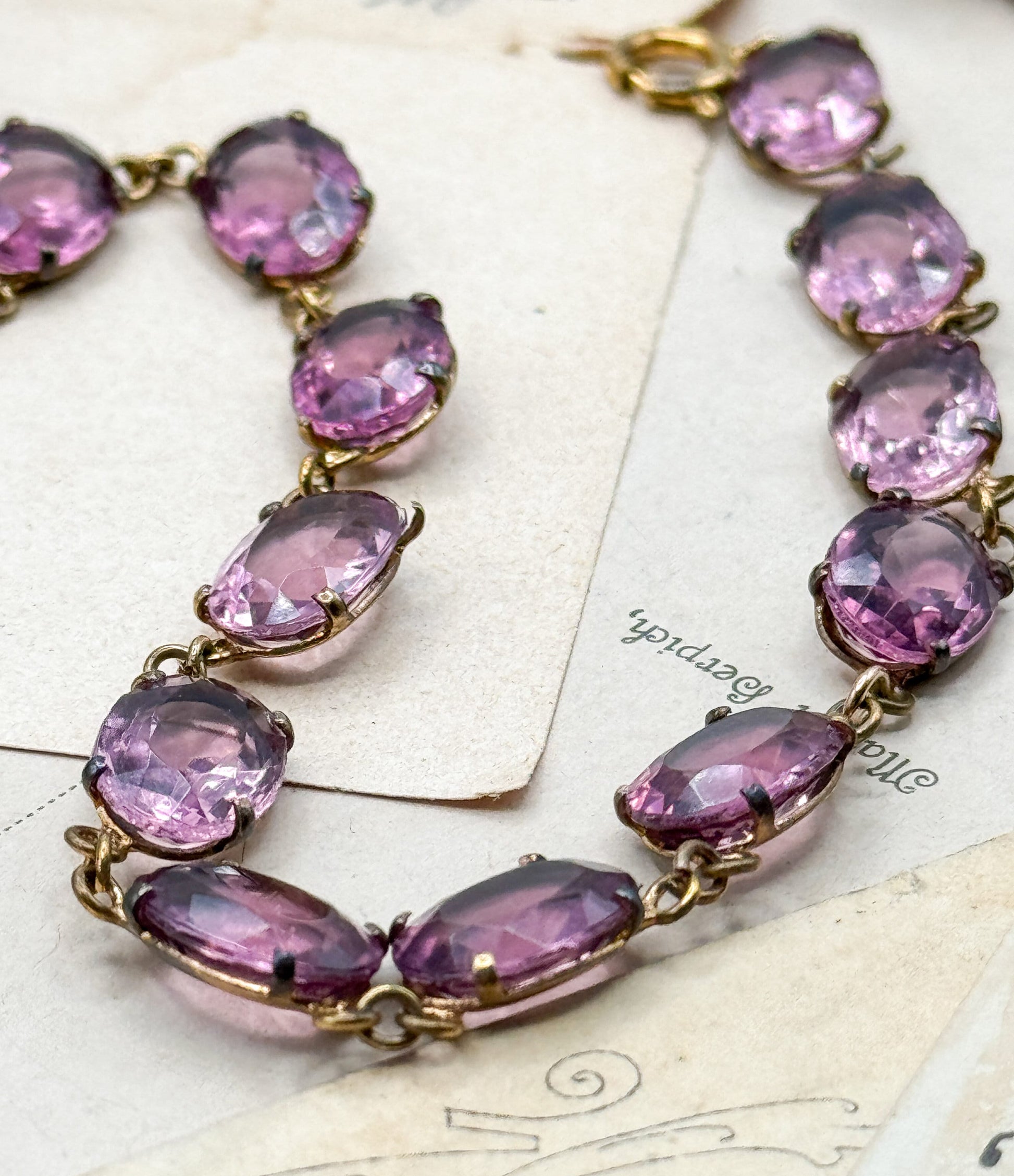 CONDITION This antique necklace does have some mild age-related wear expected from a piece over 100 years old. There is some wear/tarnish to the gold-tone metal on the reverse of the necklace, but it is not visible during wear. A few of the gems have small (under 1mm) spots of age related wear. --- Our antique and vintage jewelry collection offers authentic vintage and antique pieces with rich histories. Each item is meticulously inspected by a professional jeweler, who provides detailed, transparent descriptions noting any signs of age-related character. We're committed to your complete satisfaction, offering additional images and answering any questions you may have.