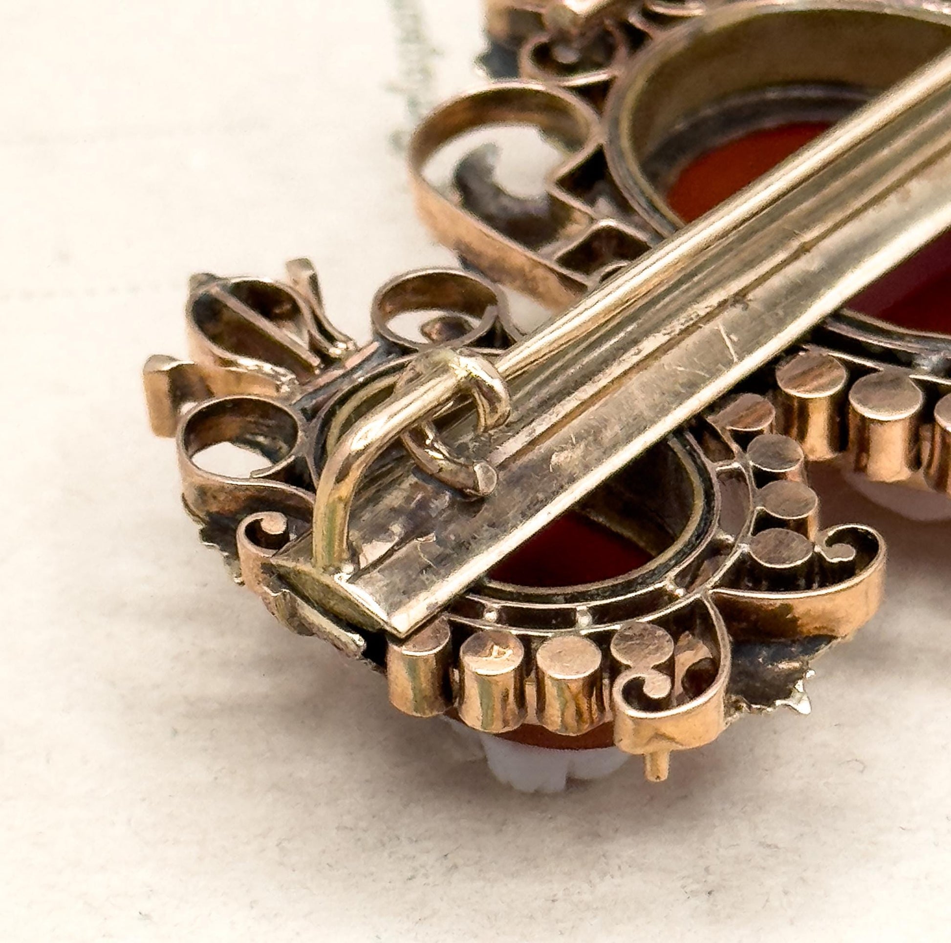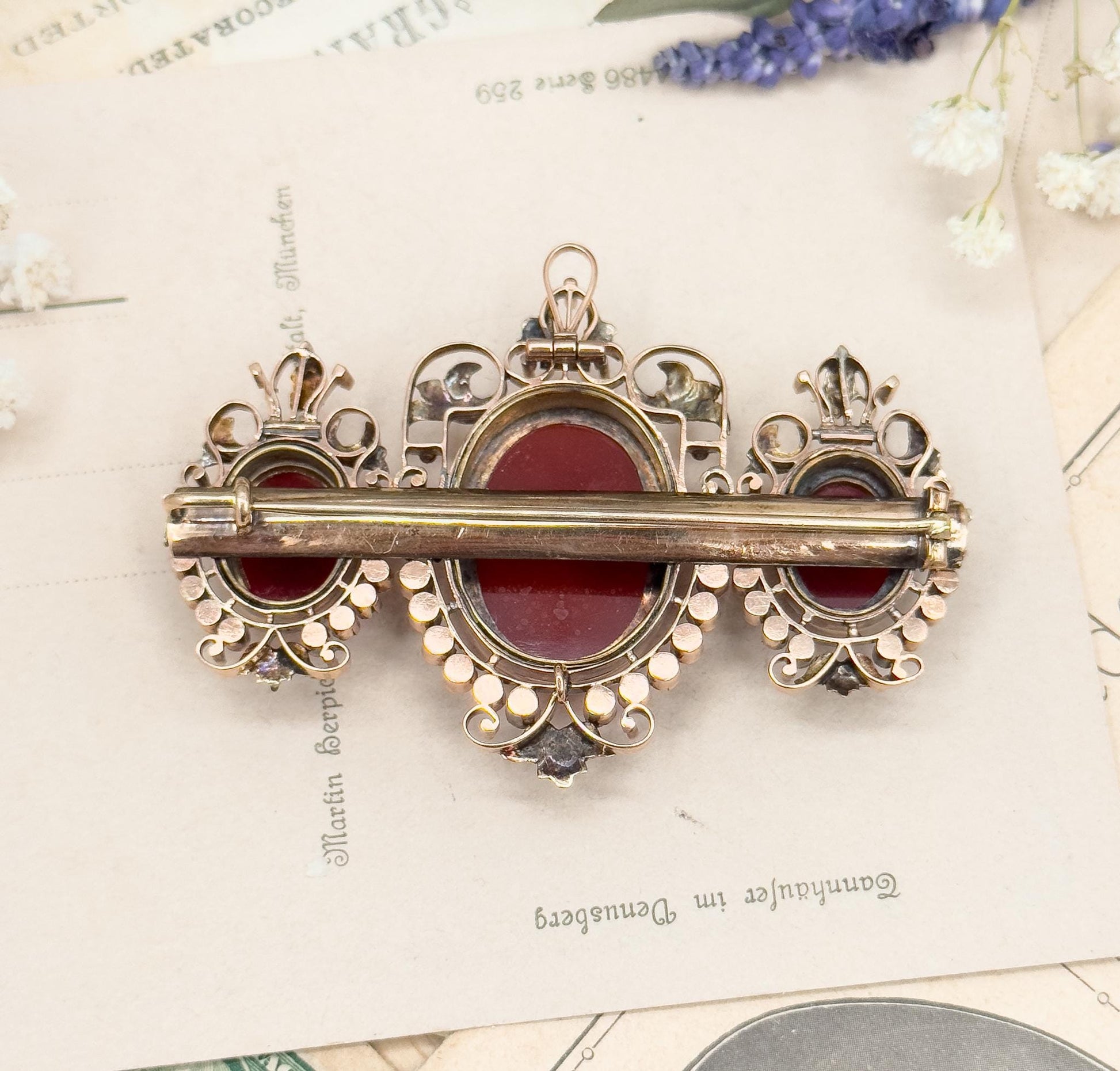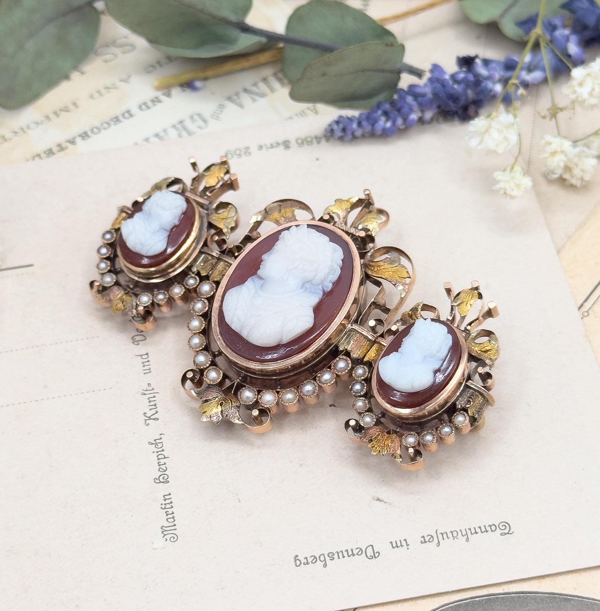 An exceptional antique Victorian brooch featuring three hand-carved hardstone cameos in rich reddish-orange tones. Each cameo is unique, finely detailed, and set in 124K gold with a warm rosy hue. The cameos portray woman in Elizabethan-style dress. The central cameo is flanked by two smaller cameos that may represent her daughters, creating a striking and symbolic composition. The cameos are framed with a half halo of luminous seed pearls in excellent condition, ranging from 2mm to 1.25mm, and delicate gold leaf and scroll motifs. This impressive piece can be worn as either a brooch or pendant, thanks to its secure C-catch clasp and hidden bale. This beautiful piece is ready to wear or collect.