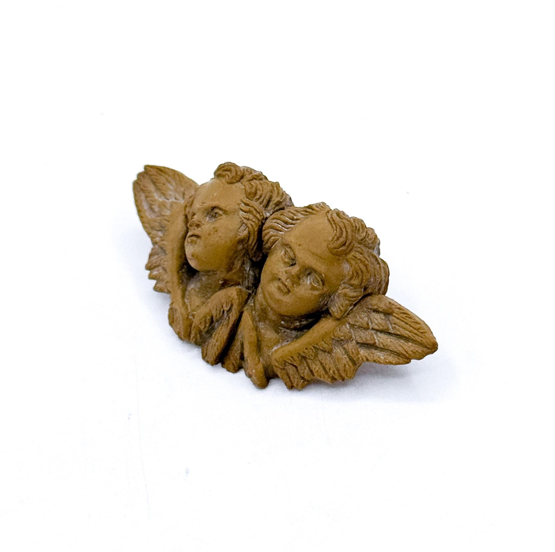 This Victorian lava cameo brooch depicts a pair of cherubs with finely carved faces and feathered wings, cut from warm brownish-khaki hued lava stone. Likely acquired as a Grand Tour souvenir in the 19th century, it is mounted to a secure base metal pin and measures 40mm x 19.5mm (about 1.5 inches wide). At 6.5 grams, it is light to wear yet detailed in its carving. This is a lovely example of sentimental Victorian cherub jewelry.