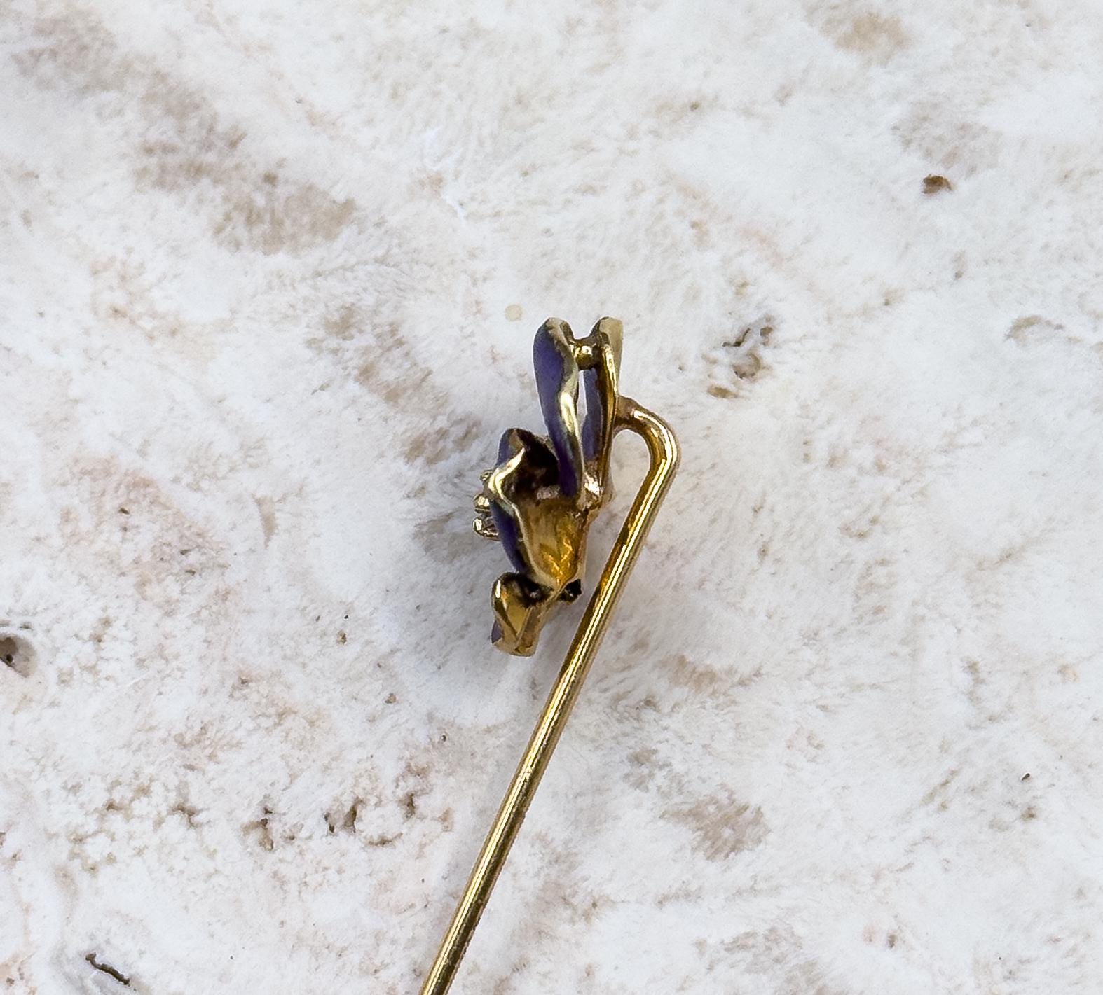 Here is a lovely antique flower stick pin in the form of a purple pansy. This pin is beautifully crafted from 14K yellow gold and features a .035ct Diamond at its heart. The pansy is hand-painted in enamel in a shade of deep purple. The petals have a beautiful organic shape. The pansy was often gifted by the Victorians as a sweetheart token, meaning "Think of me." The pin is stamped for 14K and signed. The stopper at the end of the pin is not gold. This stunning and highly collectible pansy stick pin will make an excellent addition to any fine antique jewelry collection.
