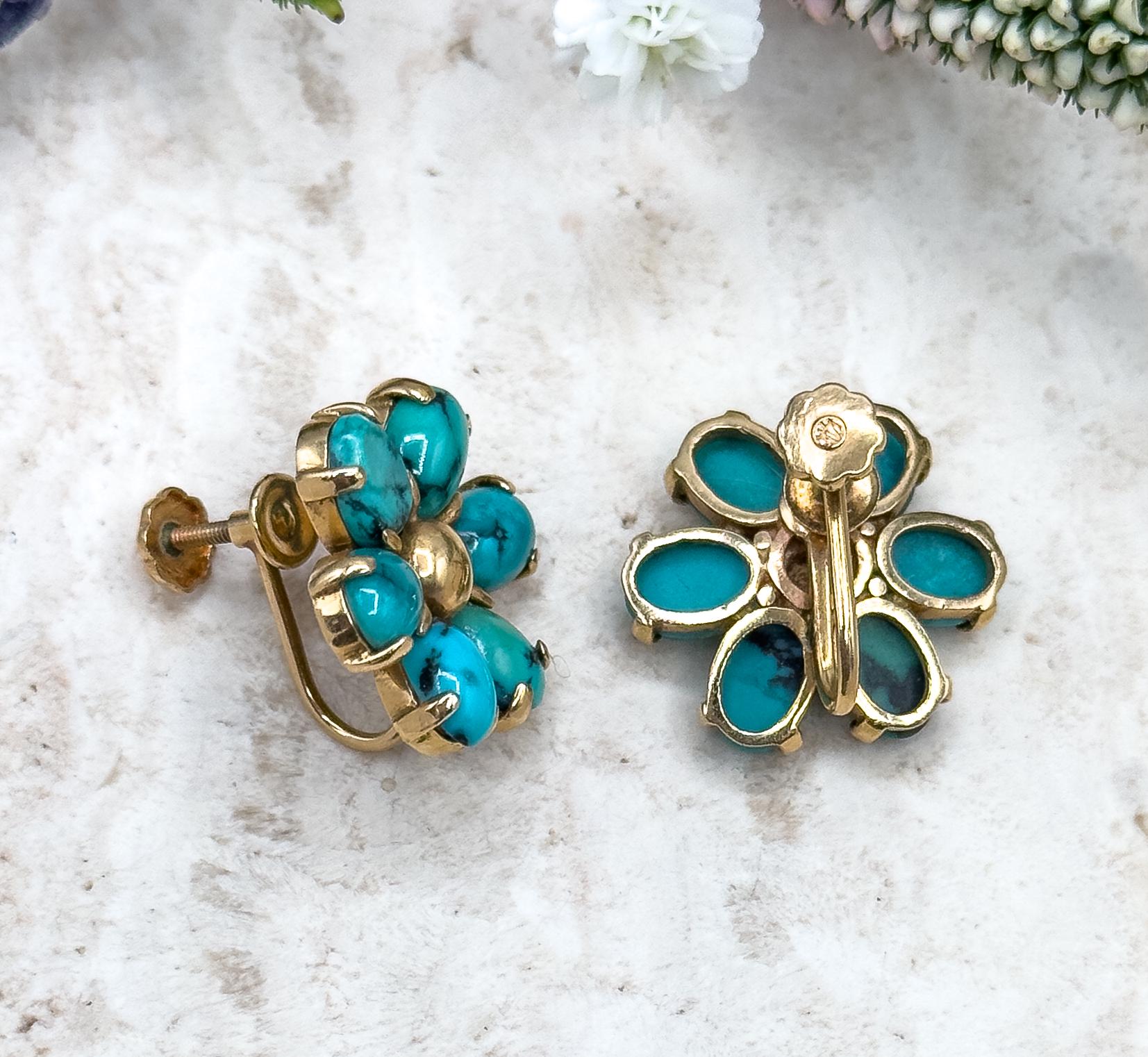 This charming midcentury set is a rare find—a beautifully crafted 14K gold floral brooch paired with matching screw-back earrings, each set with vivid turquoise cabochons. The brooch features a six-petal cabochon turquoise flower design with a florentine-textured finish on the leaves, adding depth and dimension. The turquoise stones are bright and smooth with a captivating matrix, offering the perfect contrast to the warm gold tone of the metal. The matching earrings mirror the floral motif and are fitted with secure vintage screw-back closures. These can be converted to posts for a fee if desired. A lovely statement set from a bygone era, perfect for collectors of fine estate jewelry or turquoise lovers alike. This amazing set will be at home in any fine jewelry collection.