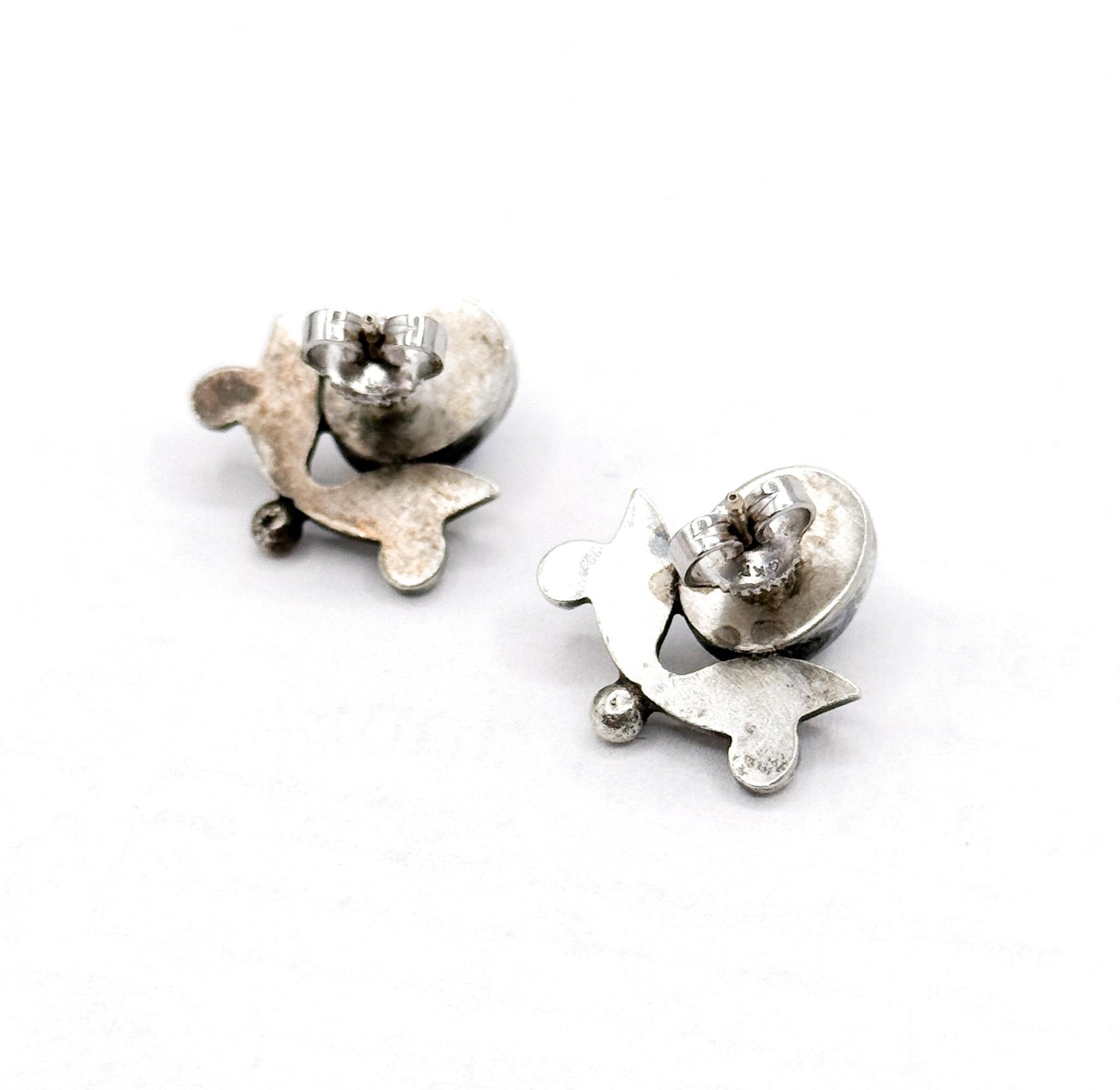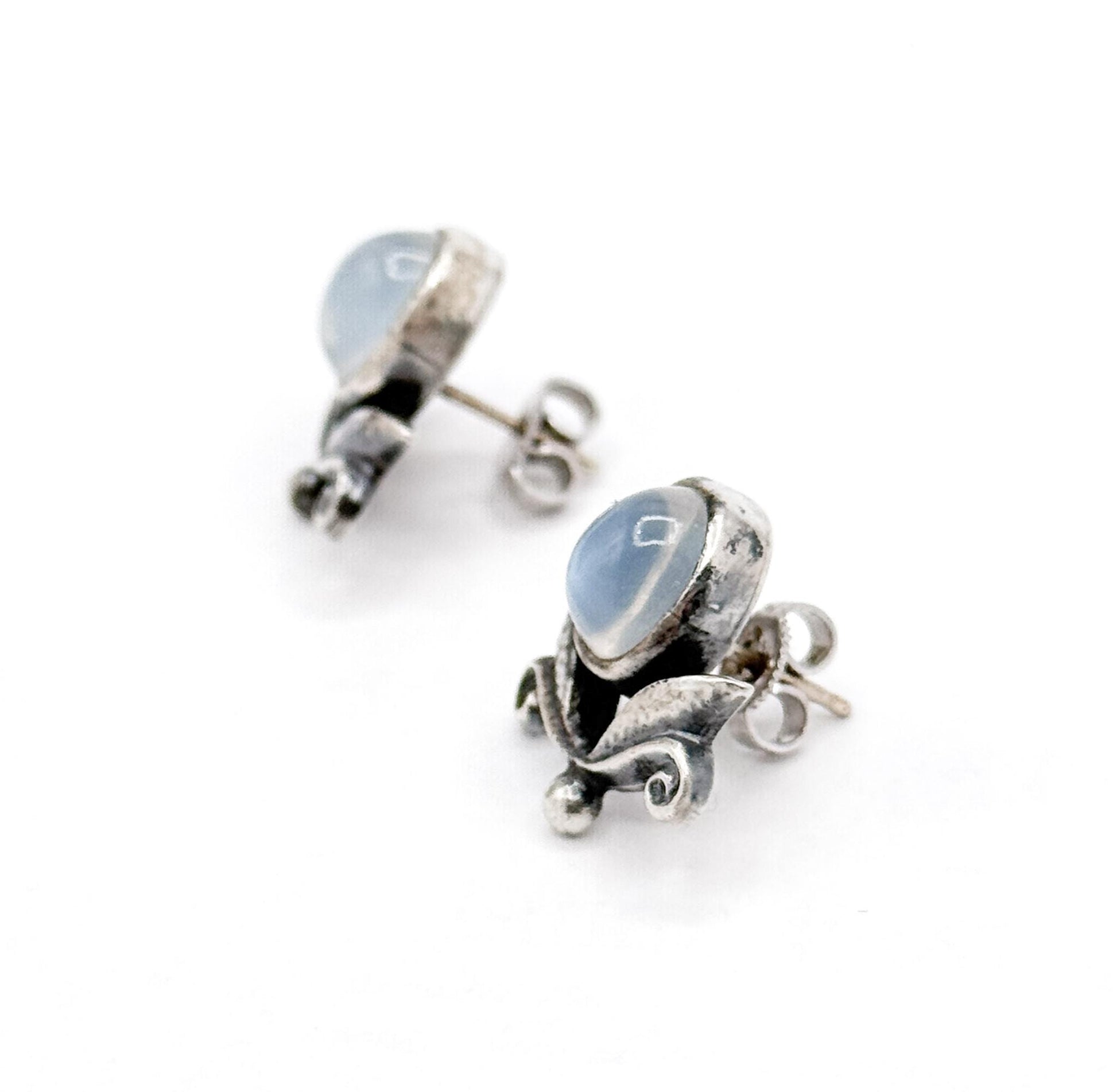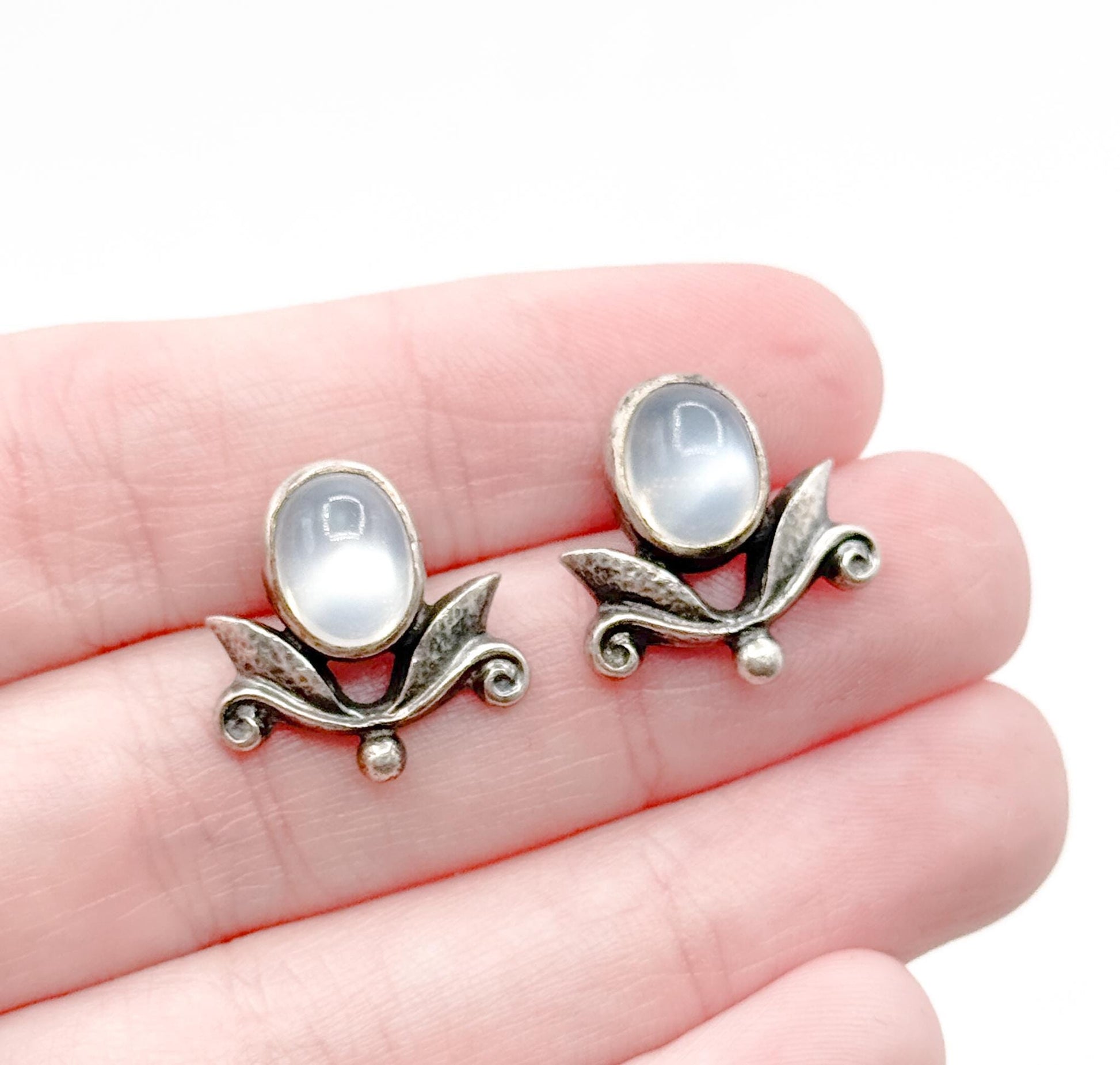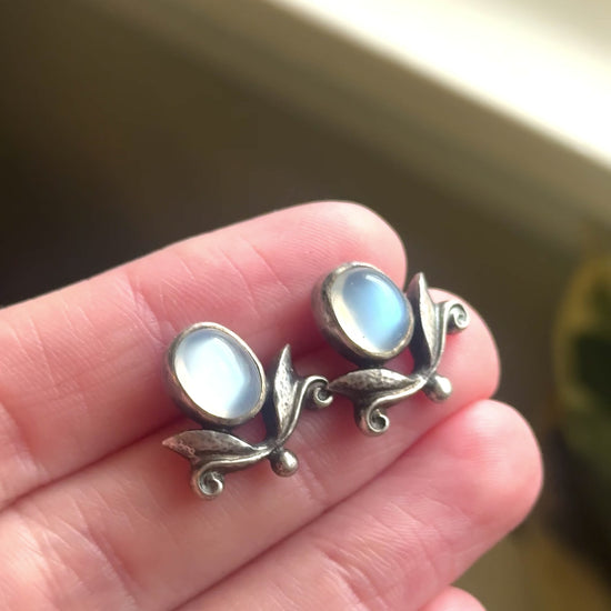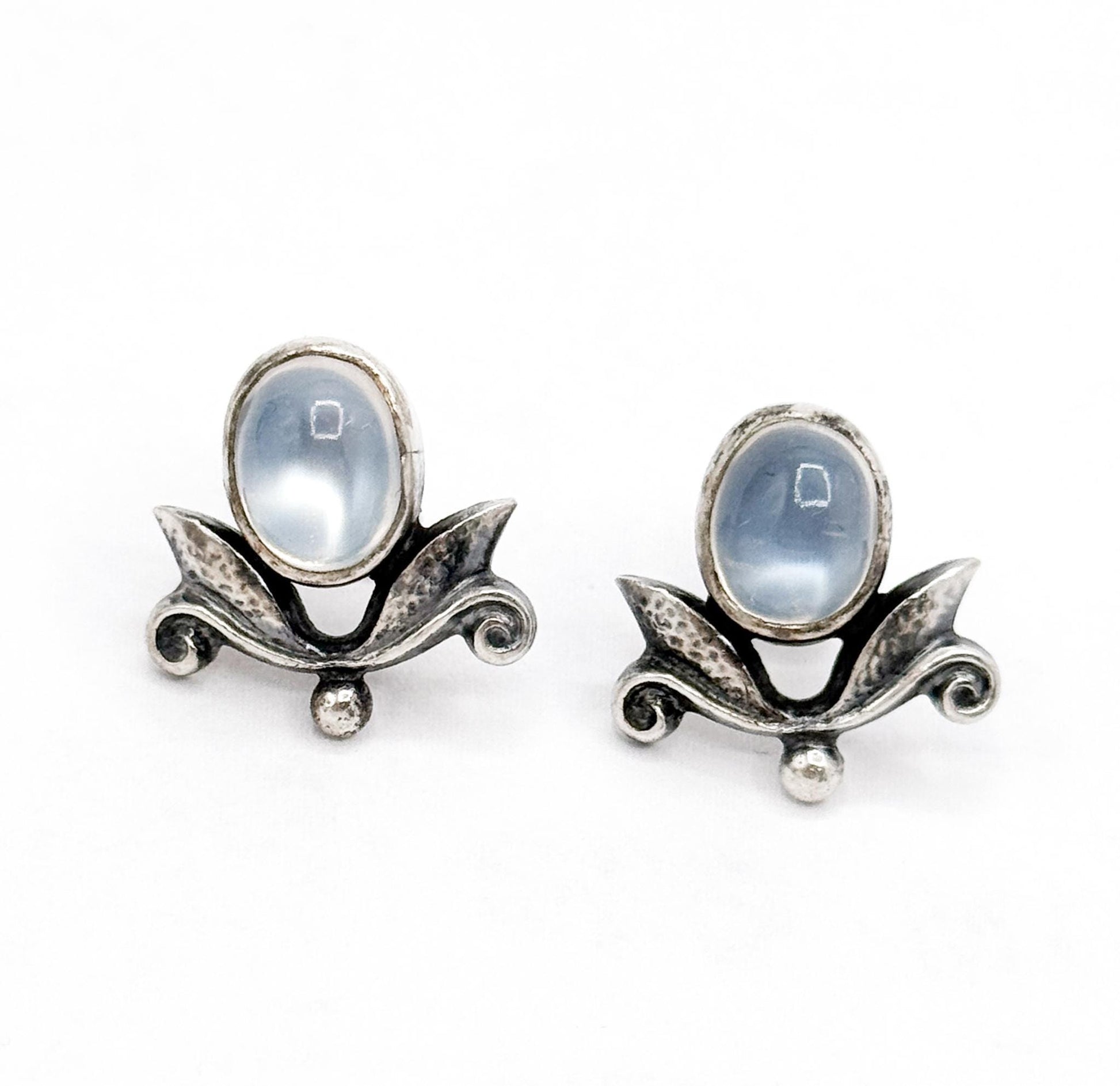 Vintage Art Nouveau Moonstone Stud Earrings: Silver Foliate Floral Design