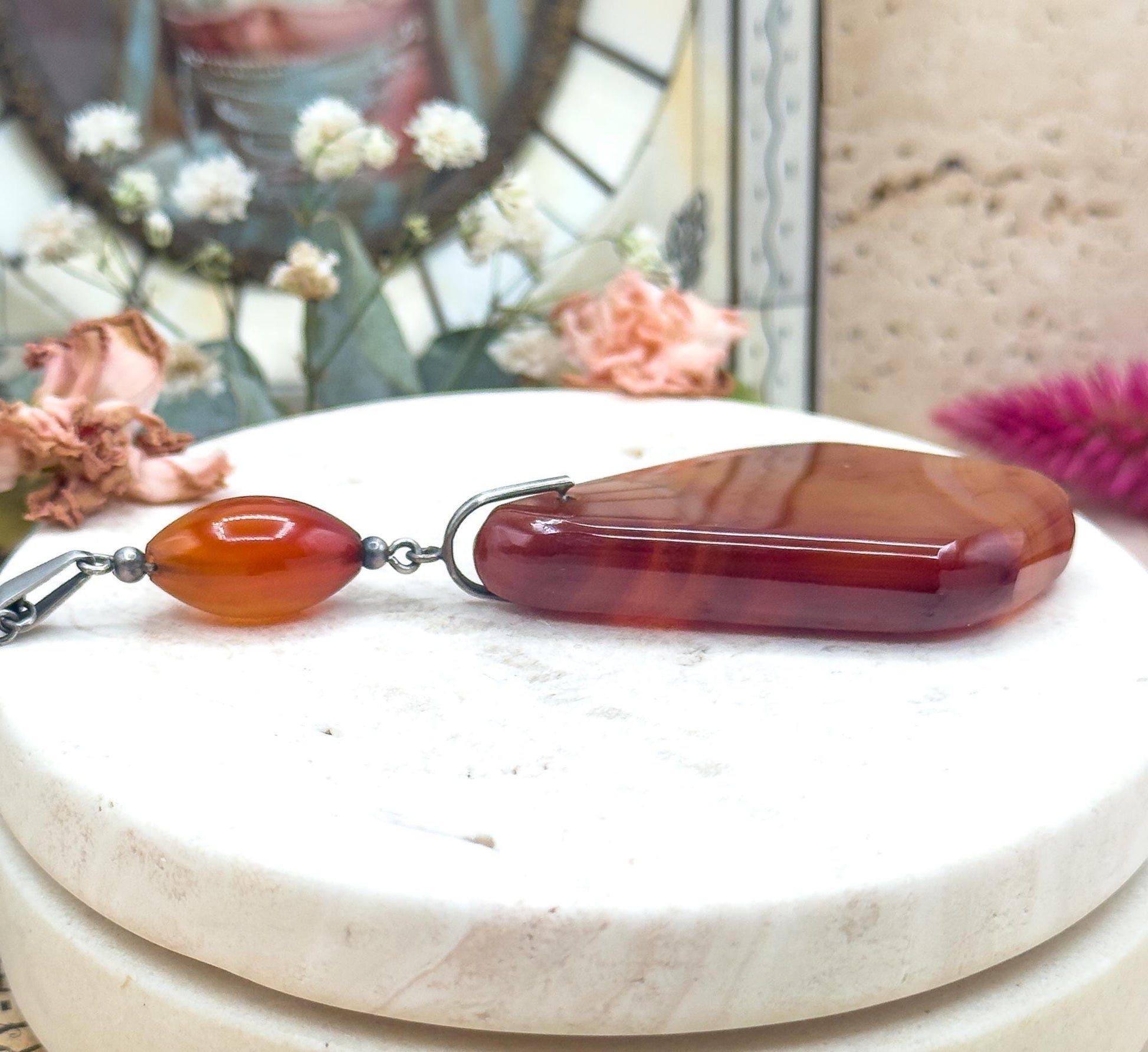 A stunning vintage necklace featuring a freeform banded red agate pendant, handcrafted in sterling silver. This unique piece showcases the organic beauty of natural striated agate, with its rich layers of warm reddish orange hues and subtle translucence. The larger agate pendant measures approximately 2 inches tall by 1.2 inches wide, complemented by a smaller matching bead measuring 18mm by 10mm. Strung on an 18-inch sterling silver chain, the silver boasts a lovely patina that enhances its vintage charm and character. Weighing 32.1 grams, this necklace makes a bold yet elegant statement, perfect for anyone who loves natural gemstones and distinctive, artisanal jewelry.