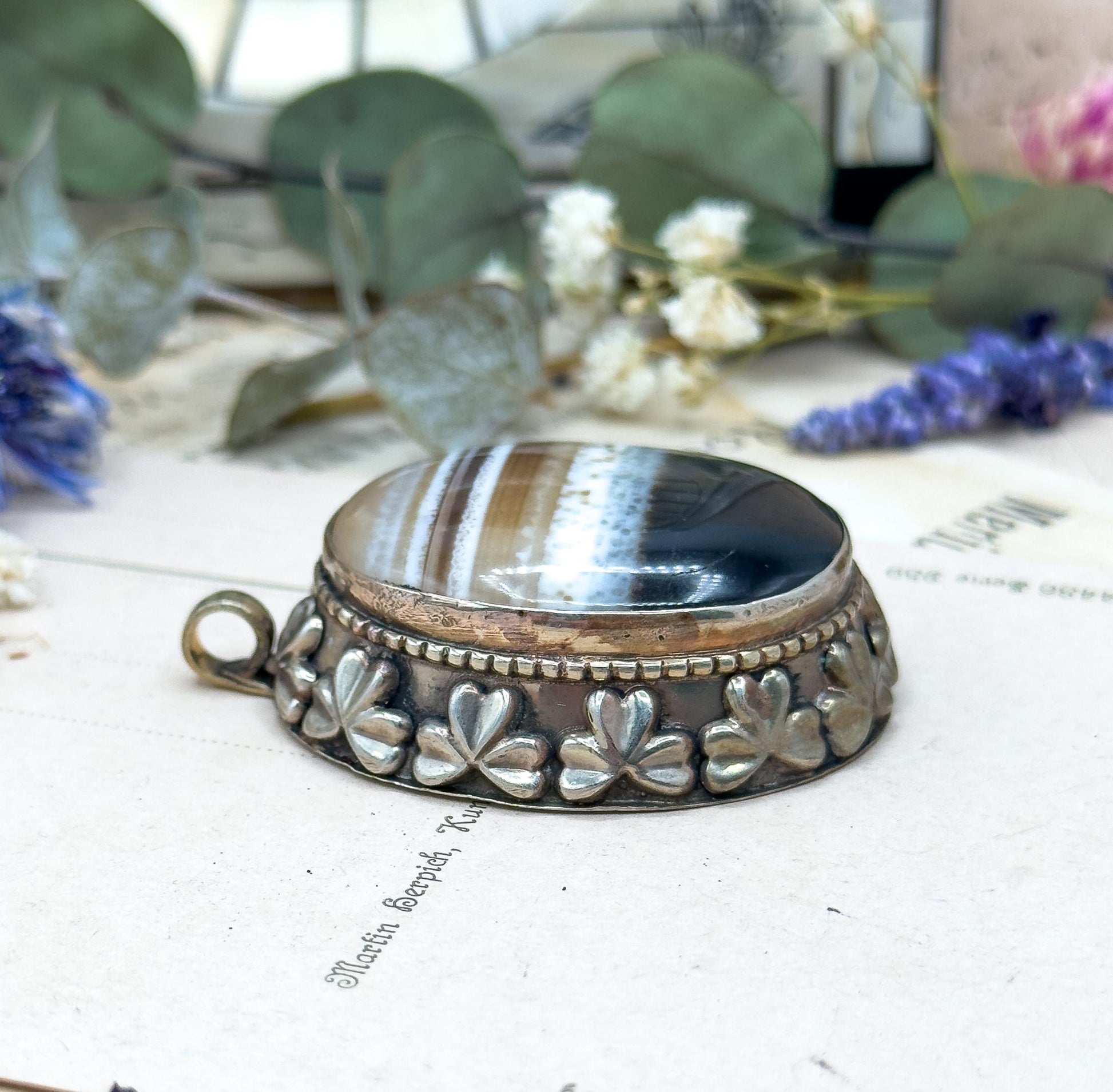 Vintage Banded Agate Shamrock Pendant Necklace: Handmade Silver Tone