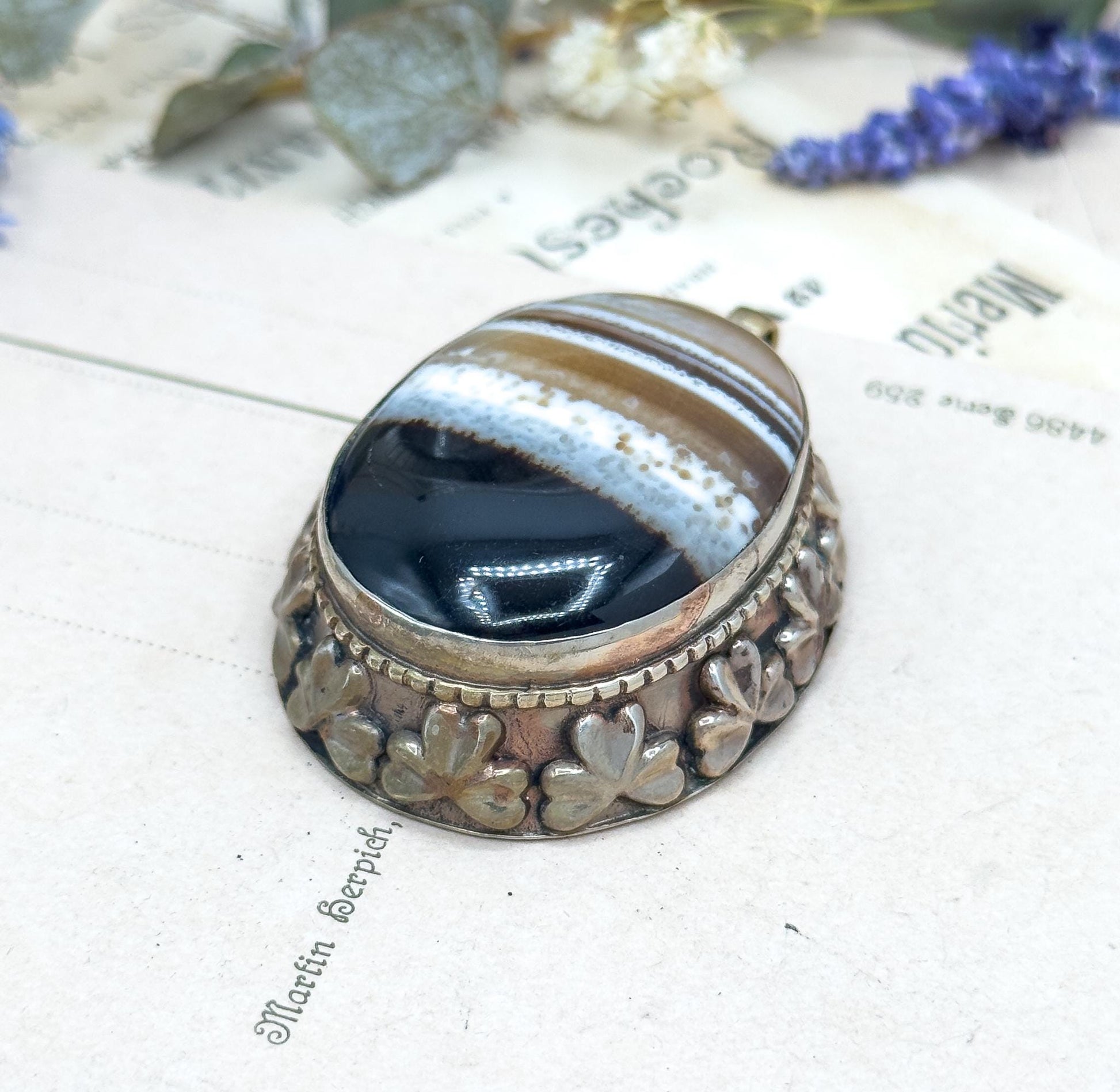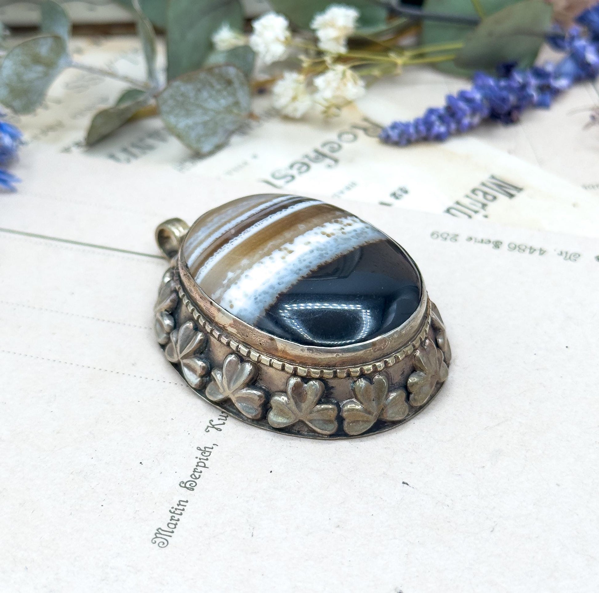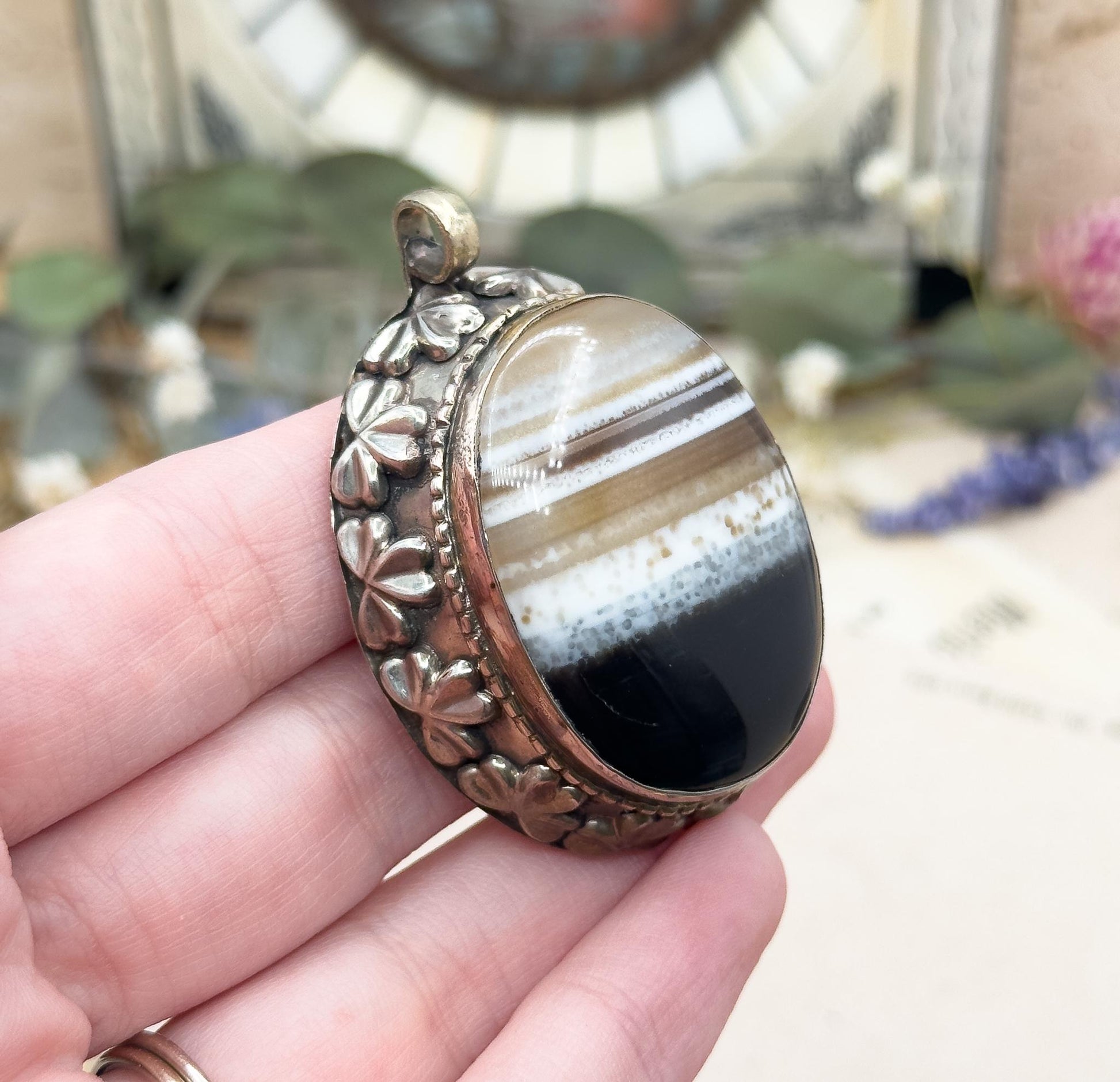 A striking vintage handmade pendant featuring a large banded agate cabochon with bold natural striping in earthy browns, whites, and deep black. The chunky stone is bezel set in a handmade silver tone alloy, accented with a hand applied clover motif border. Substantial in weight and rich with character, this unusual piece makes a powerful statement as a pendant. This is a handmade older piece with lots of personality. The metal appears to be a silver allow but it does have some coppery oxidation in some areas. A very unique piece!