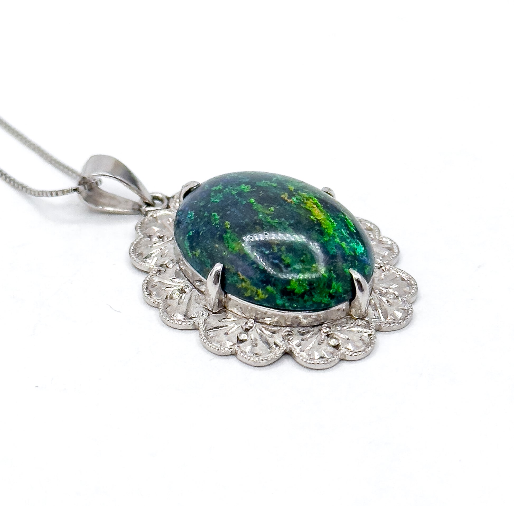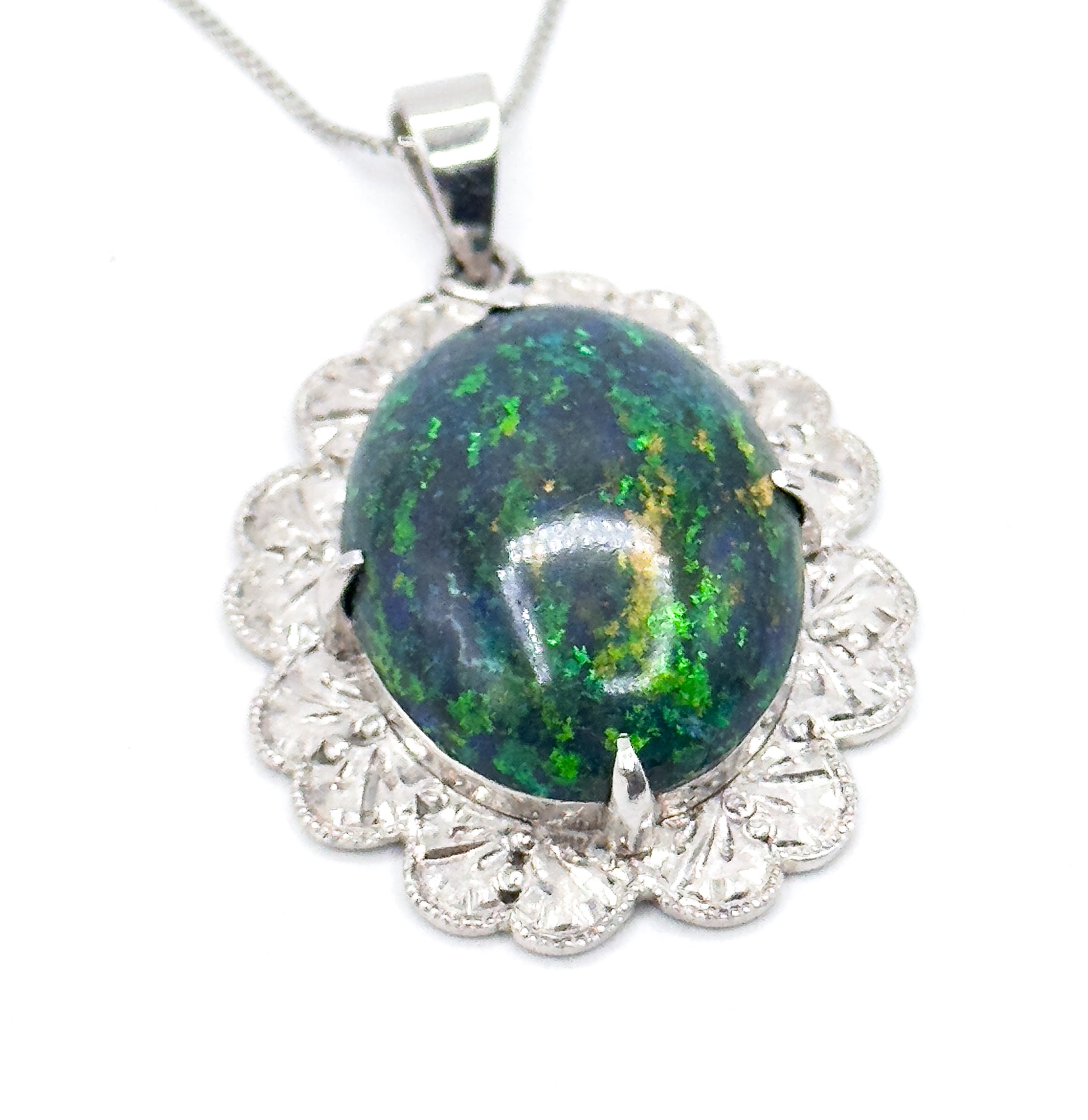 A striking late 20th-century platinum necklace showcasing a mesmerizing black opal cabochon with vivid green fire that dances across its deep dark body tone. The opal is elegantly framed and prong set in a finely detailed scalloped platinum setting and suspended from an adjustable box chain for versatile wear. This Opal is accompanied by a GIA report.